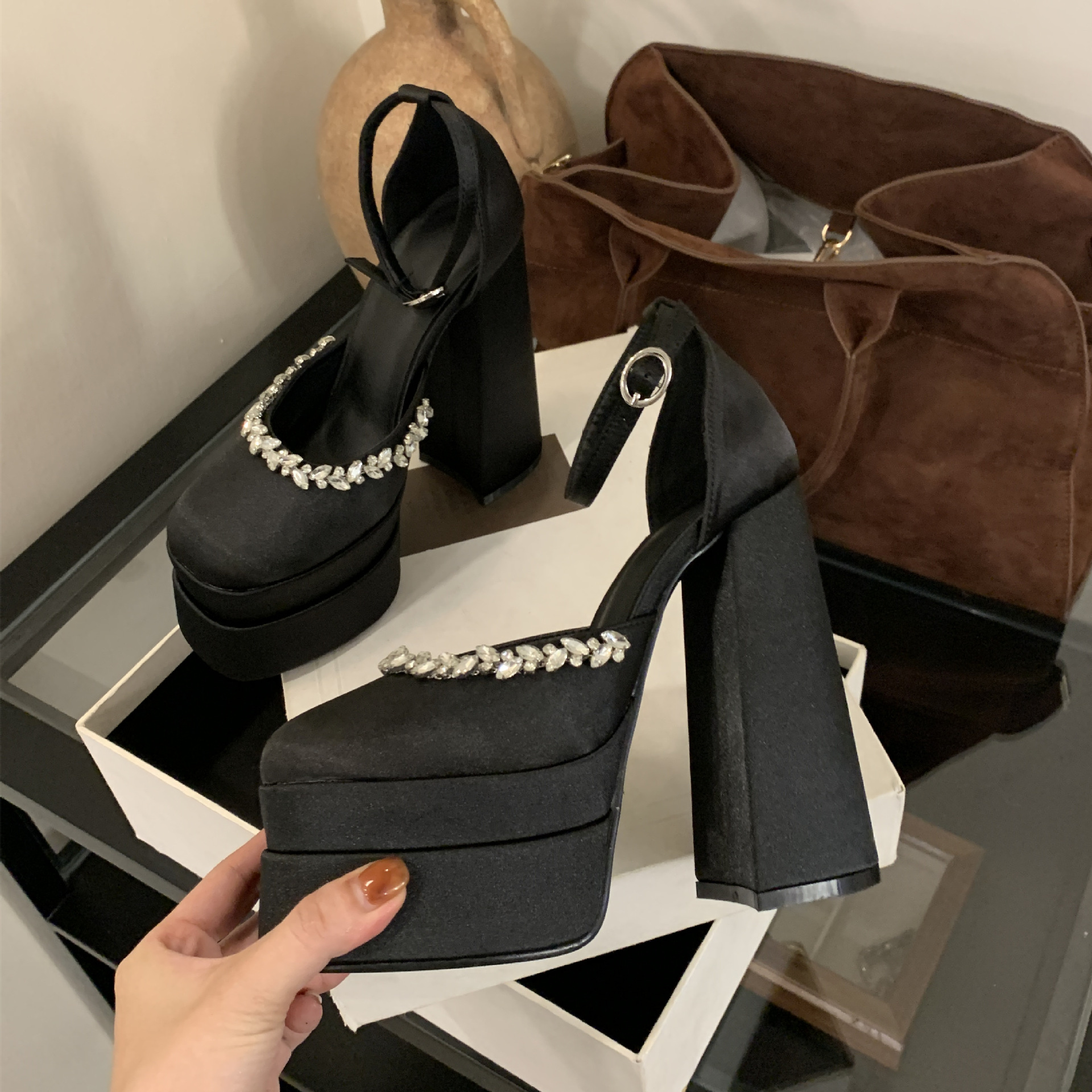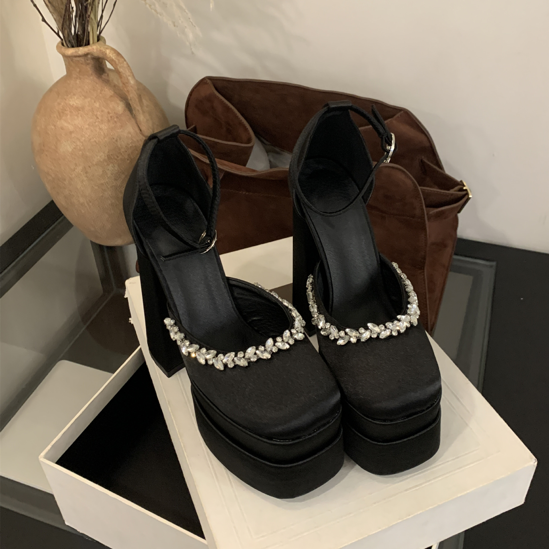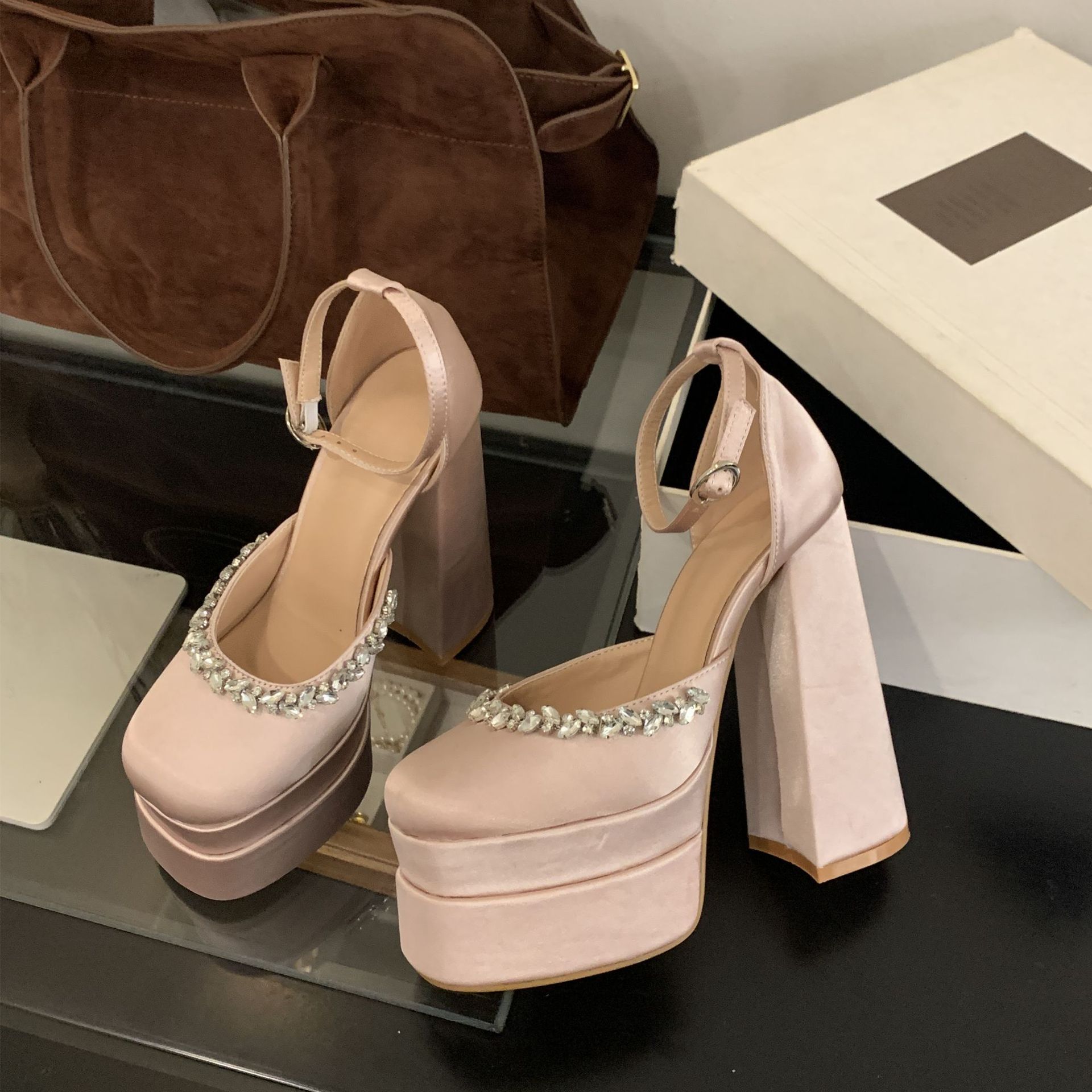 2024 여성 여름 유럽과 미국 패션 방수 플랫폼 스퀘어 헤드 할로우 두꺼운 바오 투 증오 Tiangao Satin 하이힐 쇼 샌들