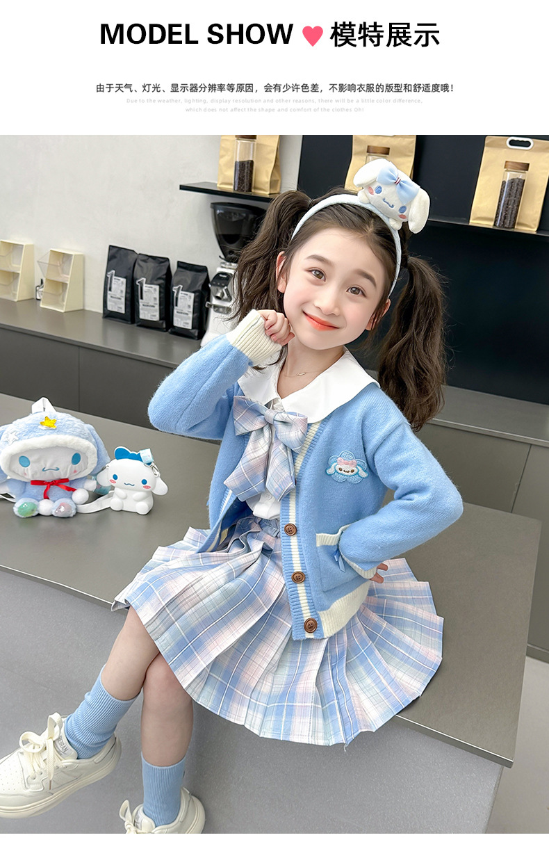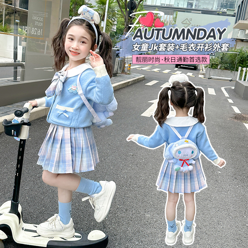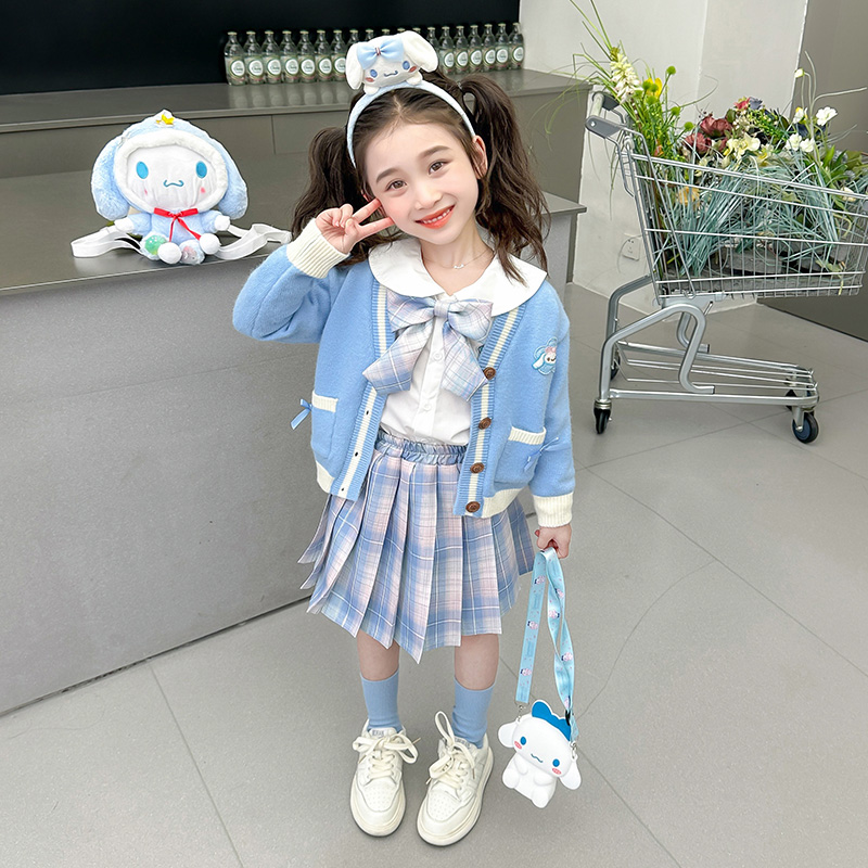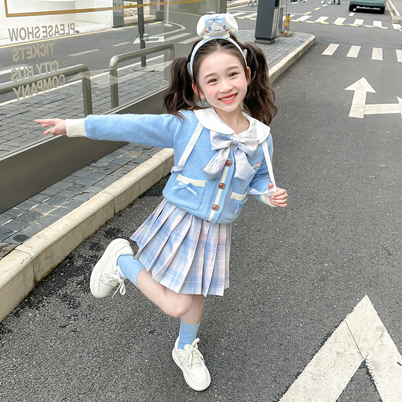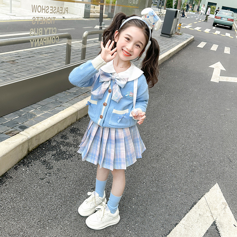 아기 소녀 옥 구이 개 니트 카디건 풀오버 스커트 2024 새로운 작은 소녀 jk 유니폼 세트 가을 3 피스 세트스토어 가기