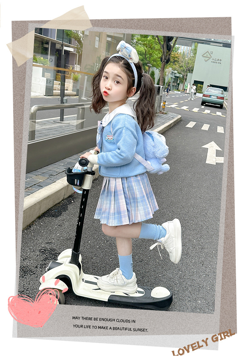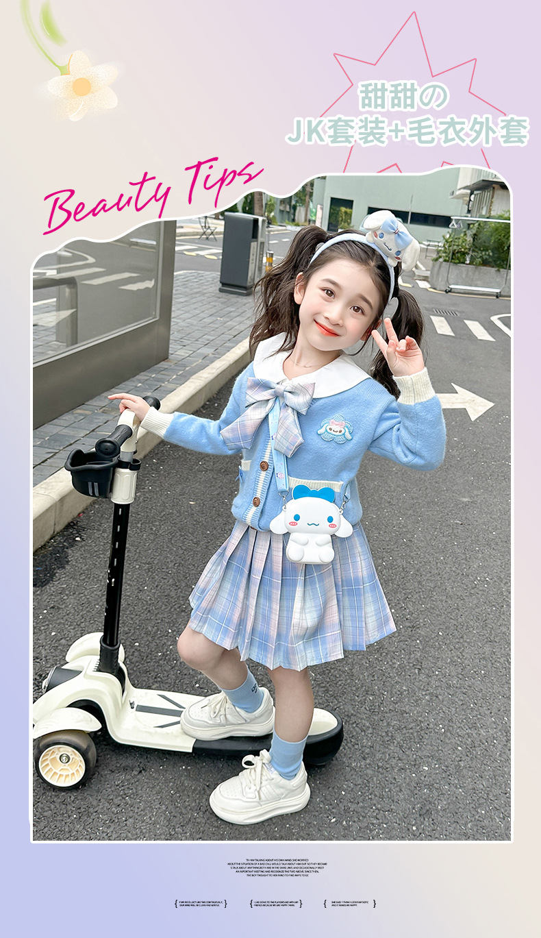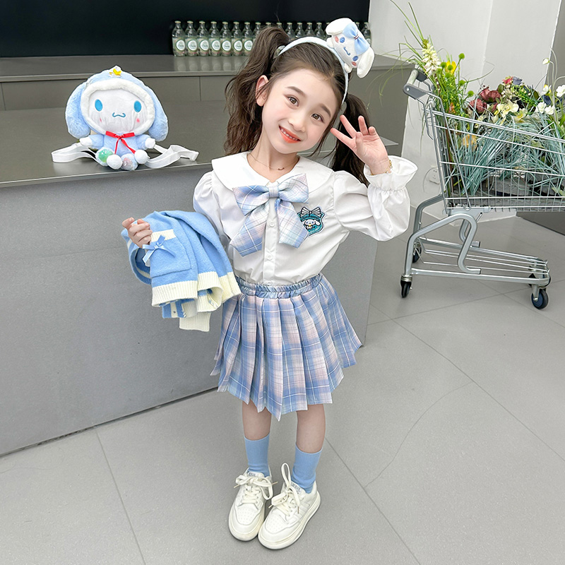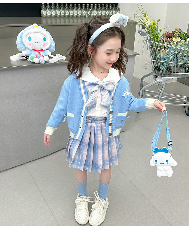 아기 소녀 옥 구이 개 니트 카디건 풀오버 스커트 2024 새로운 작은 소녀 jk 유니폼 세트 가을 3 피스 세트스토어 가기
