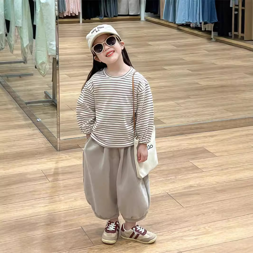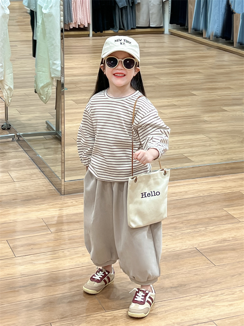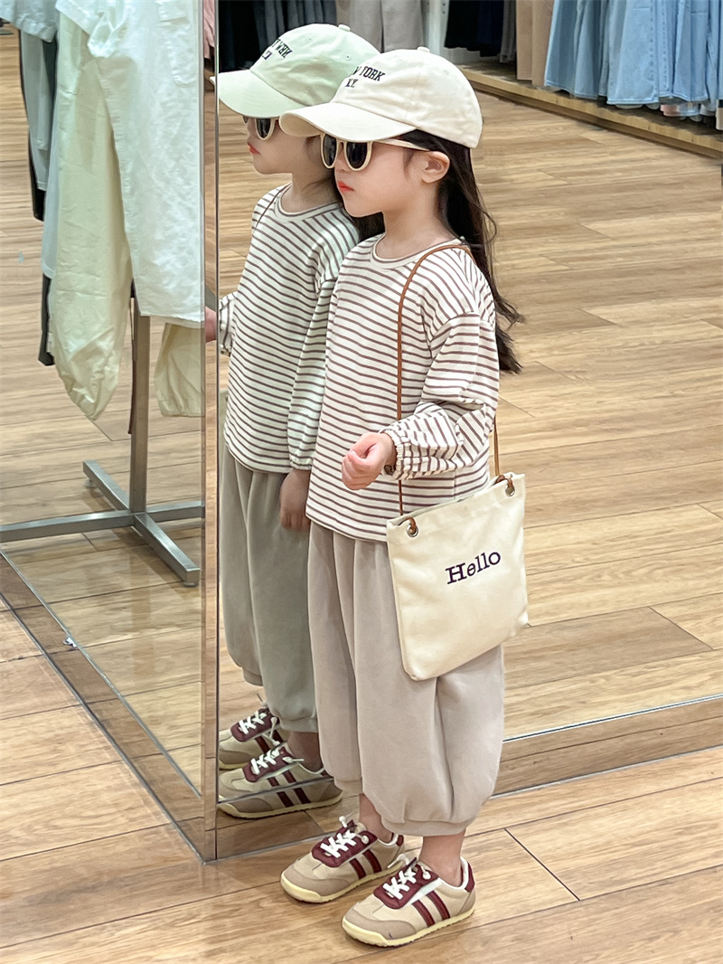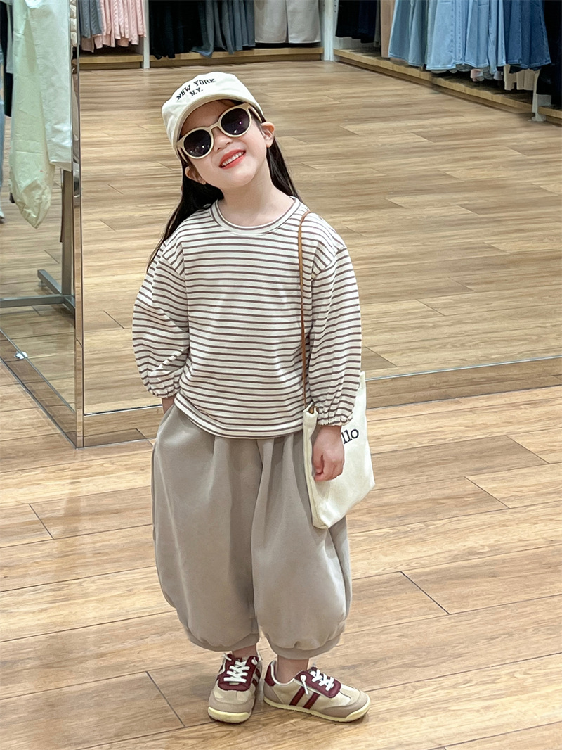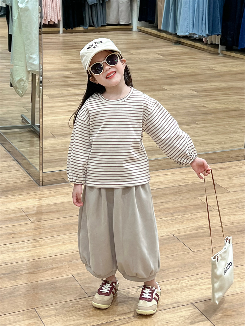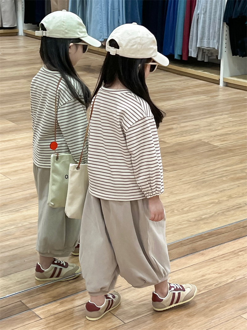 남학생과 여학생을위한 한국식 봄과 가을 줄무늬 둥근 목 긴 소매 내베이스 셔츠스토어 가기