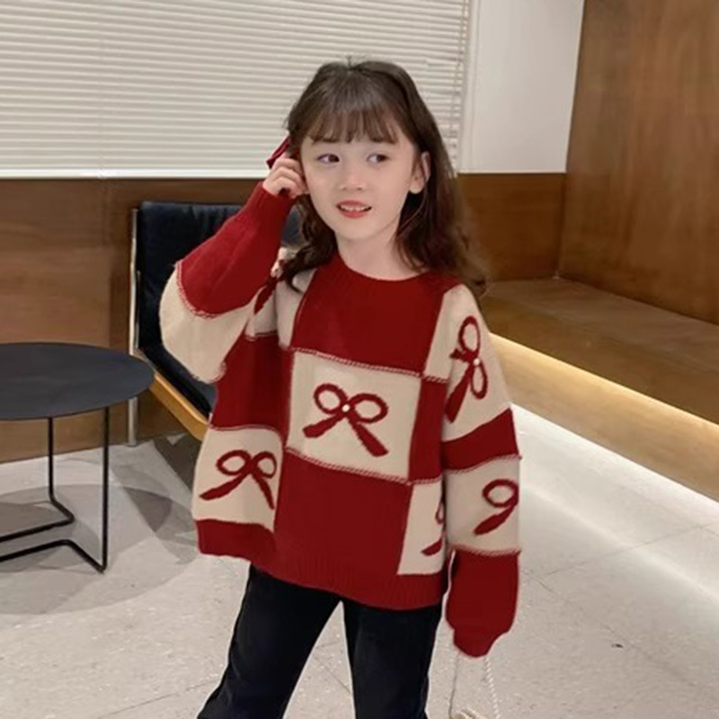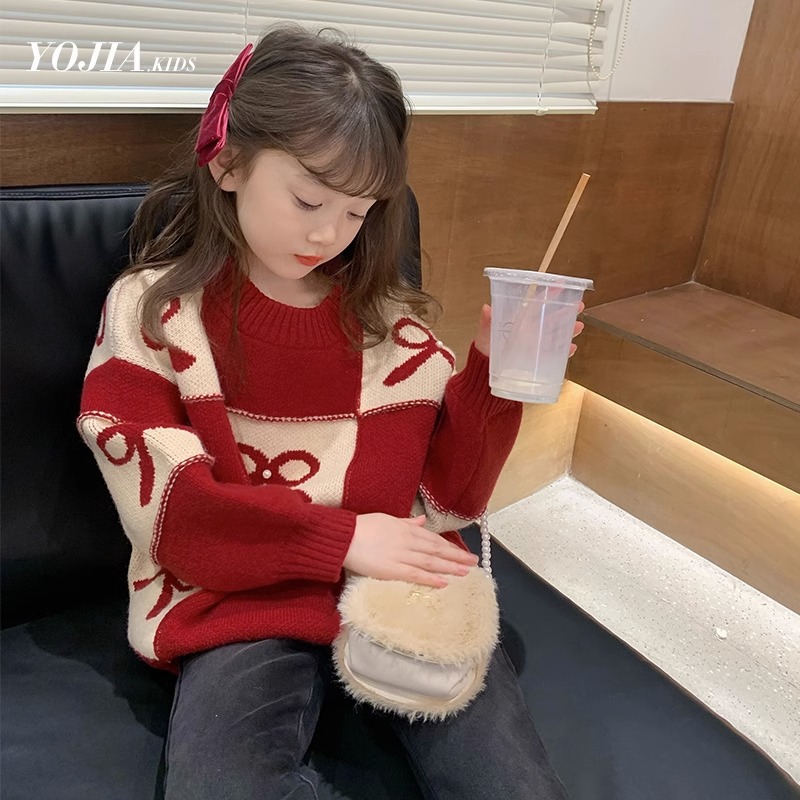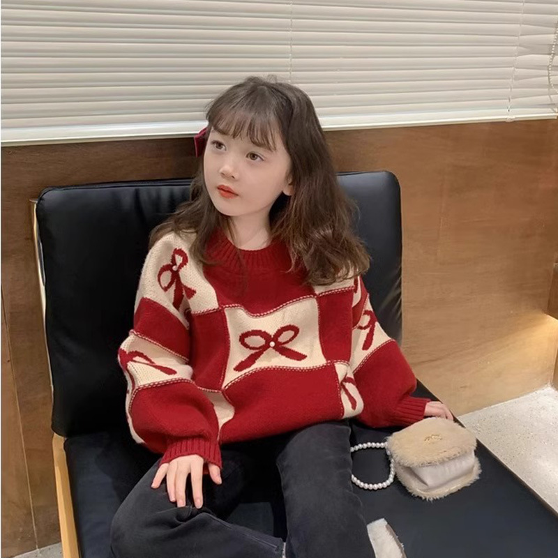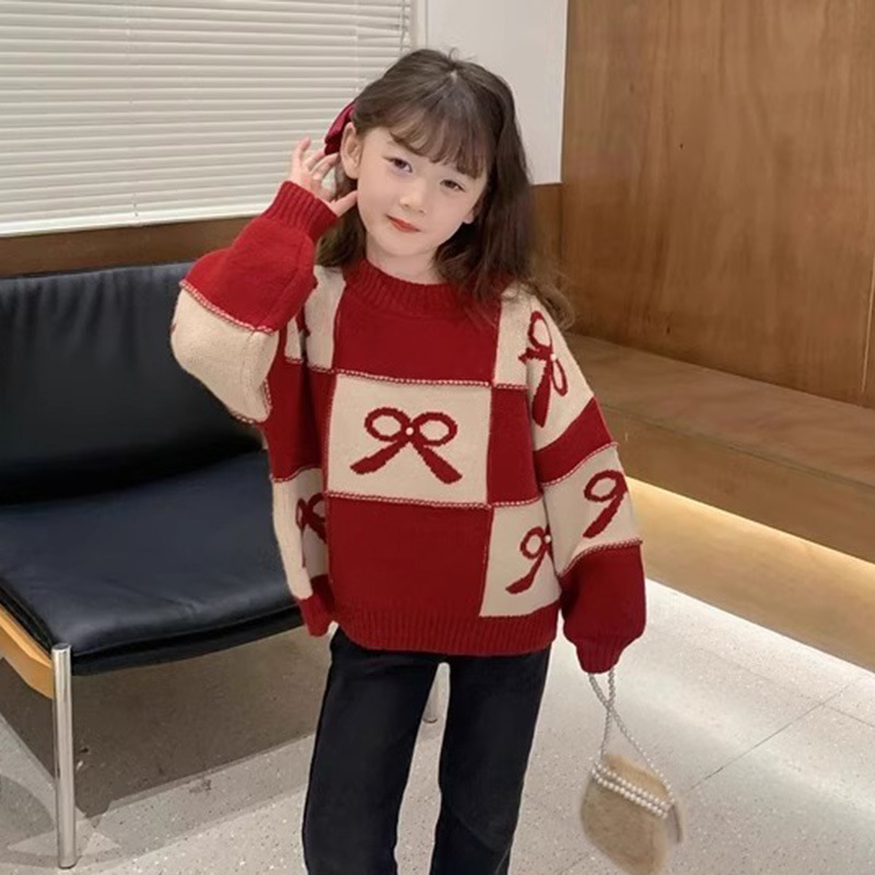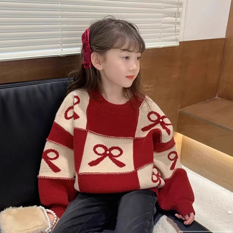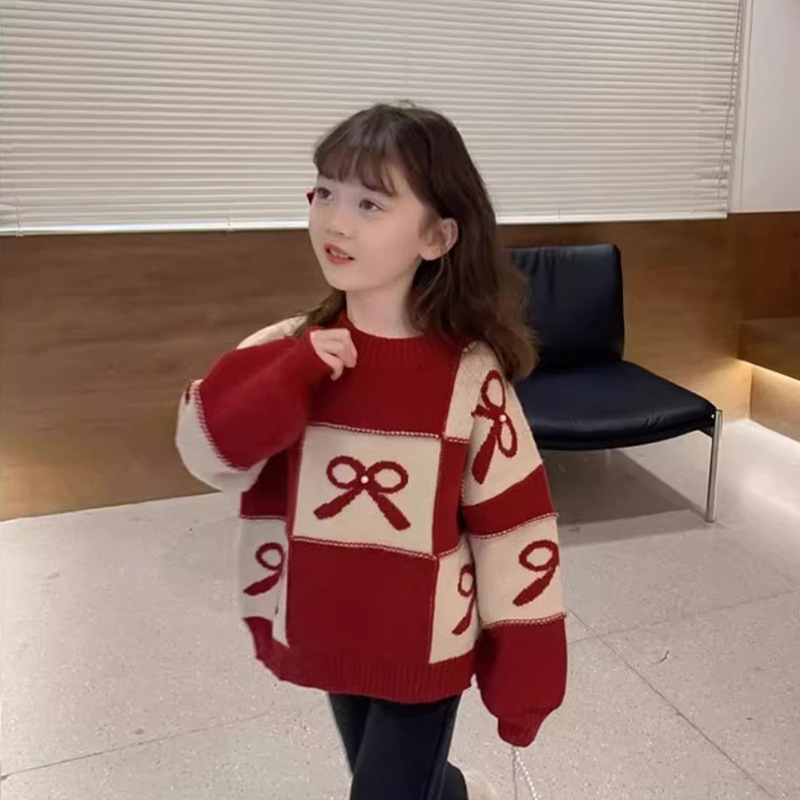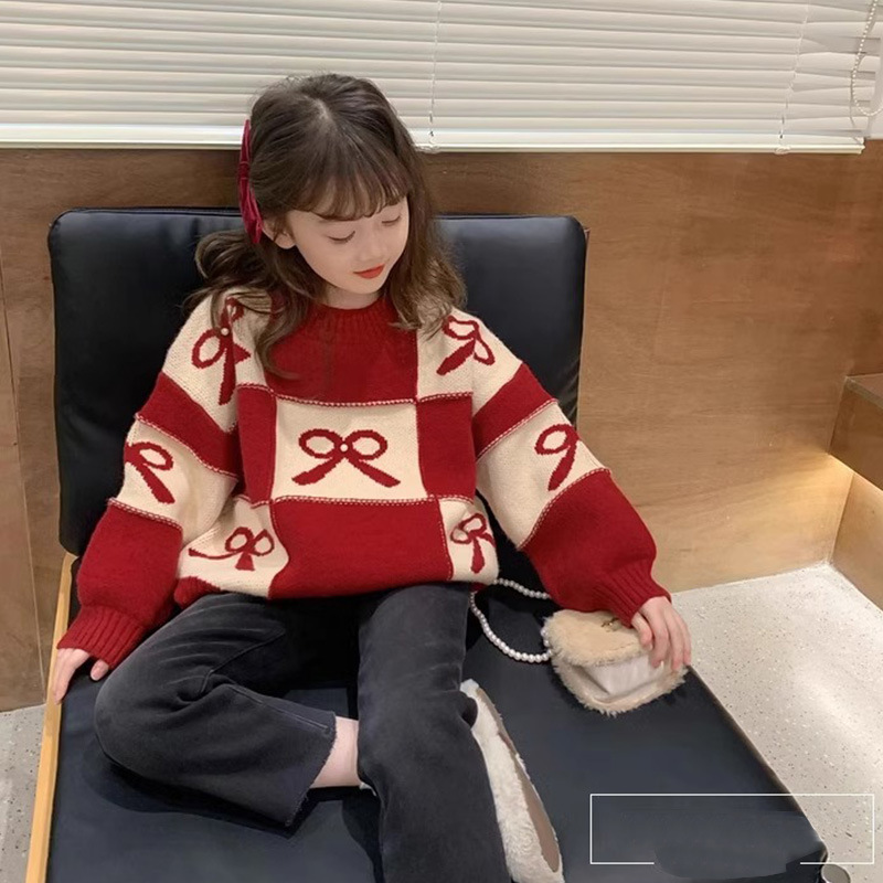 여아용 빨간색 두꺼운 스웨터 2025 가을 겨울 신상 패션 어린이 니트웨어 크리스마스 및 설날 의류스토어 가기