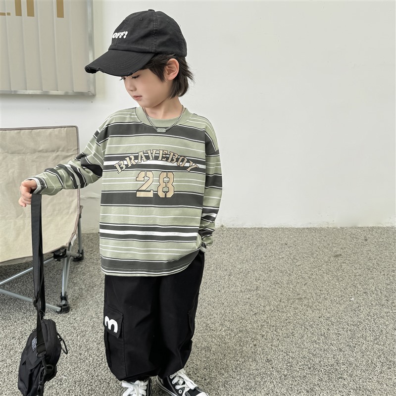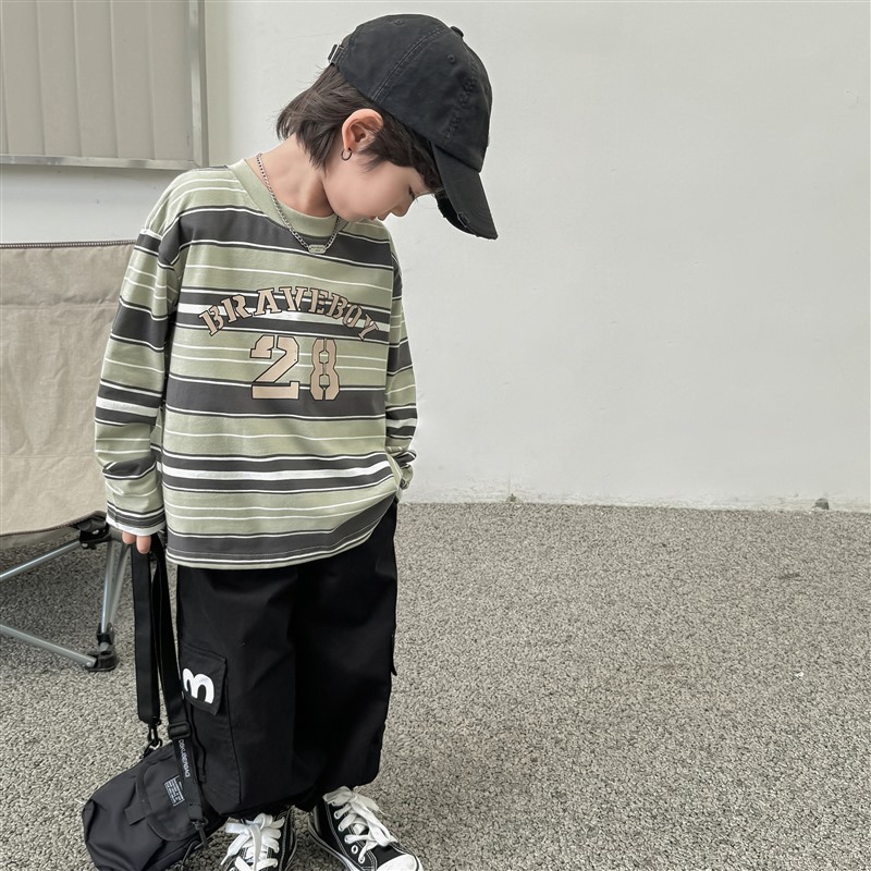 2024 Haima의 가을 새 소년 대조 컬러 스트라이프 긴팔 티셔츠 코튼 의류 한국 아동복 가을 패션스토어 가기