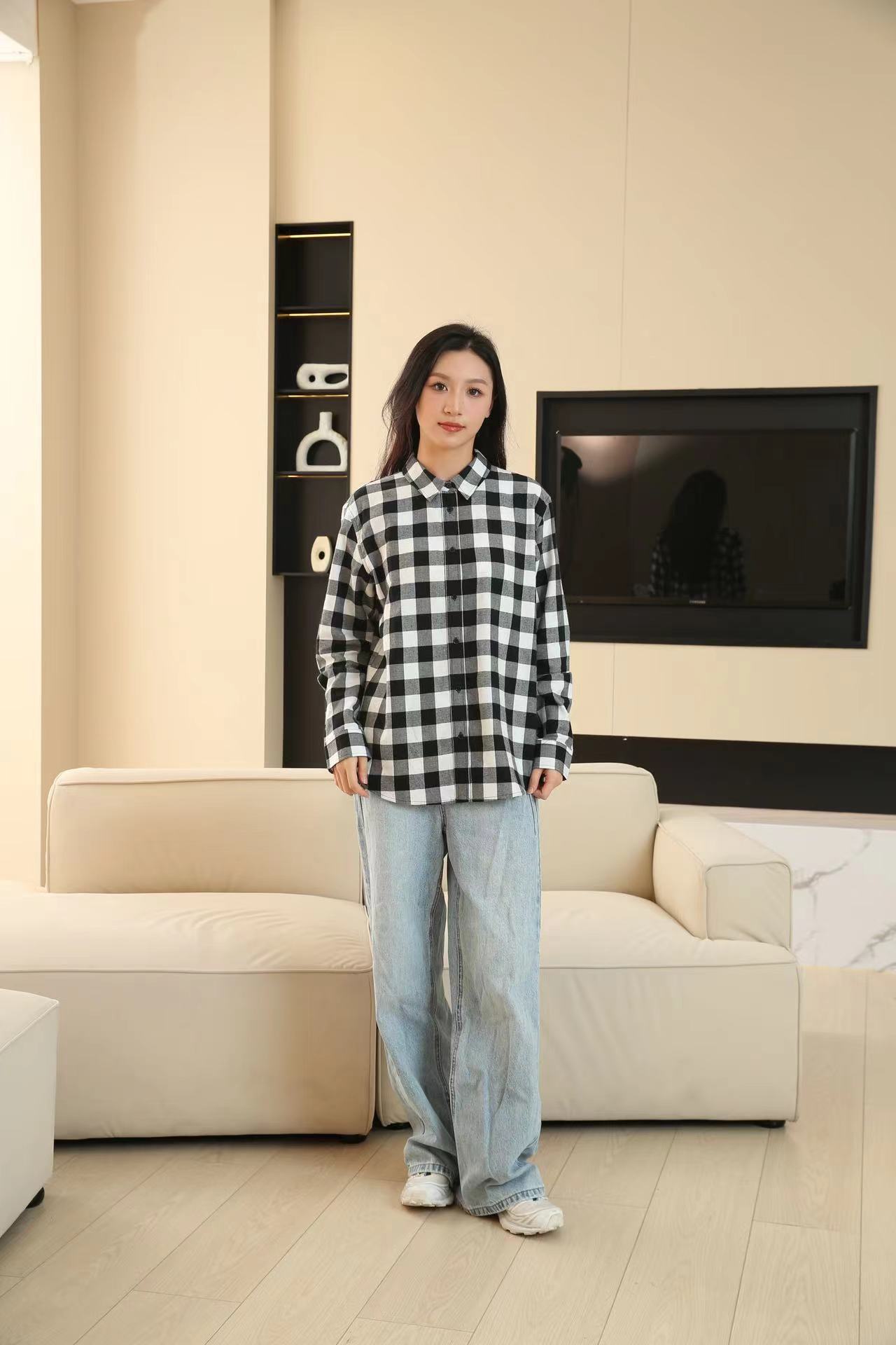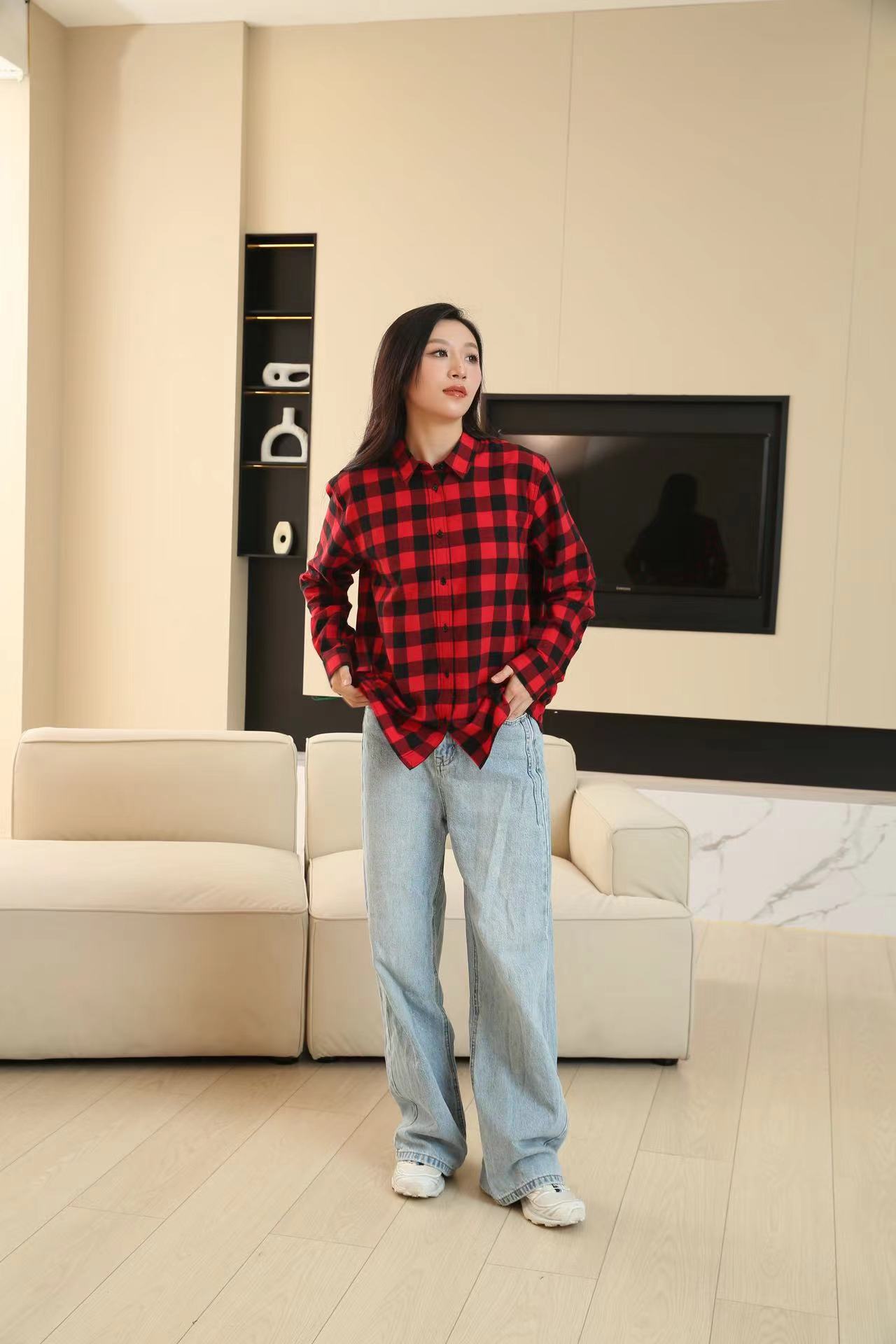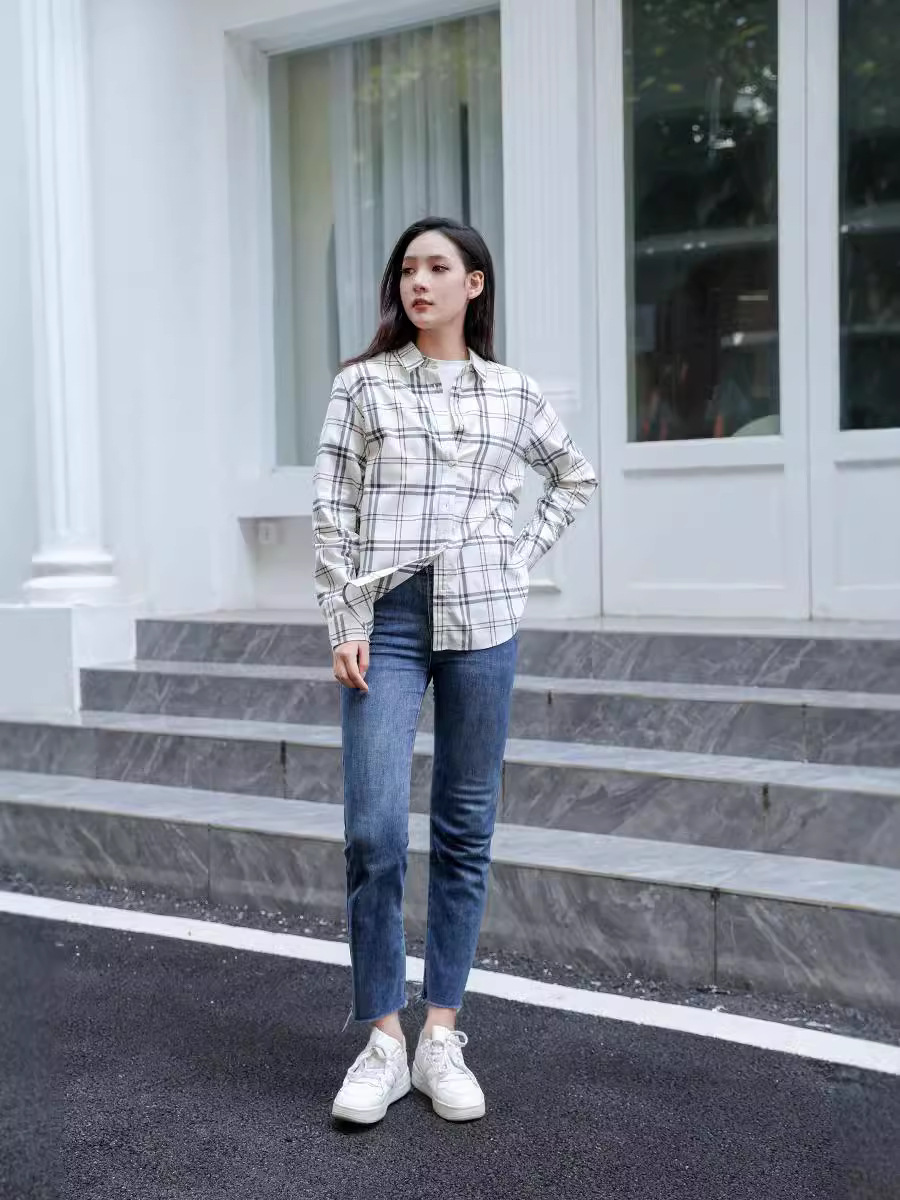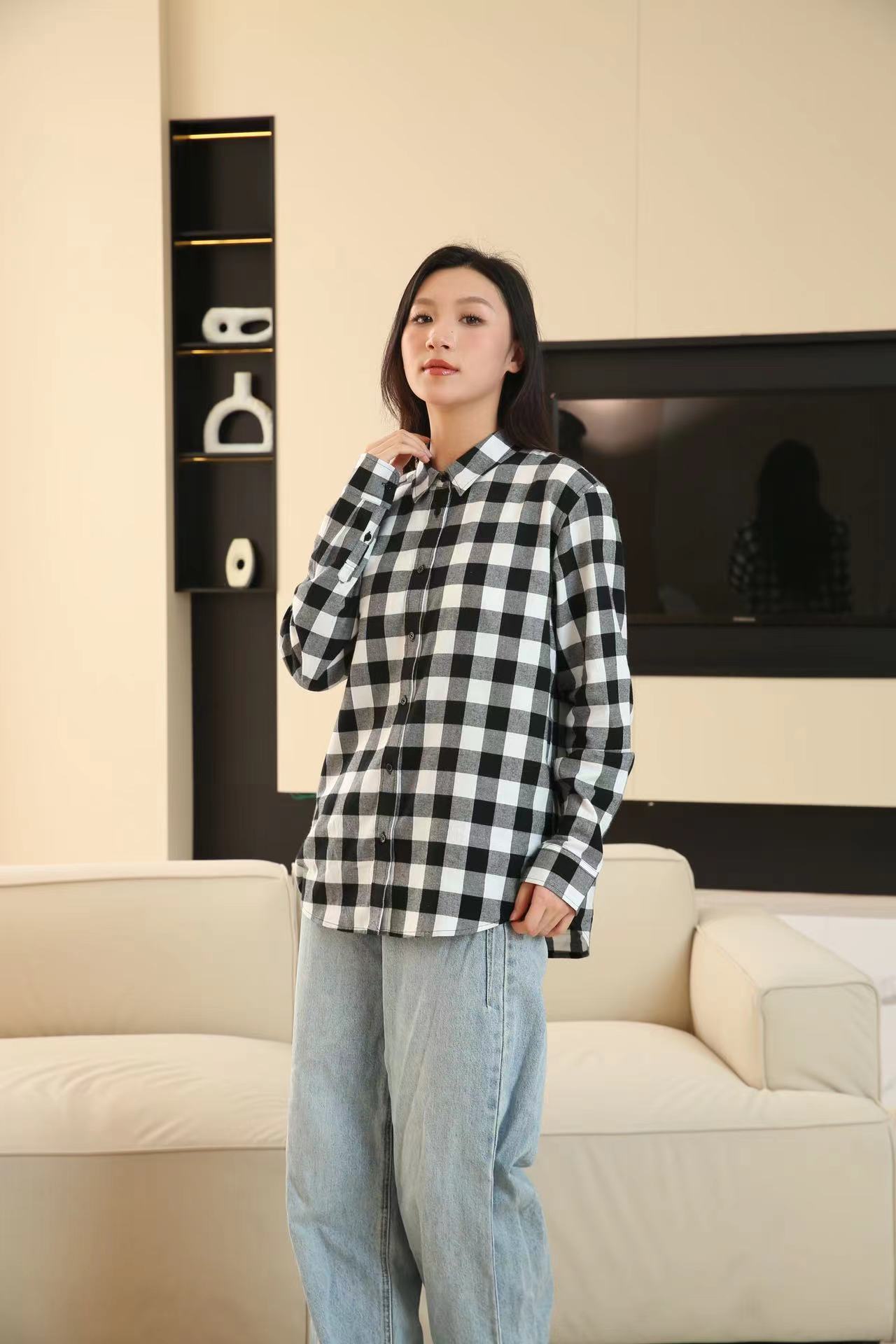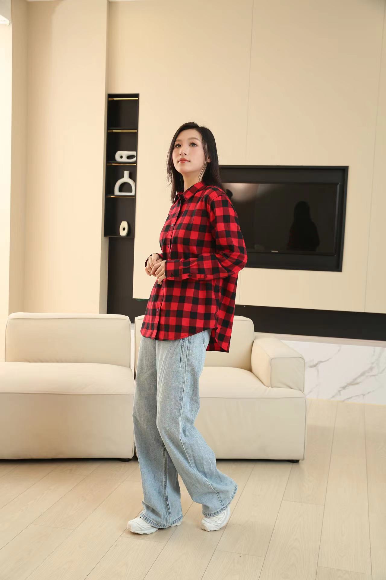 격자 무늬 셔츠 여자의 새로운 느슨한 올 매치 이른 가을 클래식 올 매치 카디건 스퀘어 칼라 가을 격자 무늬 재킷 긴 소매
