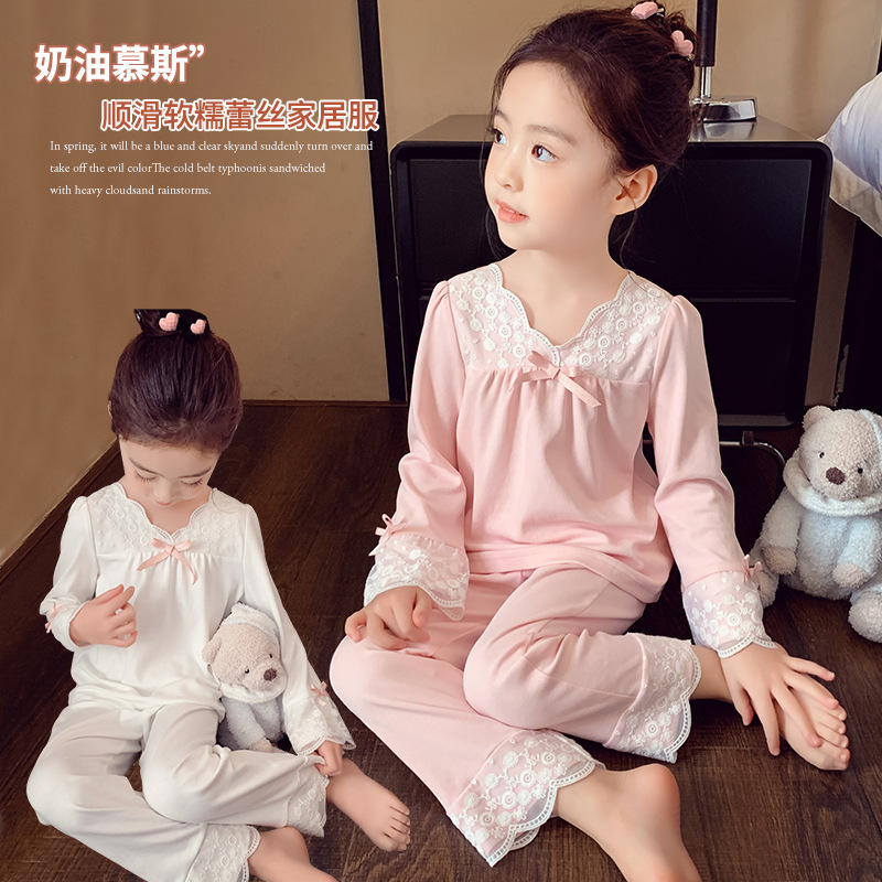 소녀 홈 의류 세트 봄 옷 2024 새로운 서양식 어린이 느슨한 소녀 긴 소매 잠옷 2 조각 세트