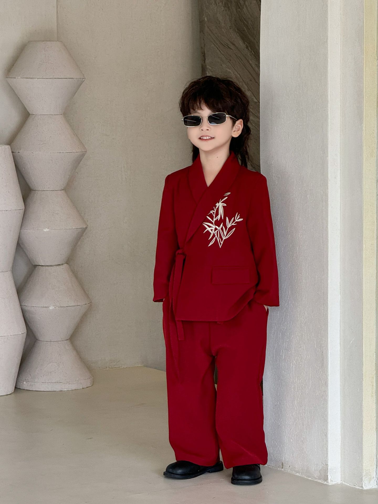 아동 정장 세트 2025 봄 가을 신상 어린이 정장 대나무 잎 자수 남아 예복 빨간색 한복