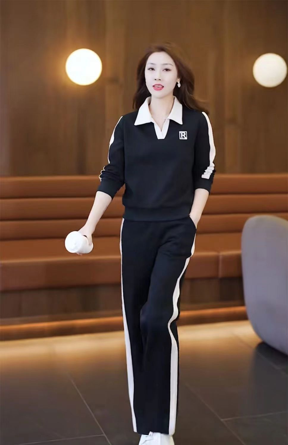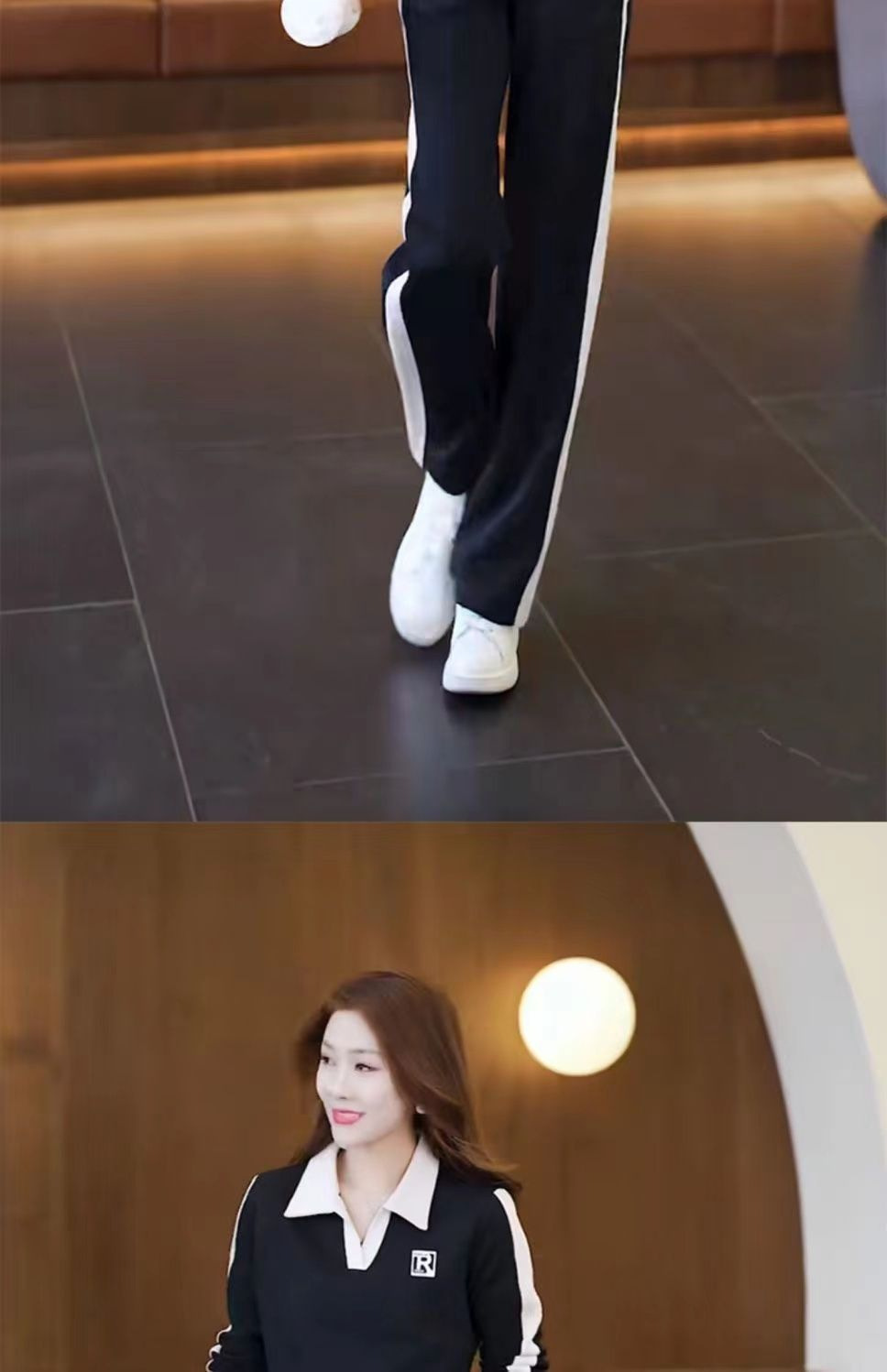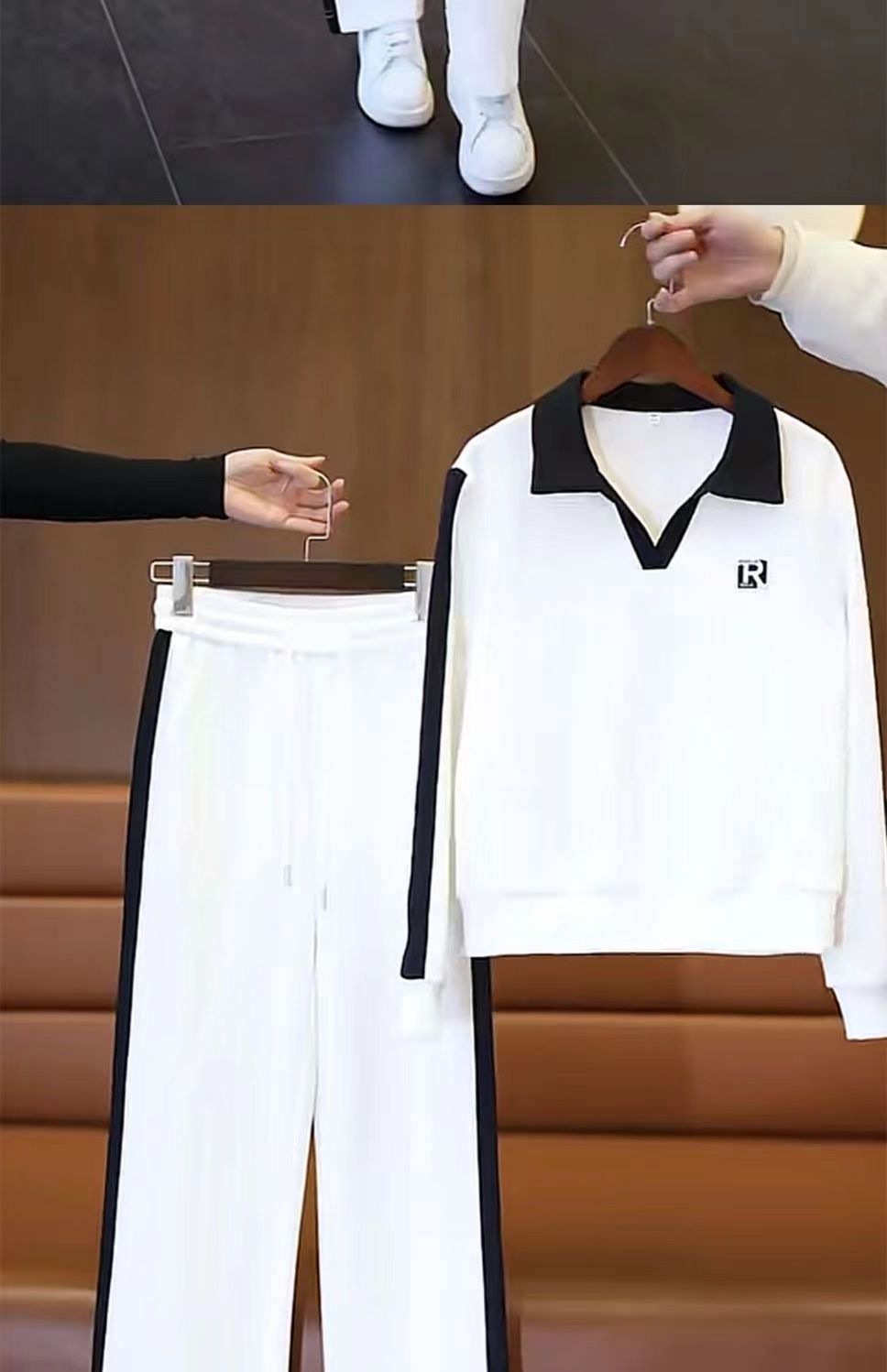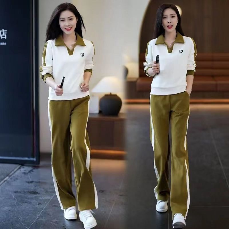 캐주얼 스포츠 세트 여성 2024 봄과 가을 새로운 슬리밍 웨스턴 스타일 간단한 옷깃 스웨트 셔츠 투피스 세트스토어 가기