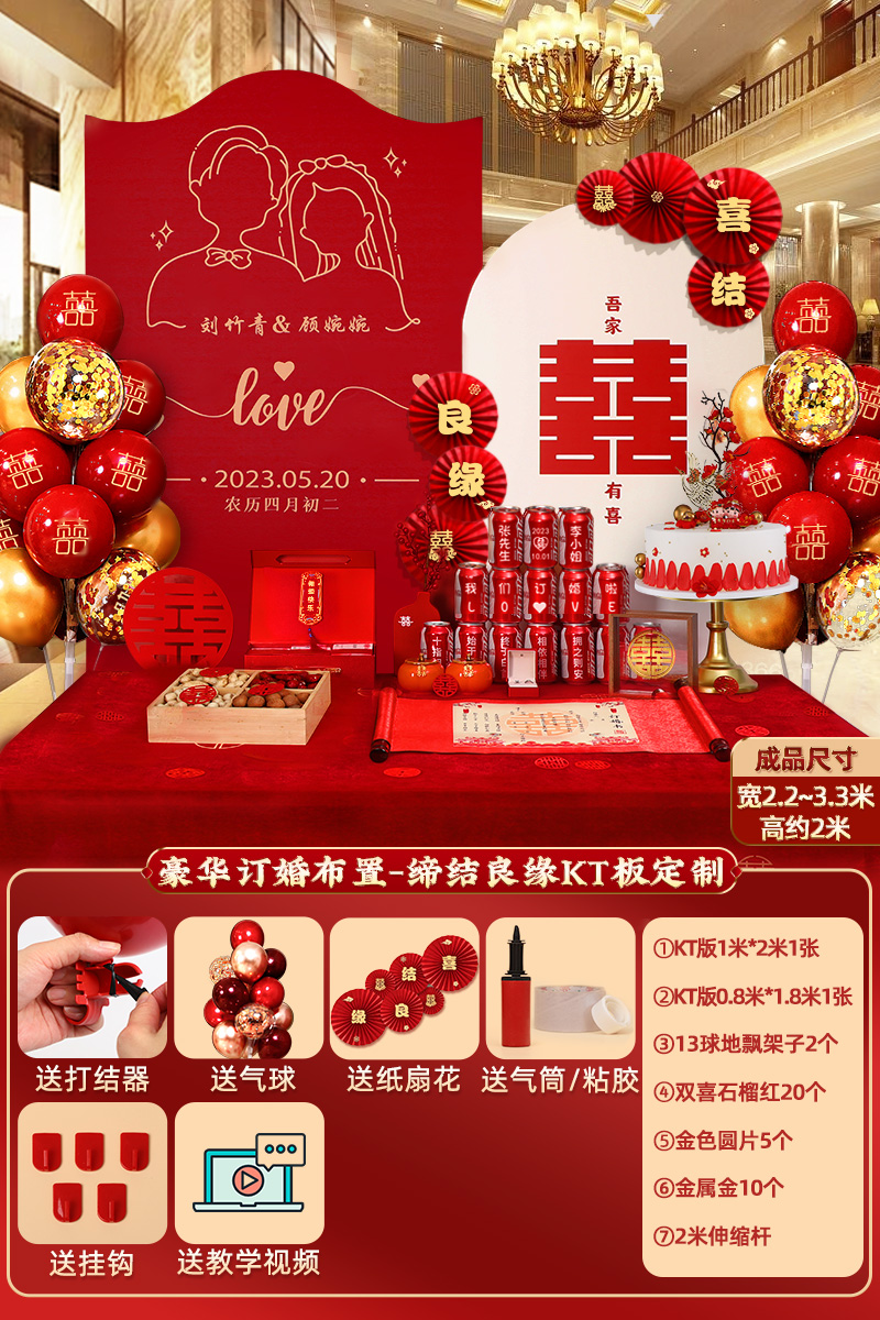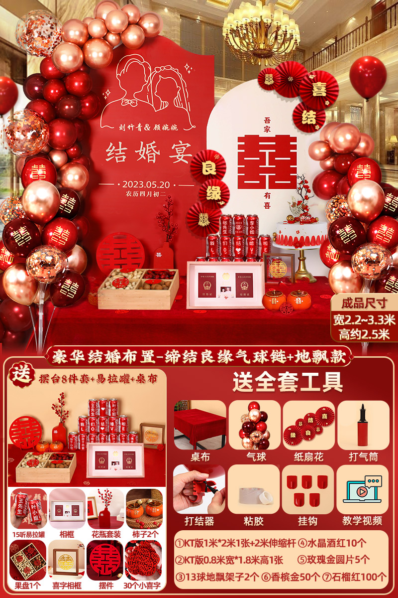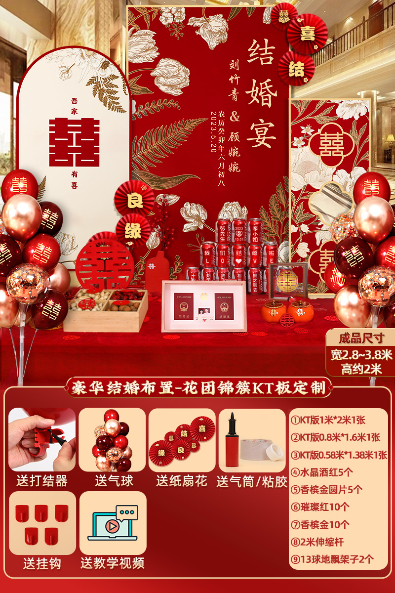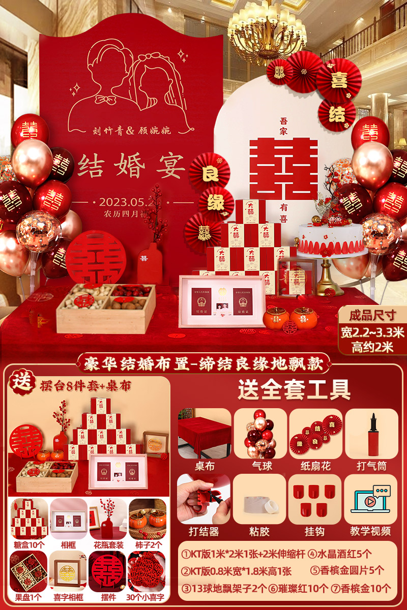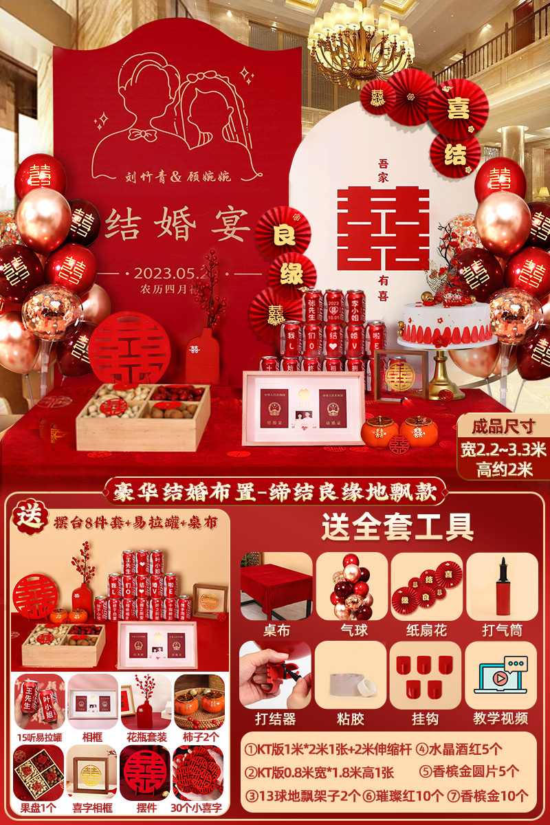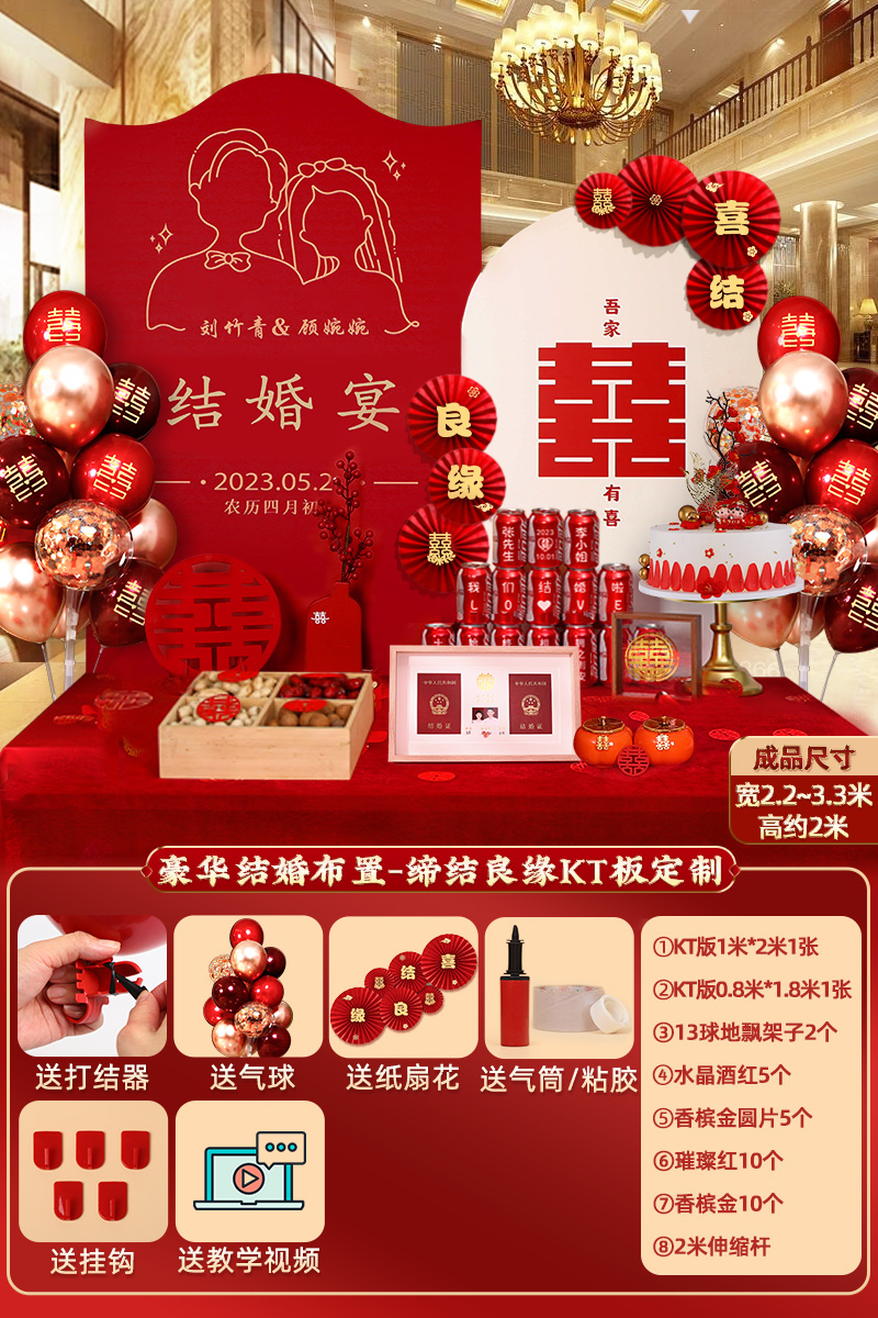 웨딩 연회 레이아웃 장식 전체 장면 그물 붉은 장식품 배경 벽 테이블 세트 패키지 kt 보드 용품스토어 가기