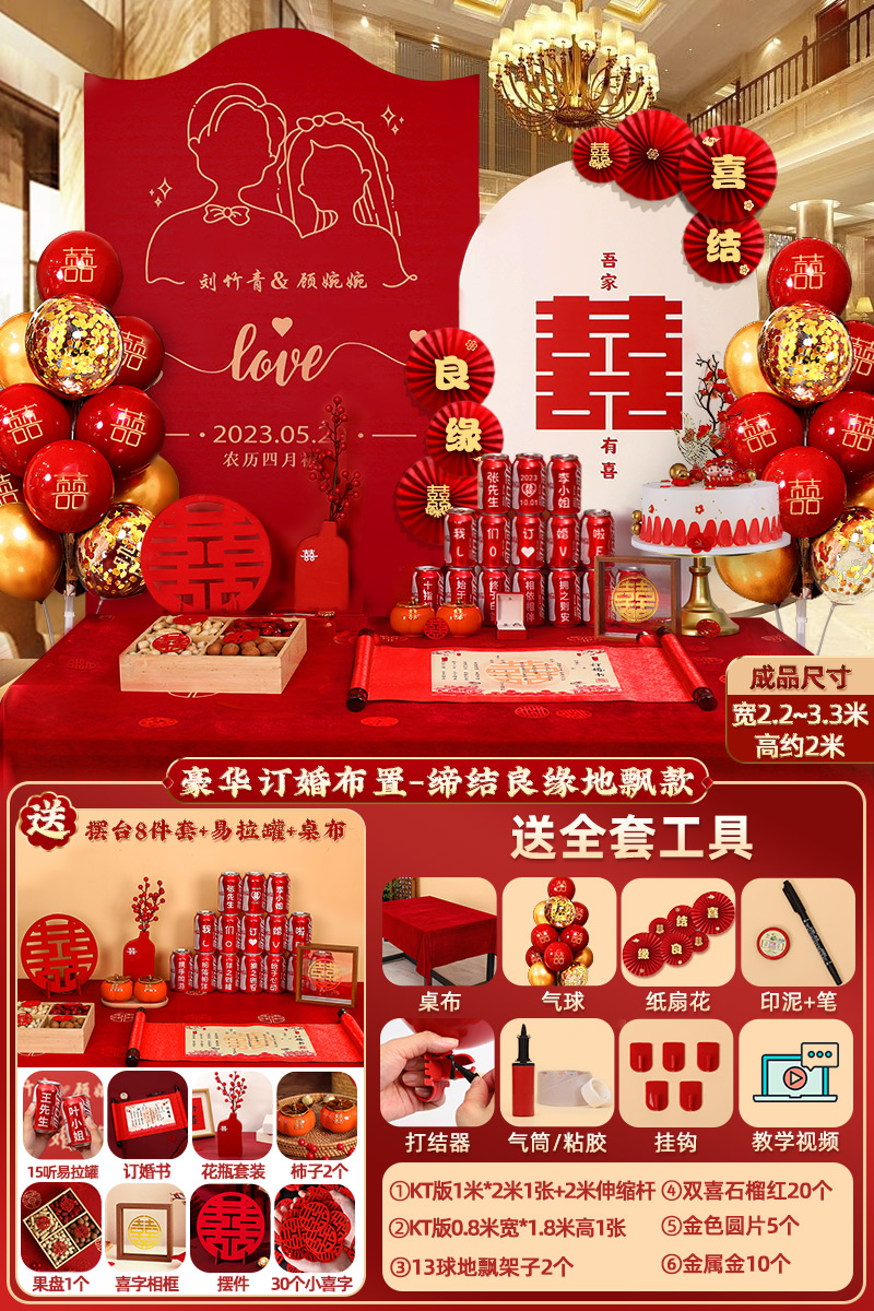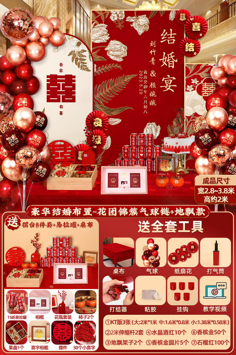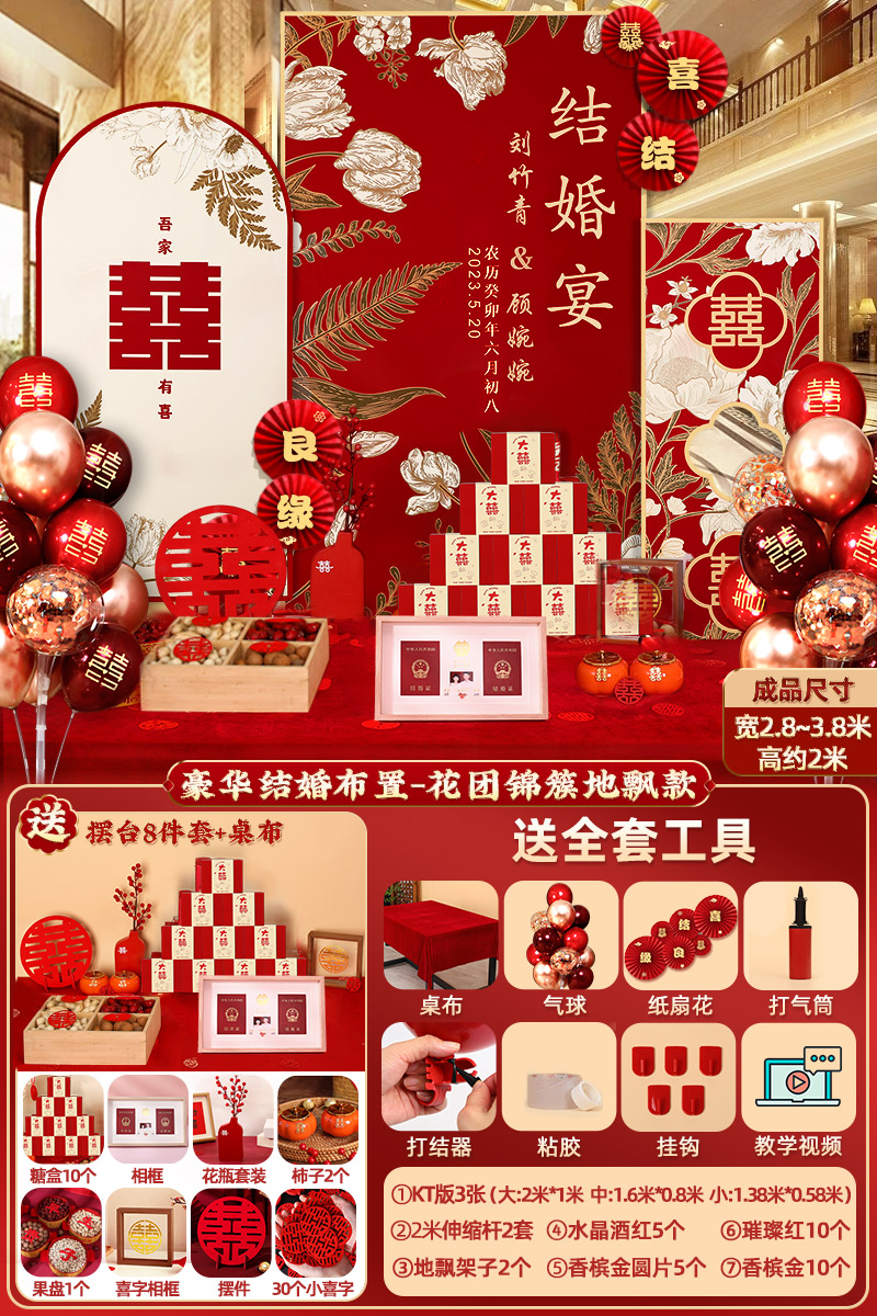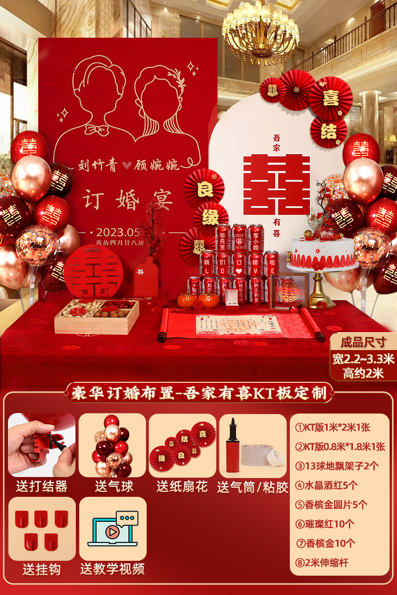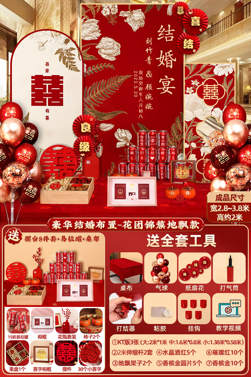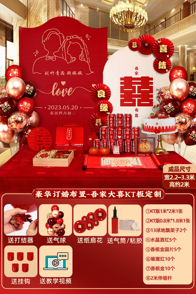 웨딩 연회 레이아웃 장식 전체 장면 그물 붉은 장식품 배경 벽 테이블 세트 패키지 kt 보드 용품스토어 가기