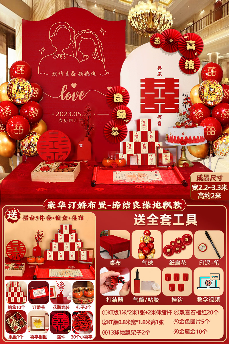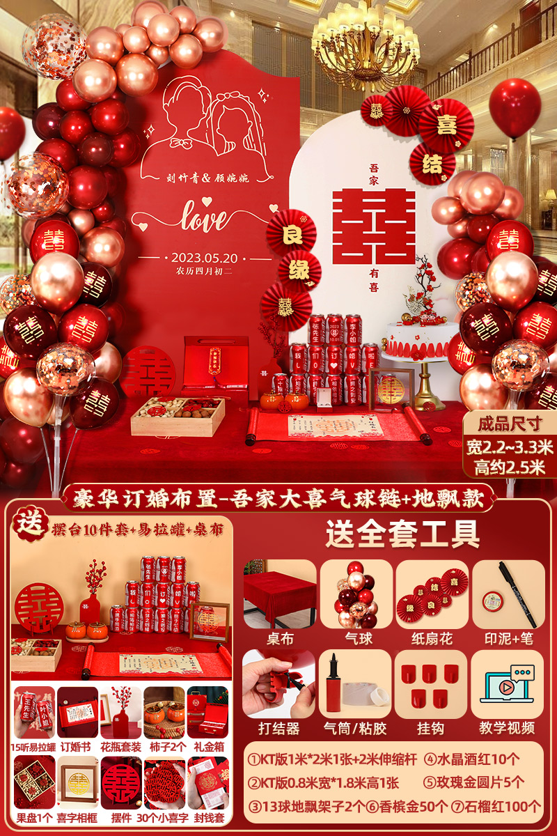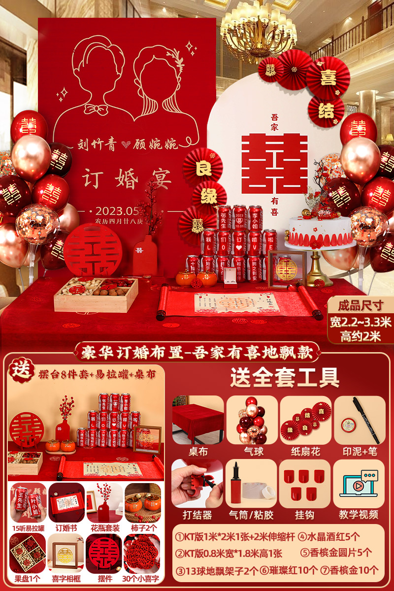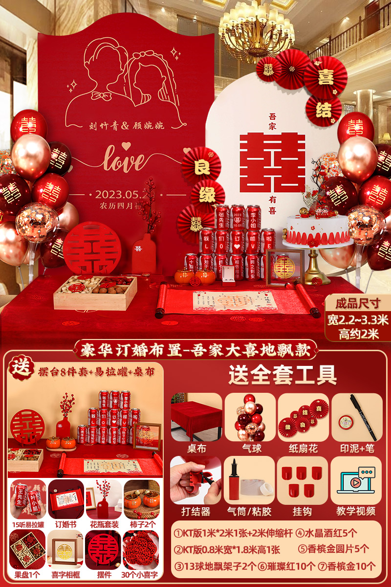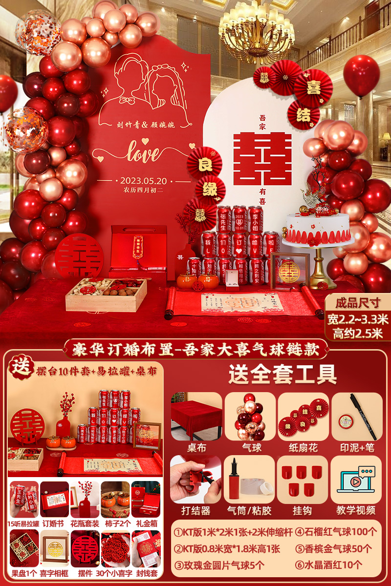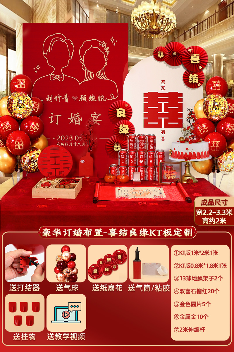 웨딩 연회 레이아웃 장식 전체 장면 그물 붉은 장식품 배경 벽 테이블 세트 패키지 kt 보드 용품스토어 가기