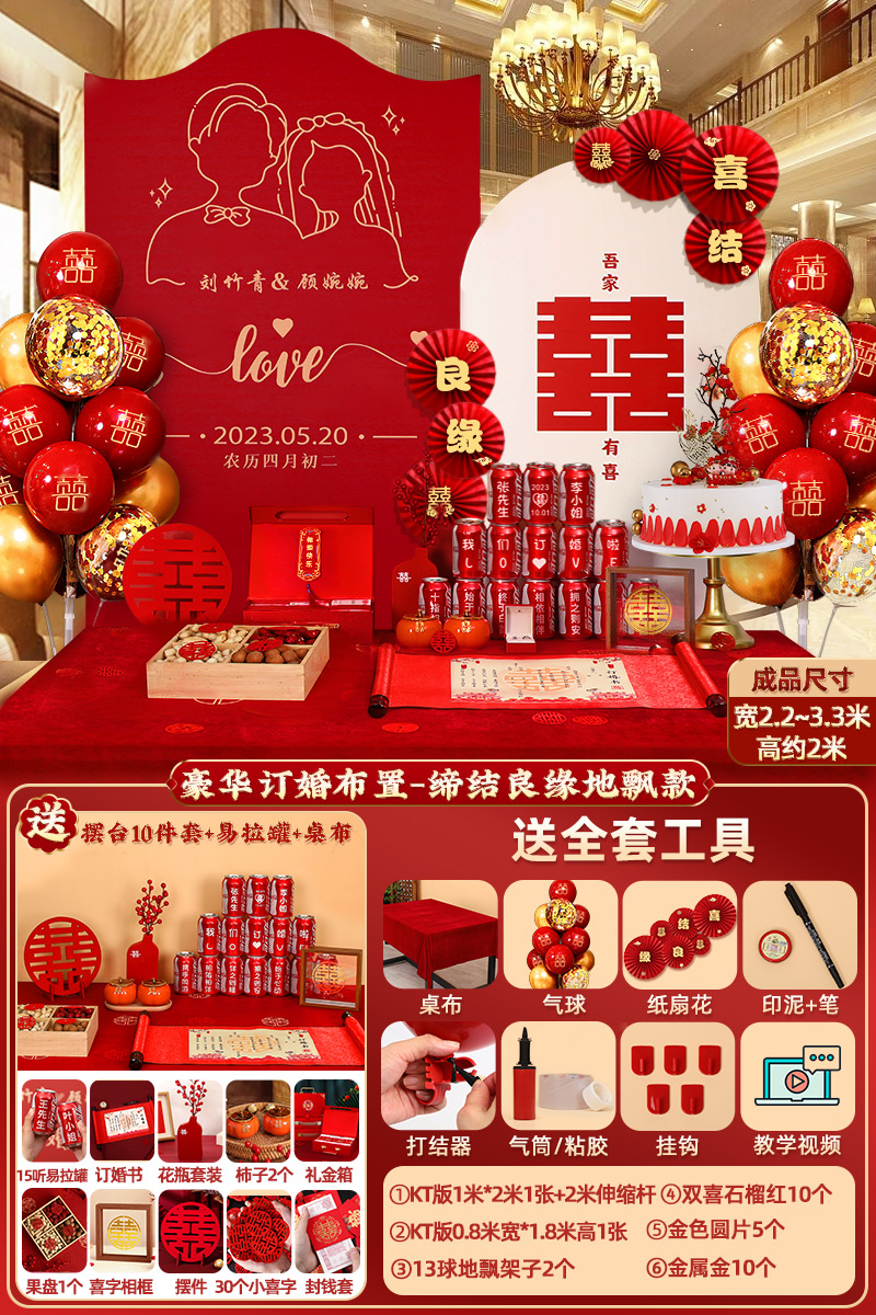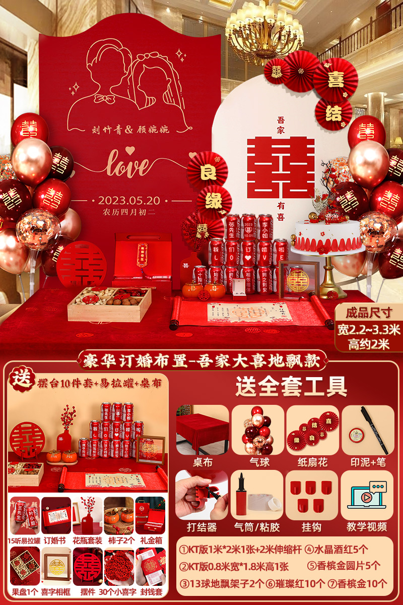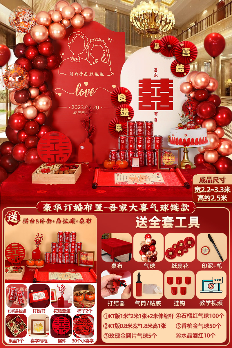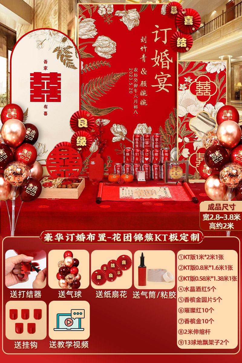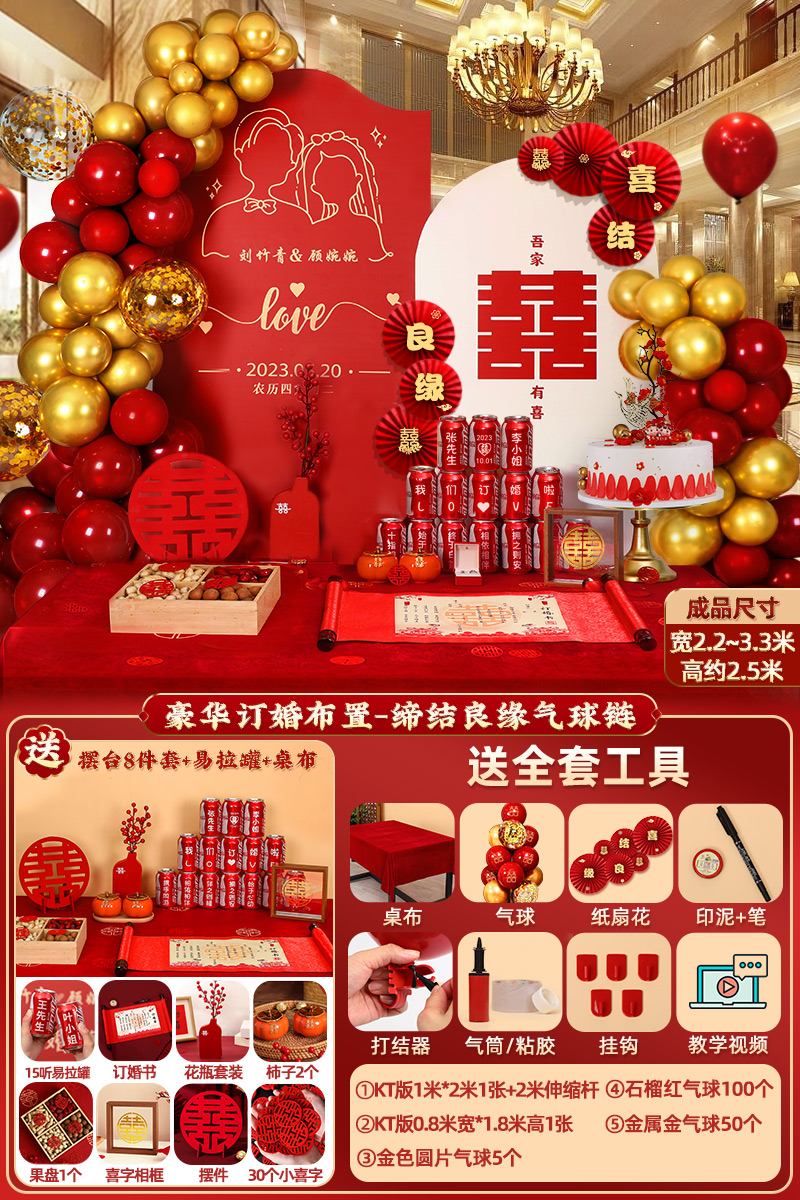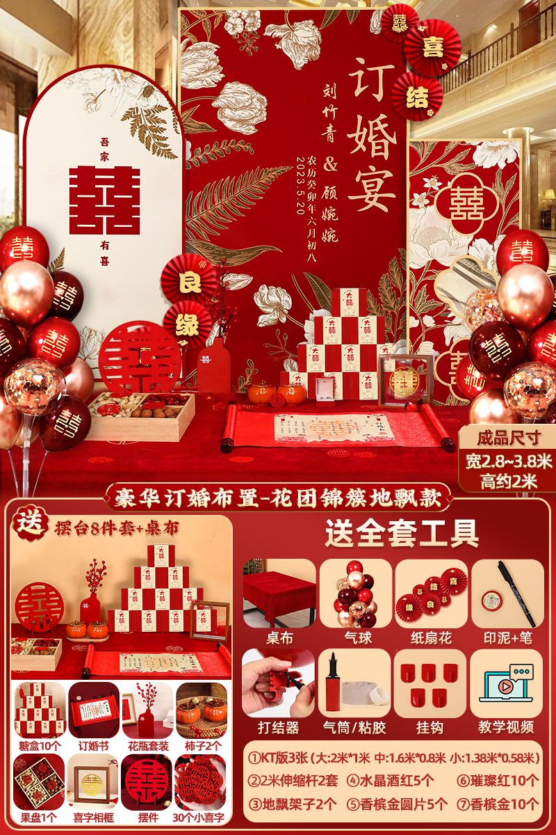 웨딩 연회 레이아웃 장식 전체 장면 그물 붉은 장식품 배경 벽 테이블 세트 패키지 kt 보드 용품스토어 가기