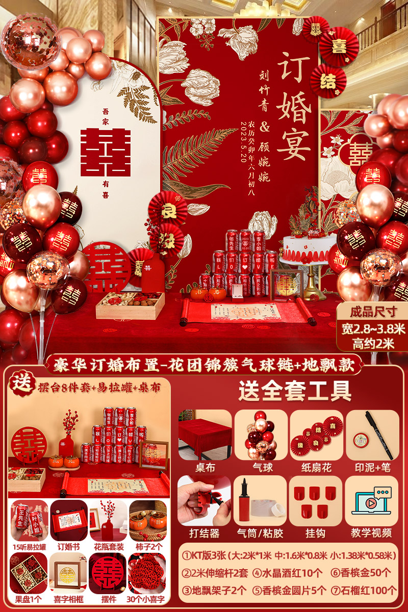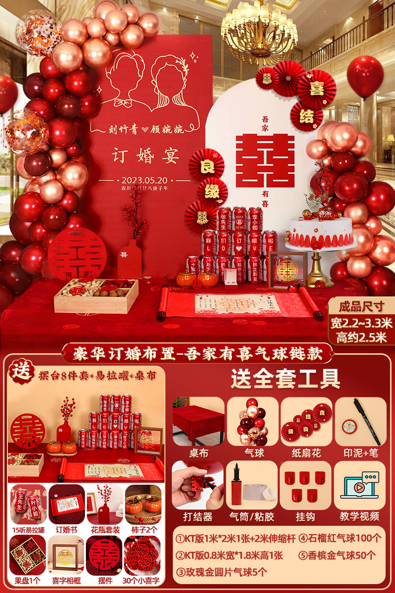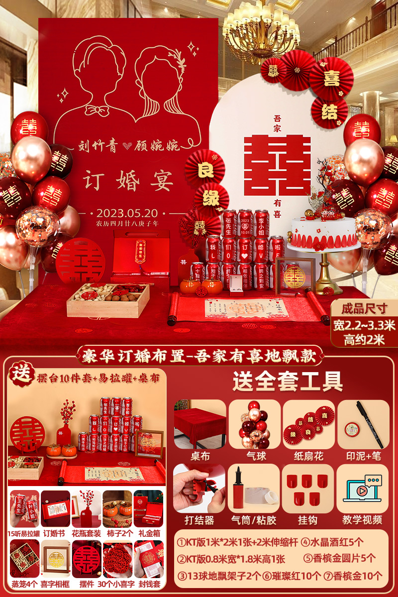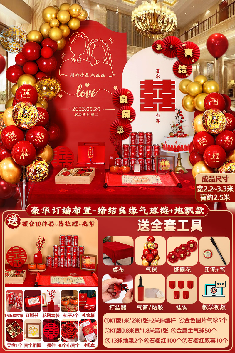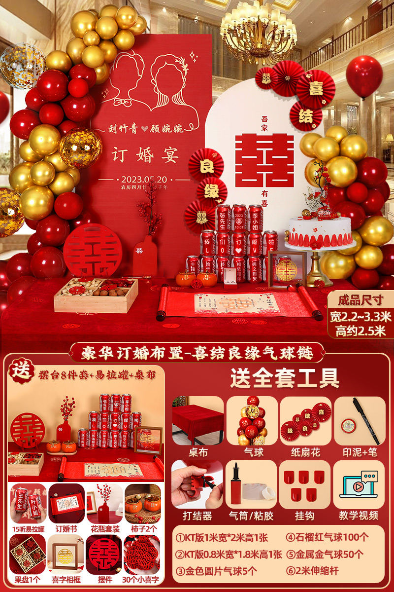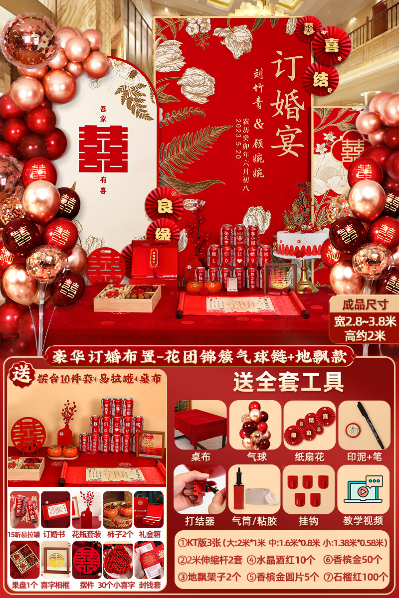 웨딩 연회 레이아웃 장식 전체 장면 그물 붉은 장식품 배경 벽 테이블 세트 패키지 kt 보드 용품스토어 가기