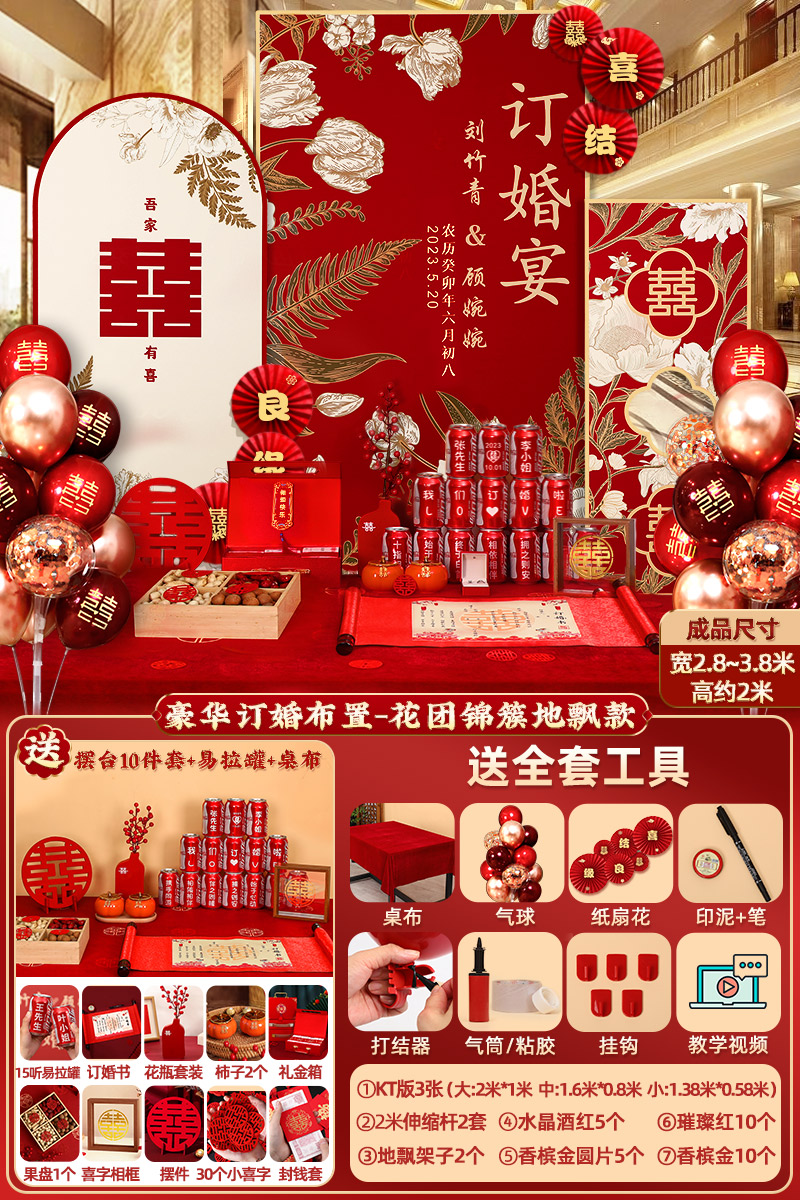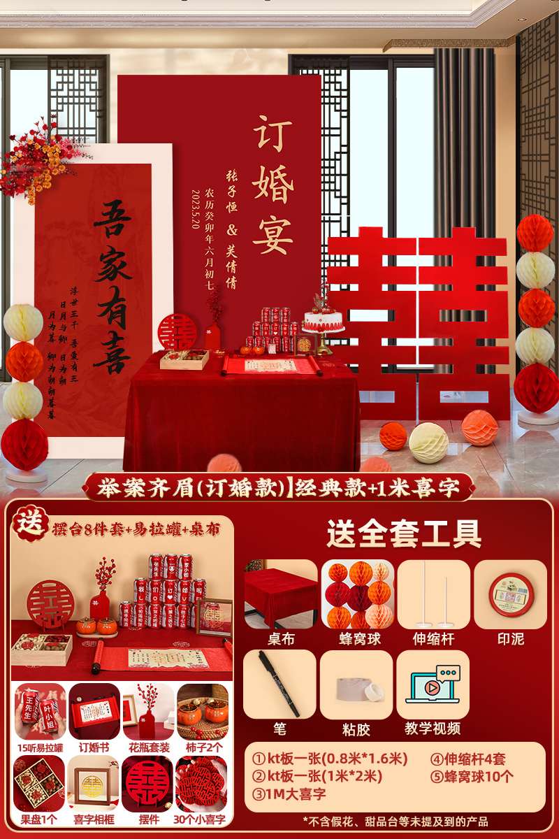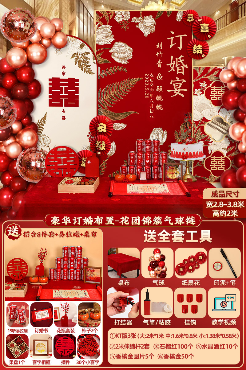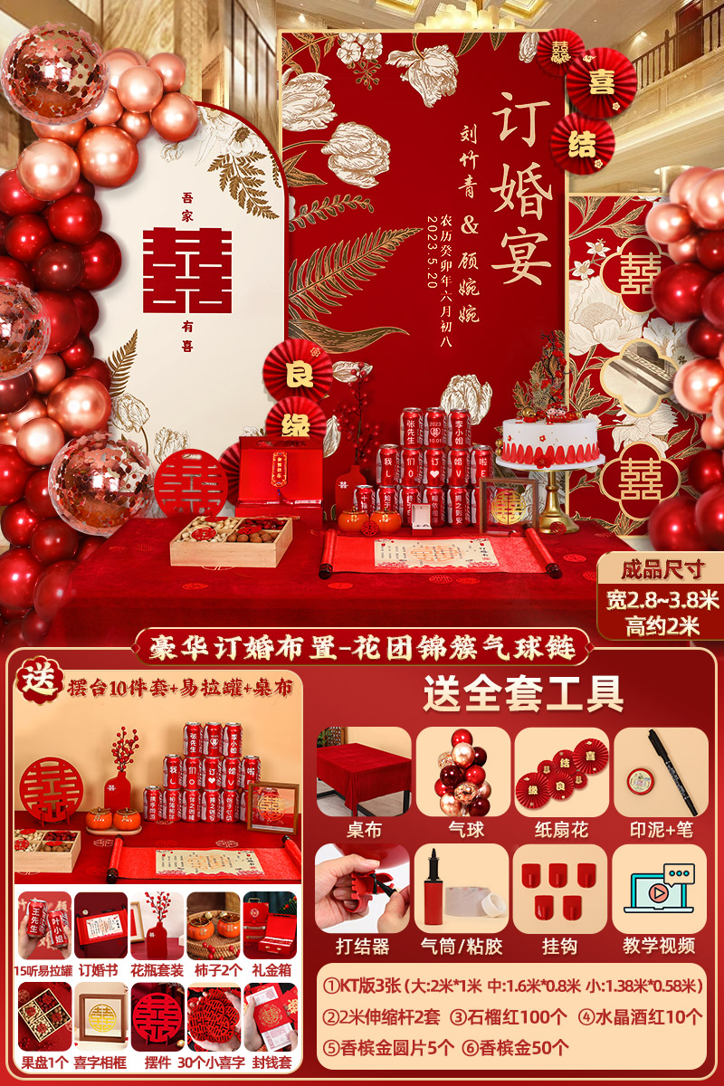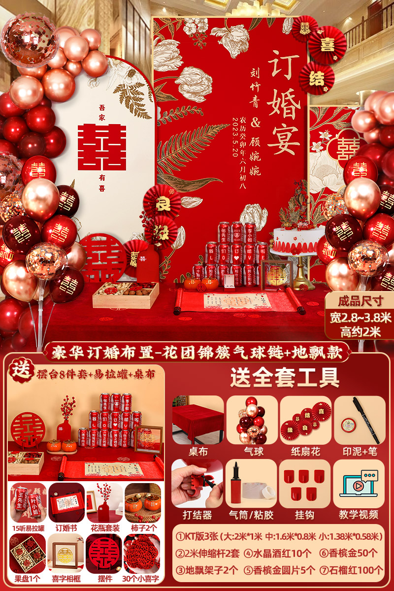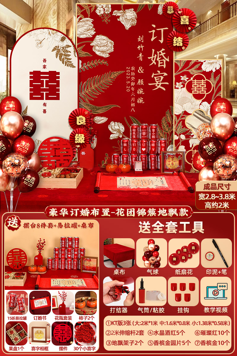 웨딩 연회 레이아웃 장식 전체 장면 그물 붉은 장식품 배경 벽 테이블 세트 패키지 kt 보드 용품스토어 가기