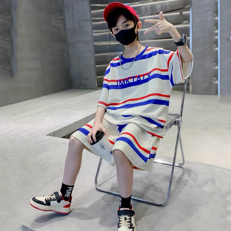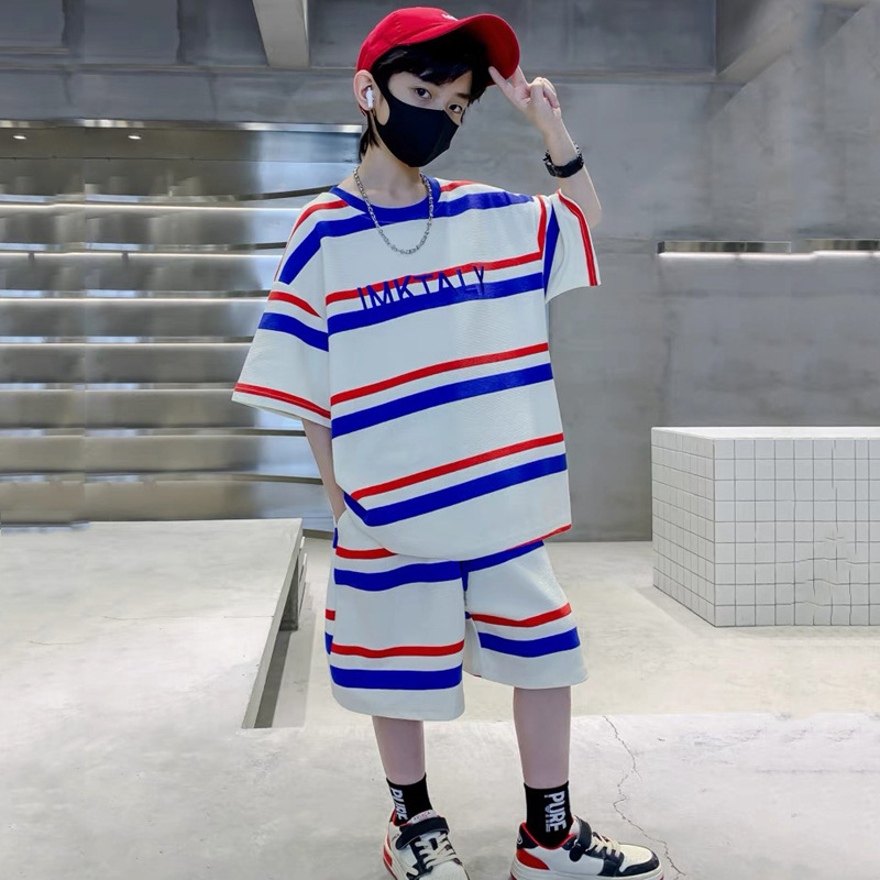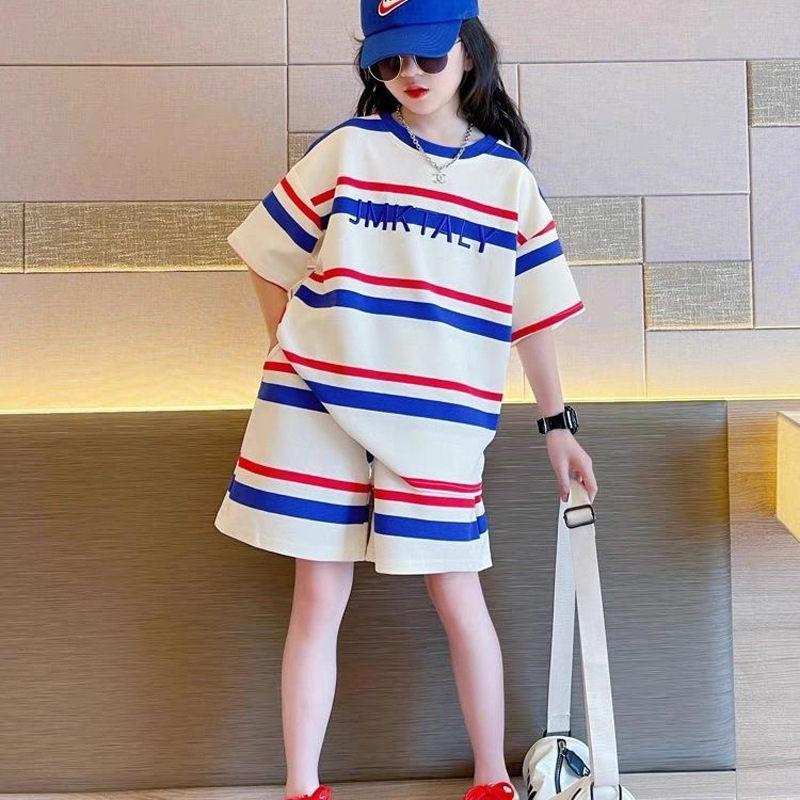 儿童夏季时尚潮范条纹短袖休闲套装男女童字母宽松T恤短裤两件套
