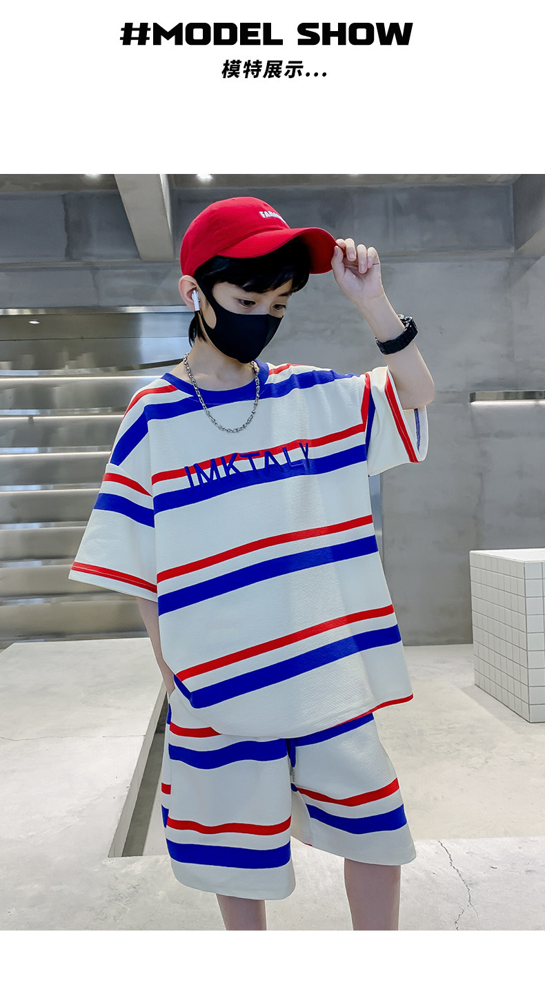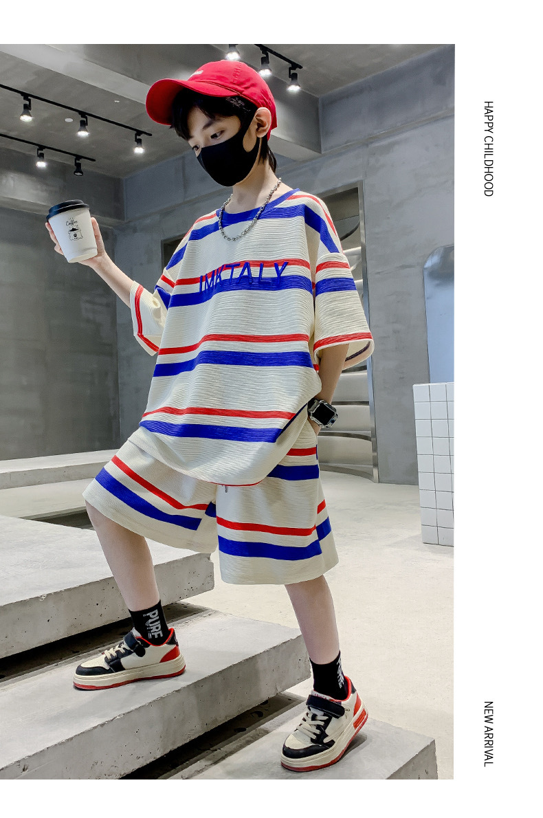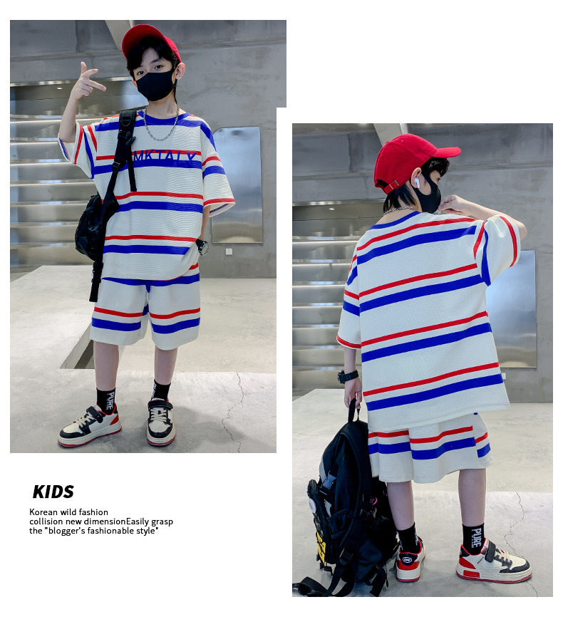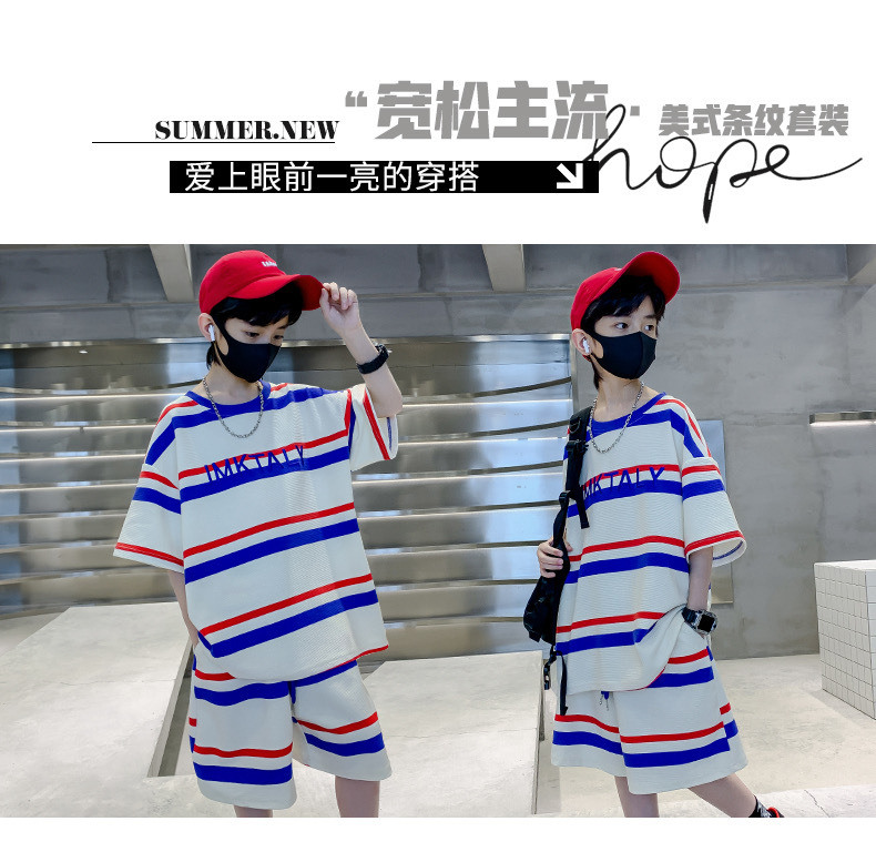 儿童夏季时尚潮范条纹短袖休闲套装男女童字母宽松T恤短裤两件套스토어 가기