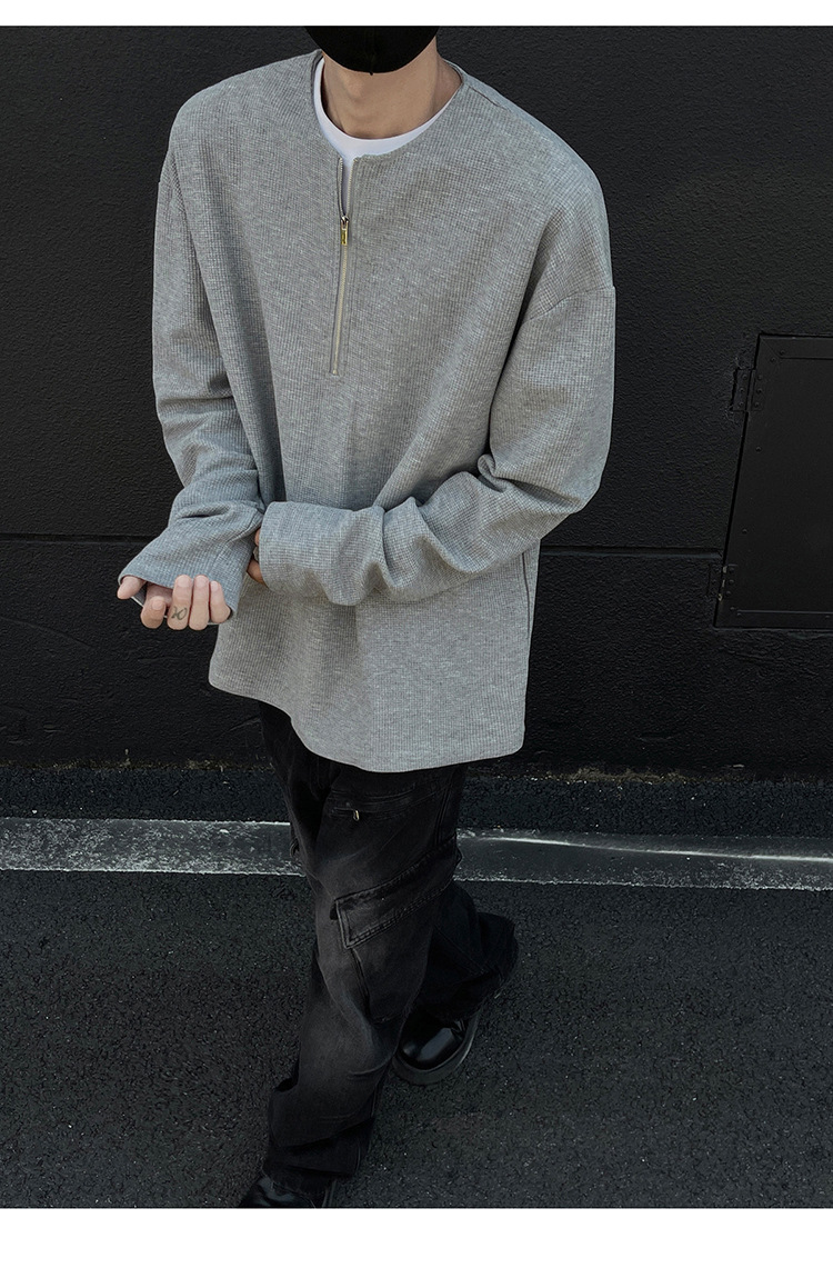 와플 반 지퍼 긴팔 티셔츠 남자 가을 패션 브랜드 미국 스타일 하이 스트리트 라운드 넥 스웨터 느슨한 캐주얼베이스 셔츠