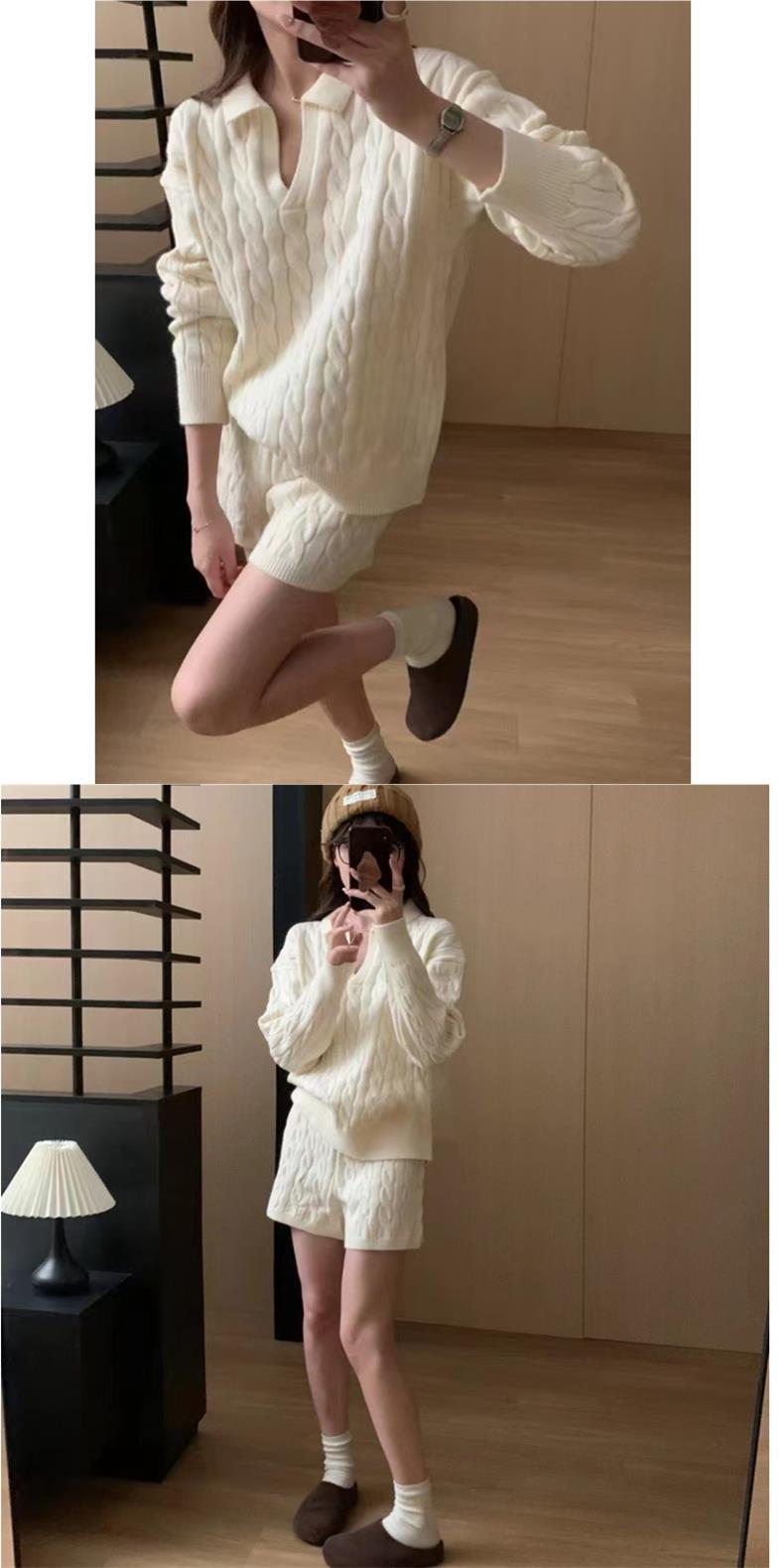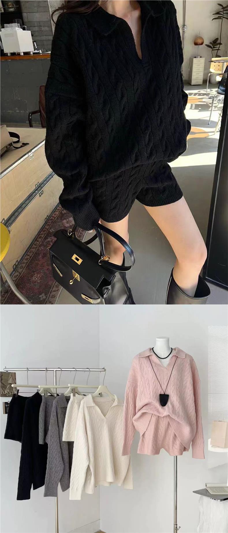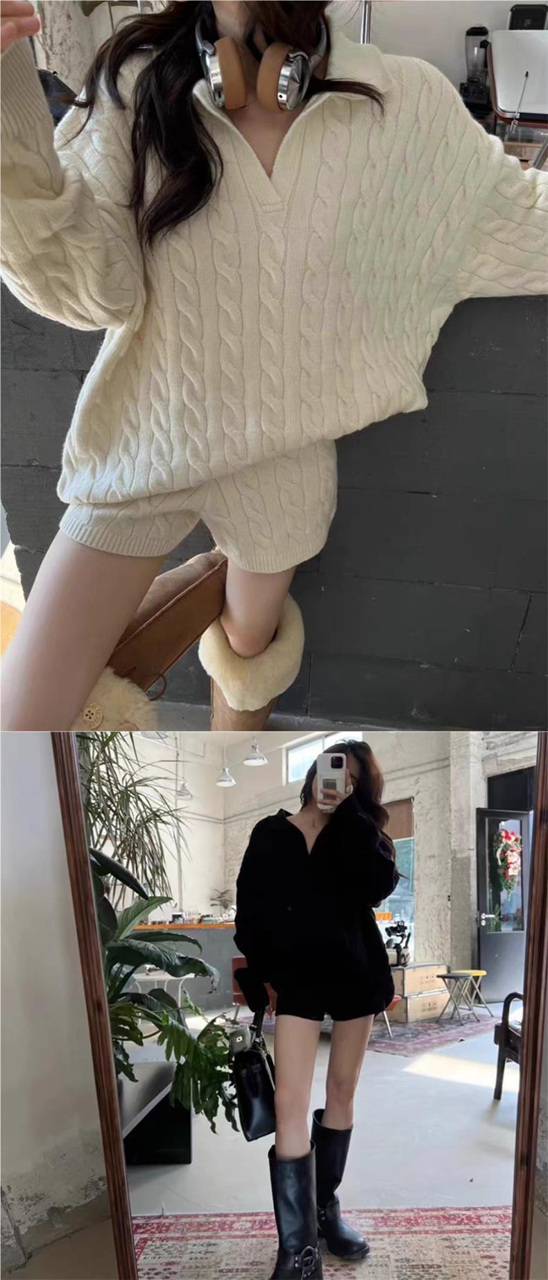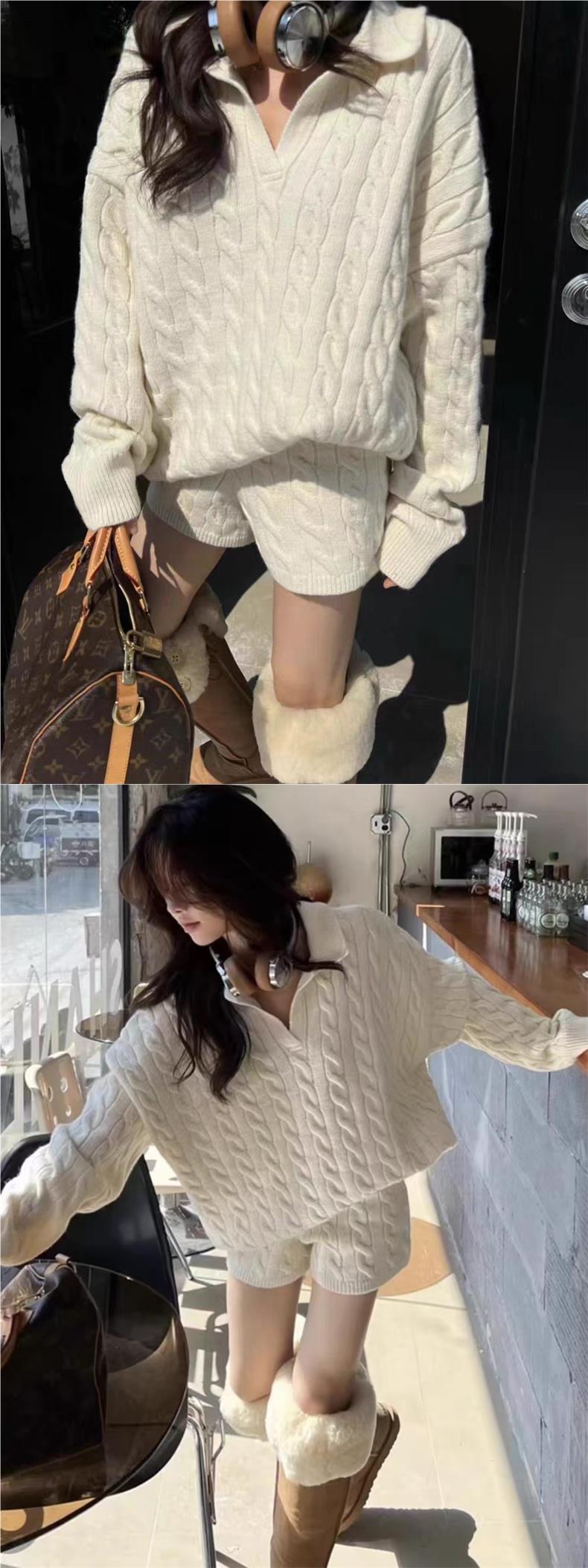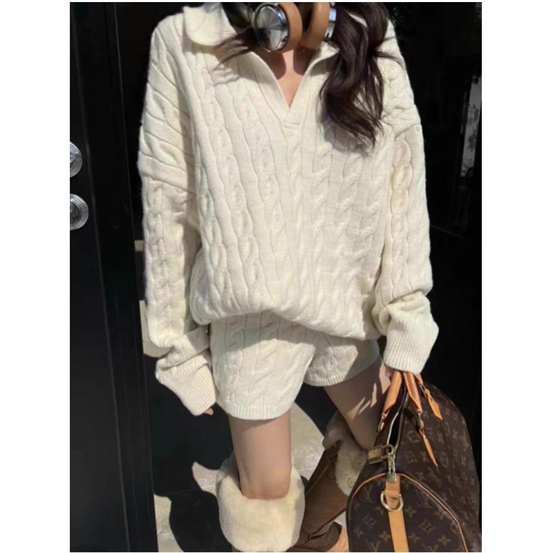 2024 겨울 새로운 게으른 스타일 폴로 칼라 니트 스웨터 풀오버 스웨터 캐주얼 반바지 세트 여성 가을 겨울스토어 가기
