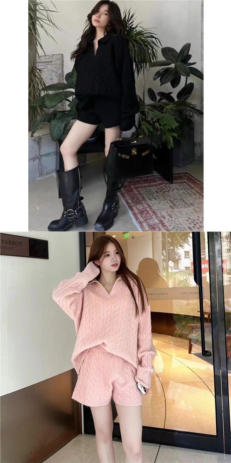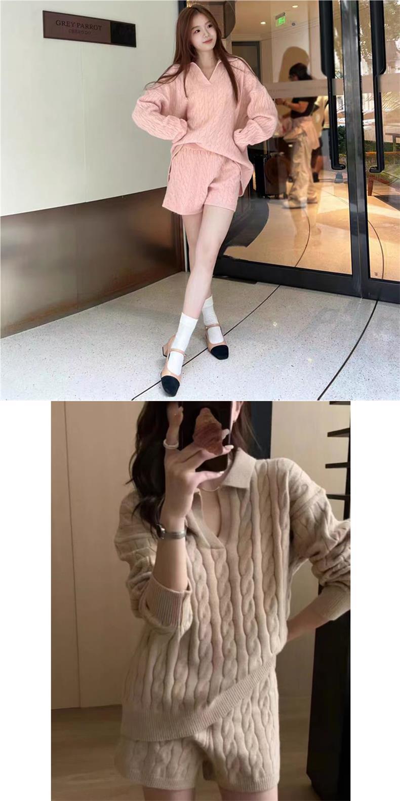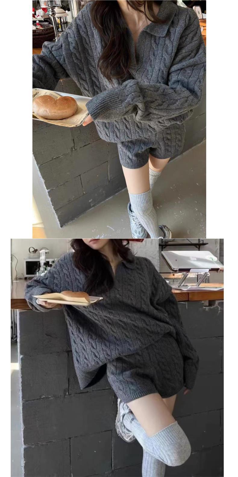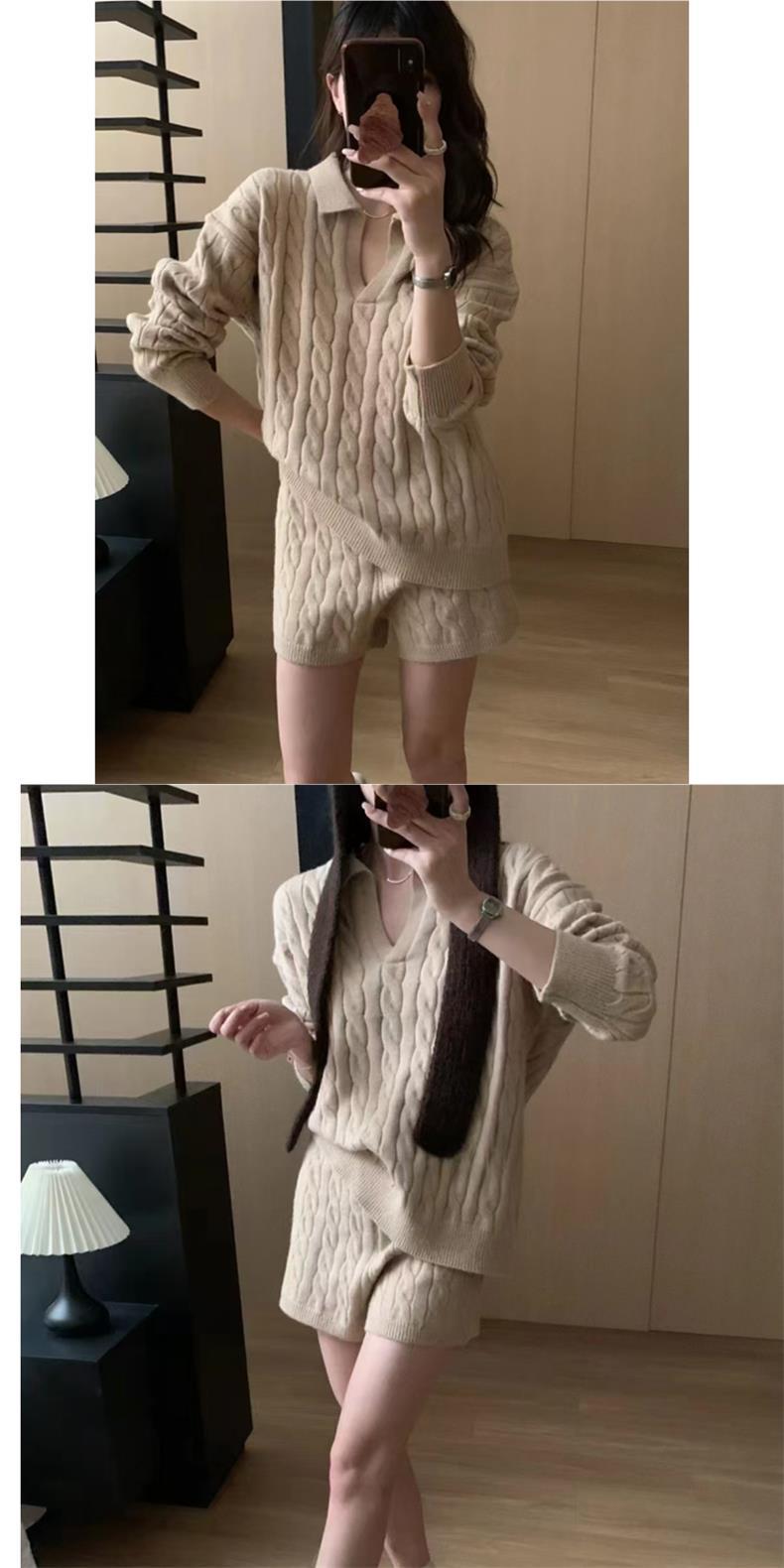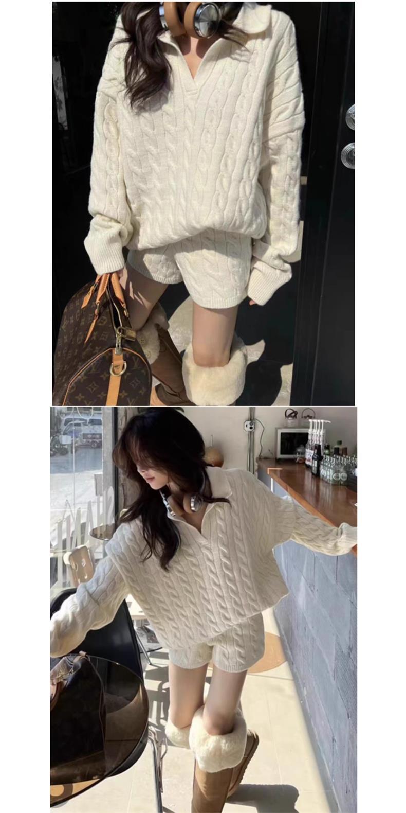 2024 겨울 새로운 게으른 스타일 폴로 칼라 니트 스웨터 풀오버 스웨터 캐주얼 반바지 세트 여성 가을 겨울스토어 가기