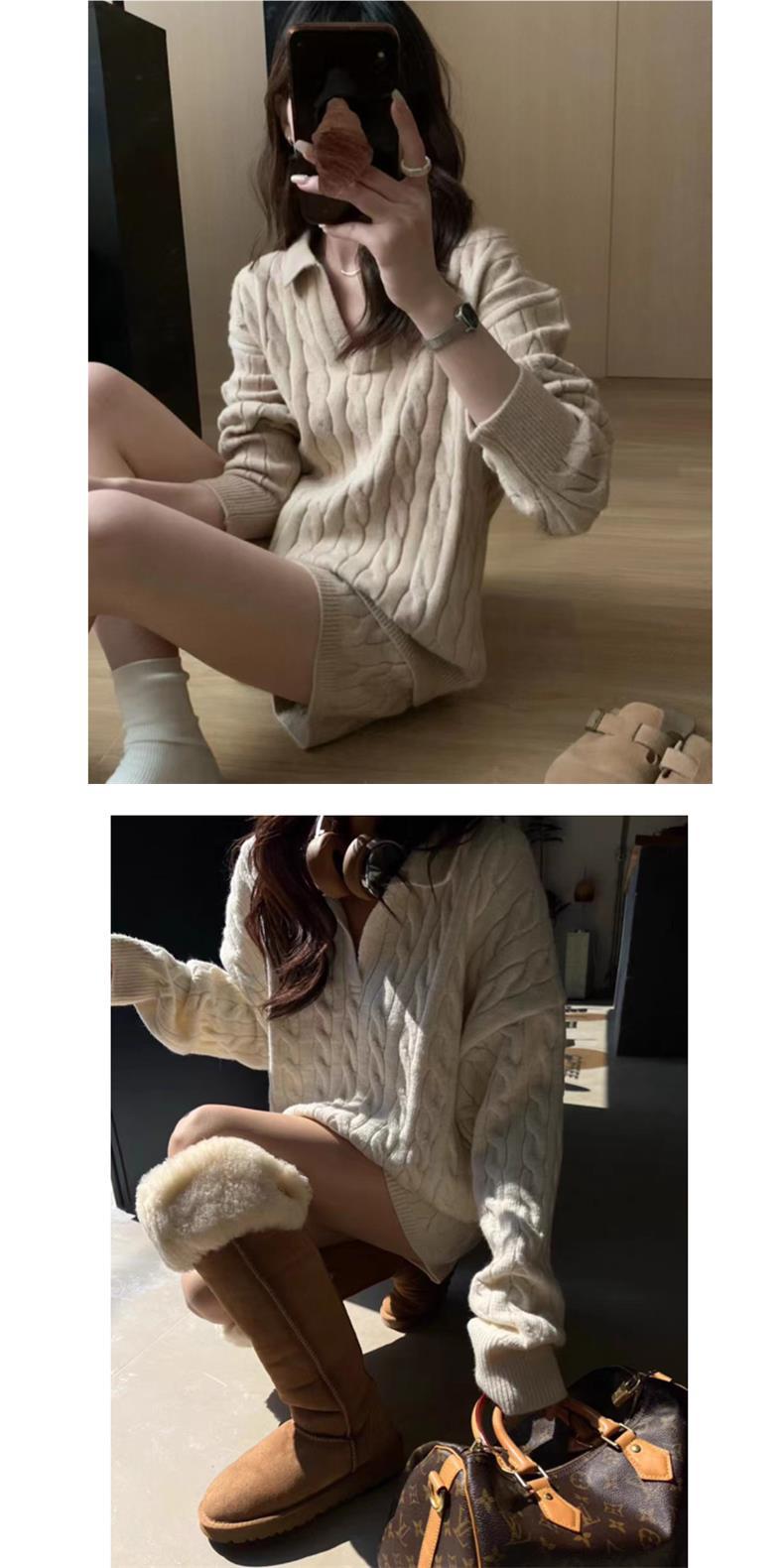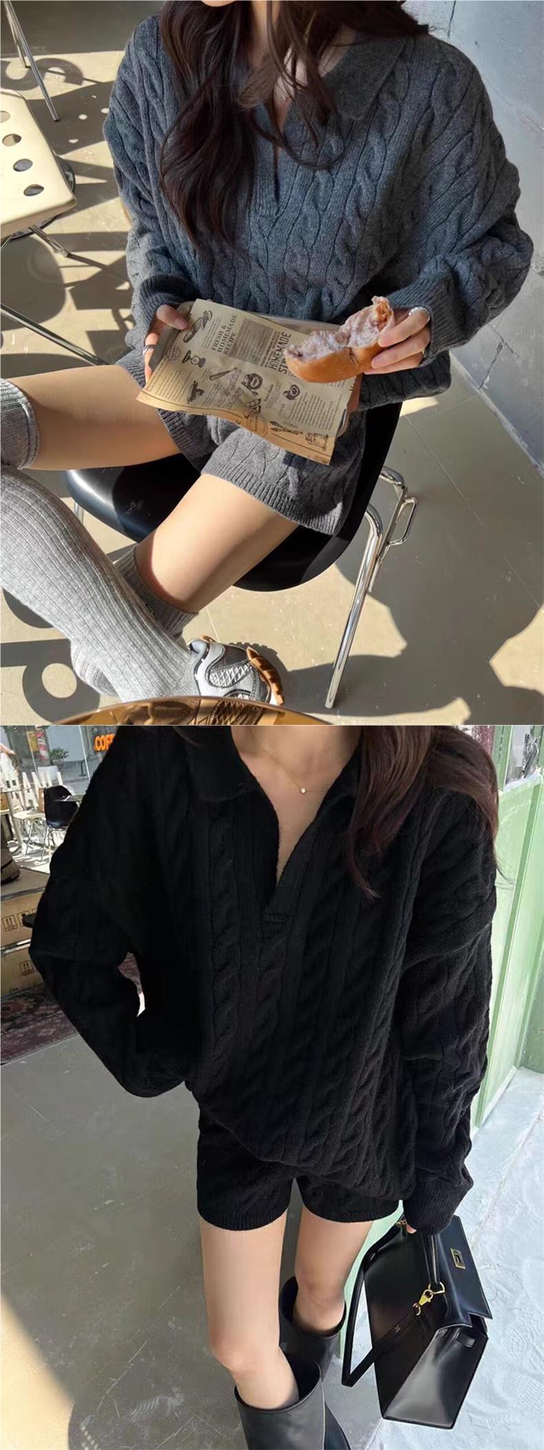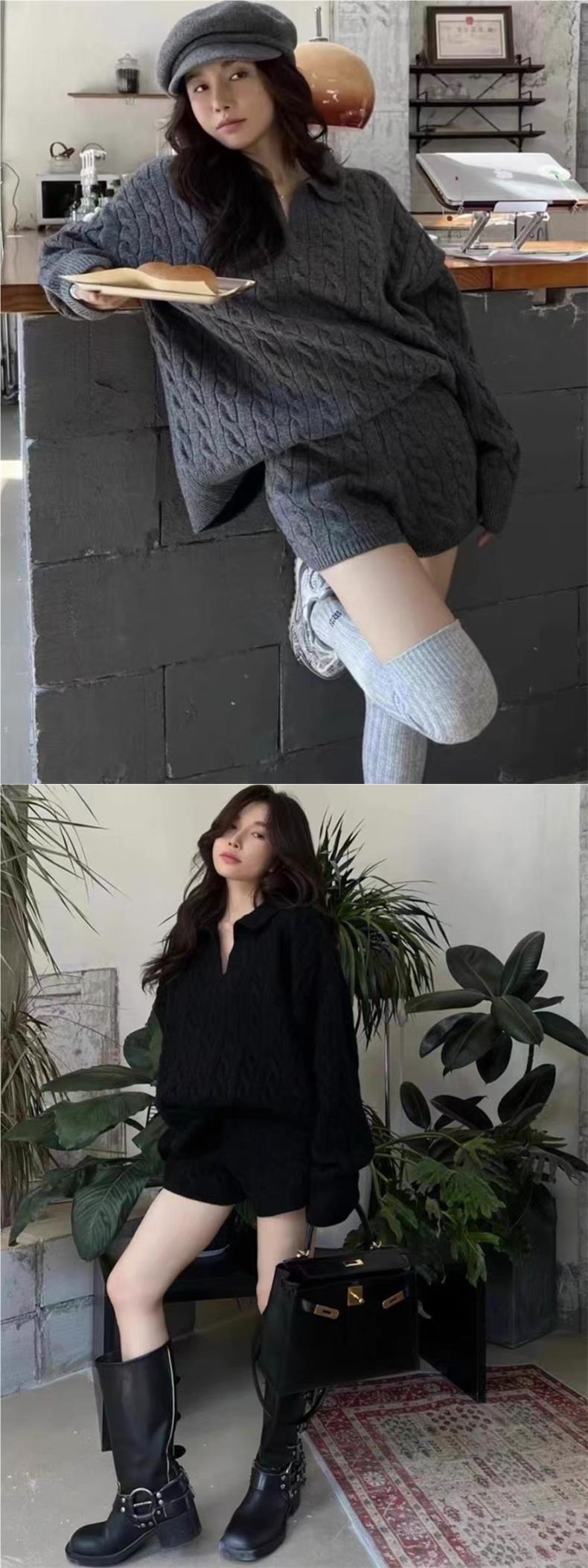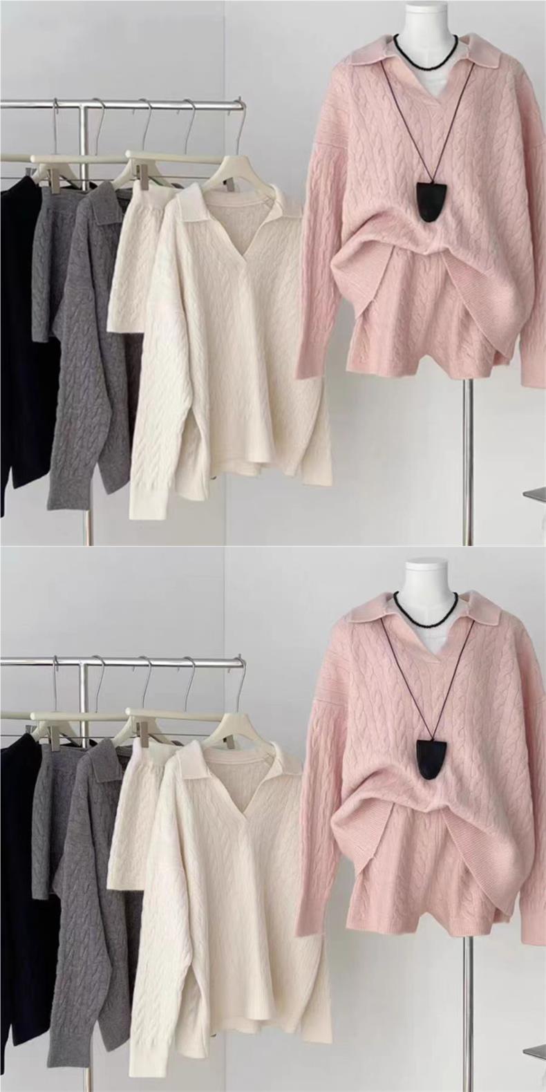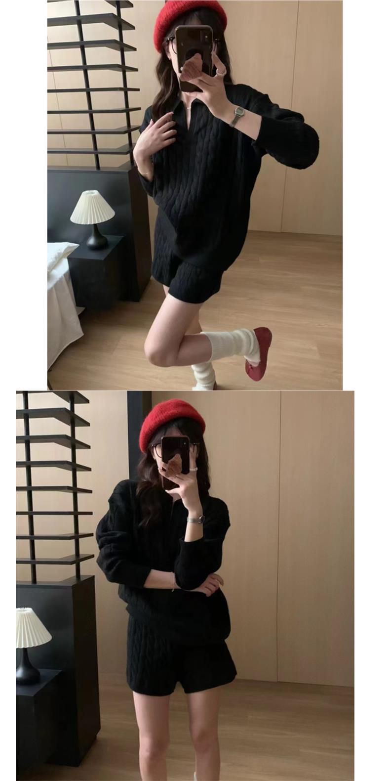 2024 겨울 새로운 게으른 스타일 폴로 칼라 니트 스웨터 풀오버 스웨터 캐주얼 반바지 세트 여성 가을 겨울스토어 가기