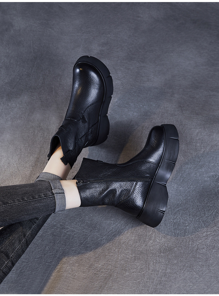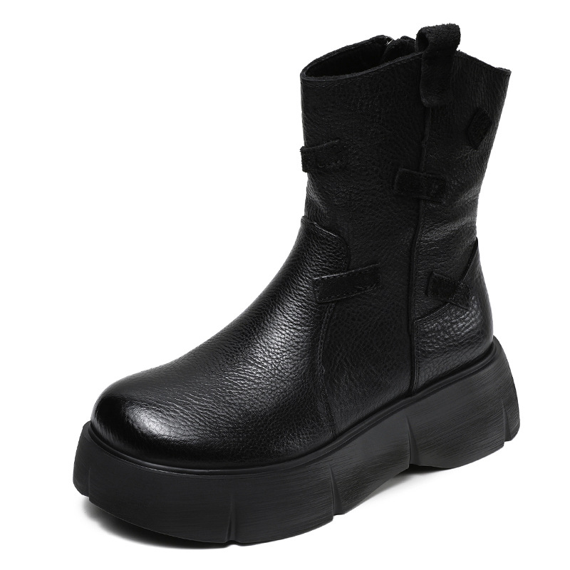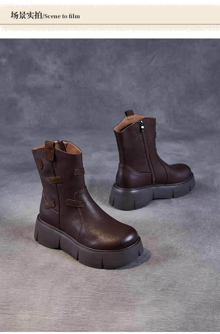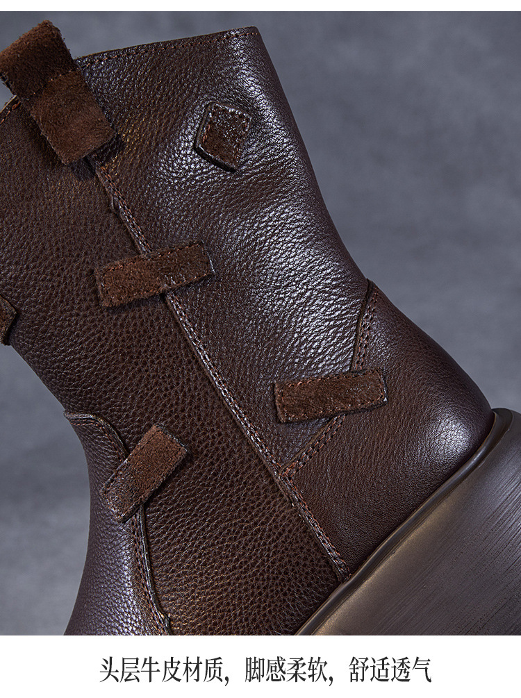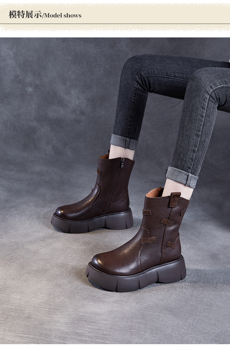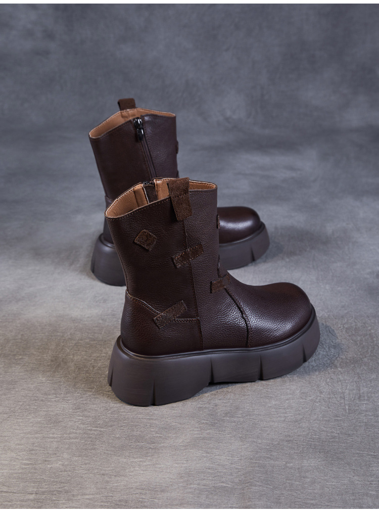 미드 부츠 여성 가을 및 겨울 새로운 정품 가죽 패션 올 매치 나이트 부츠 두꺼운 밑창 캐주얼 거지 패치 마틴 부츠