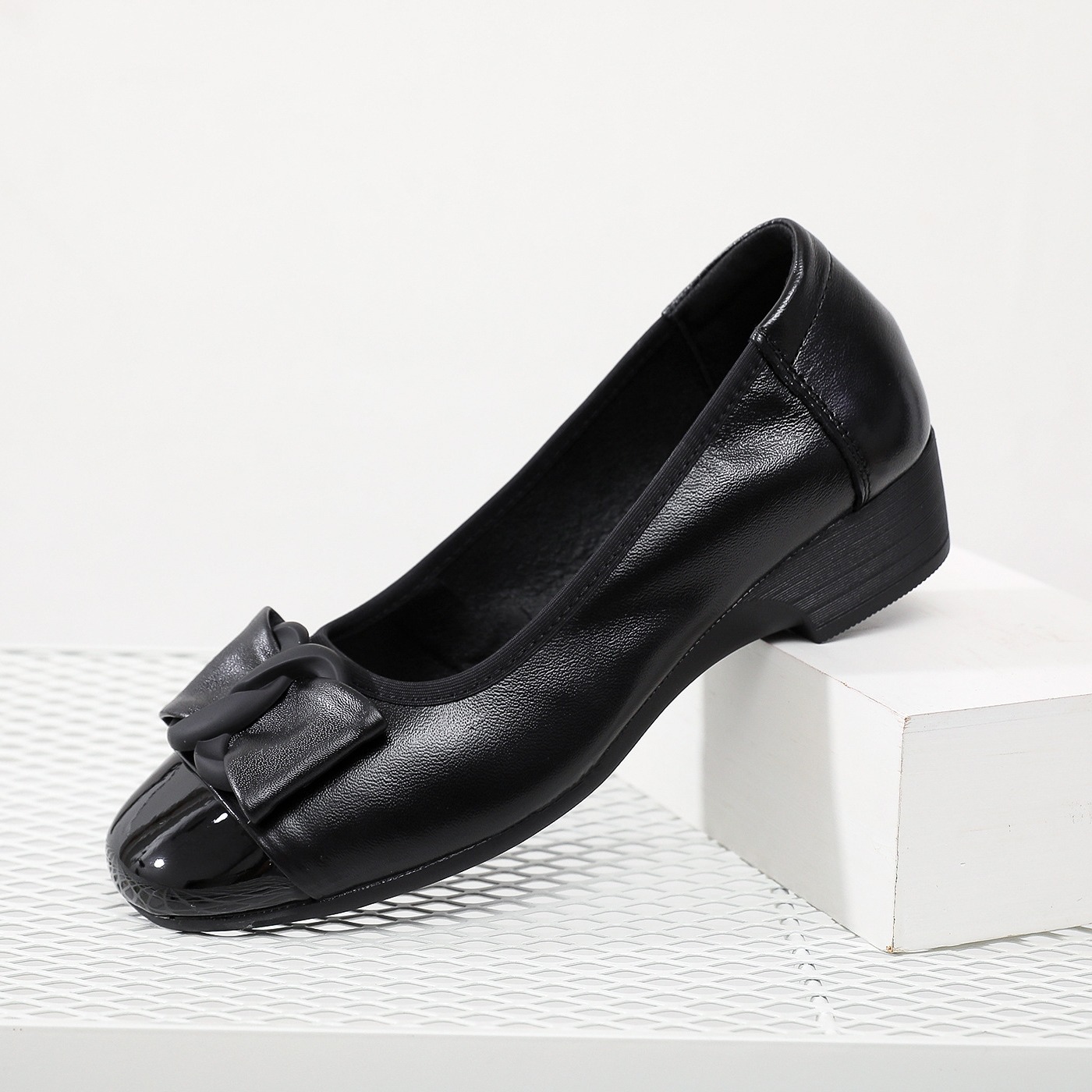 정품 가죽 얕은 두꺼운 힐 여성용 싱글 슈즈 로우 탑 소프트 솔 캐주얼 라운드 발가락 콩 탑 레이어 Cowhide 로우 힐 엄마 신발스토어 가기