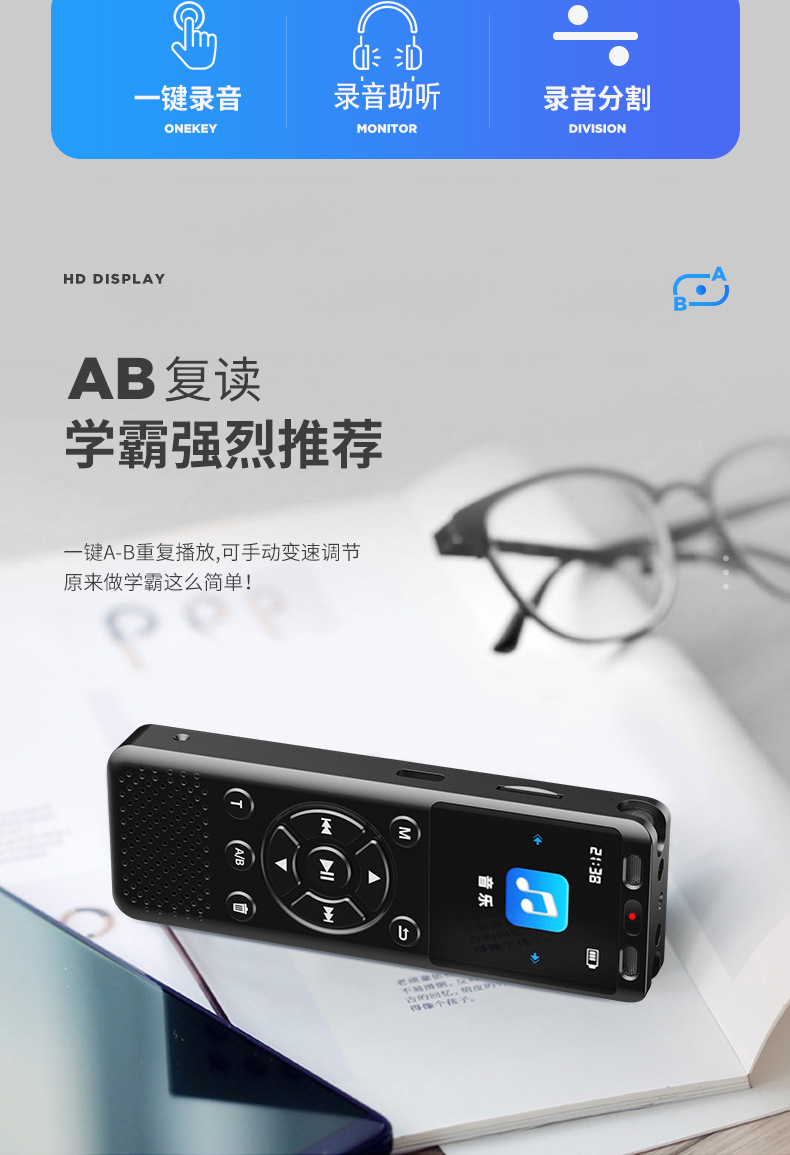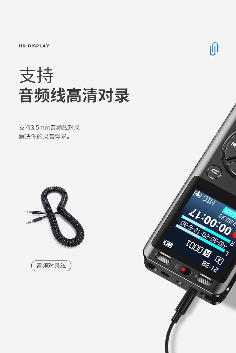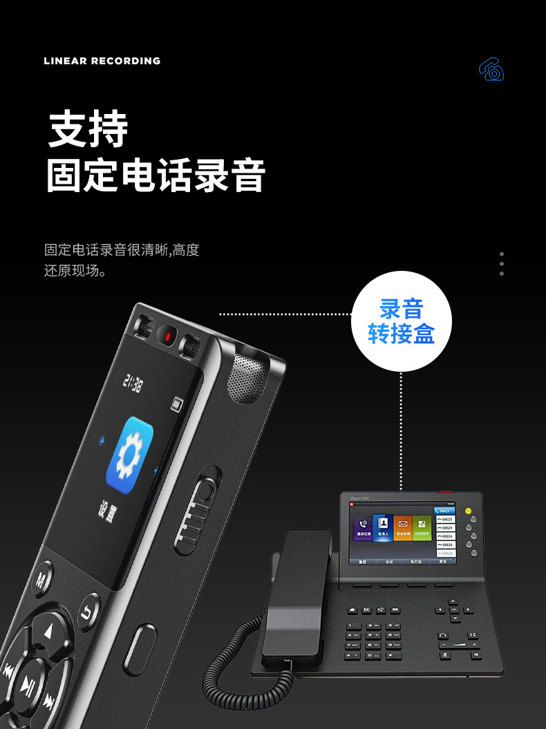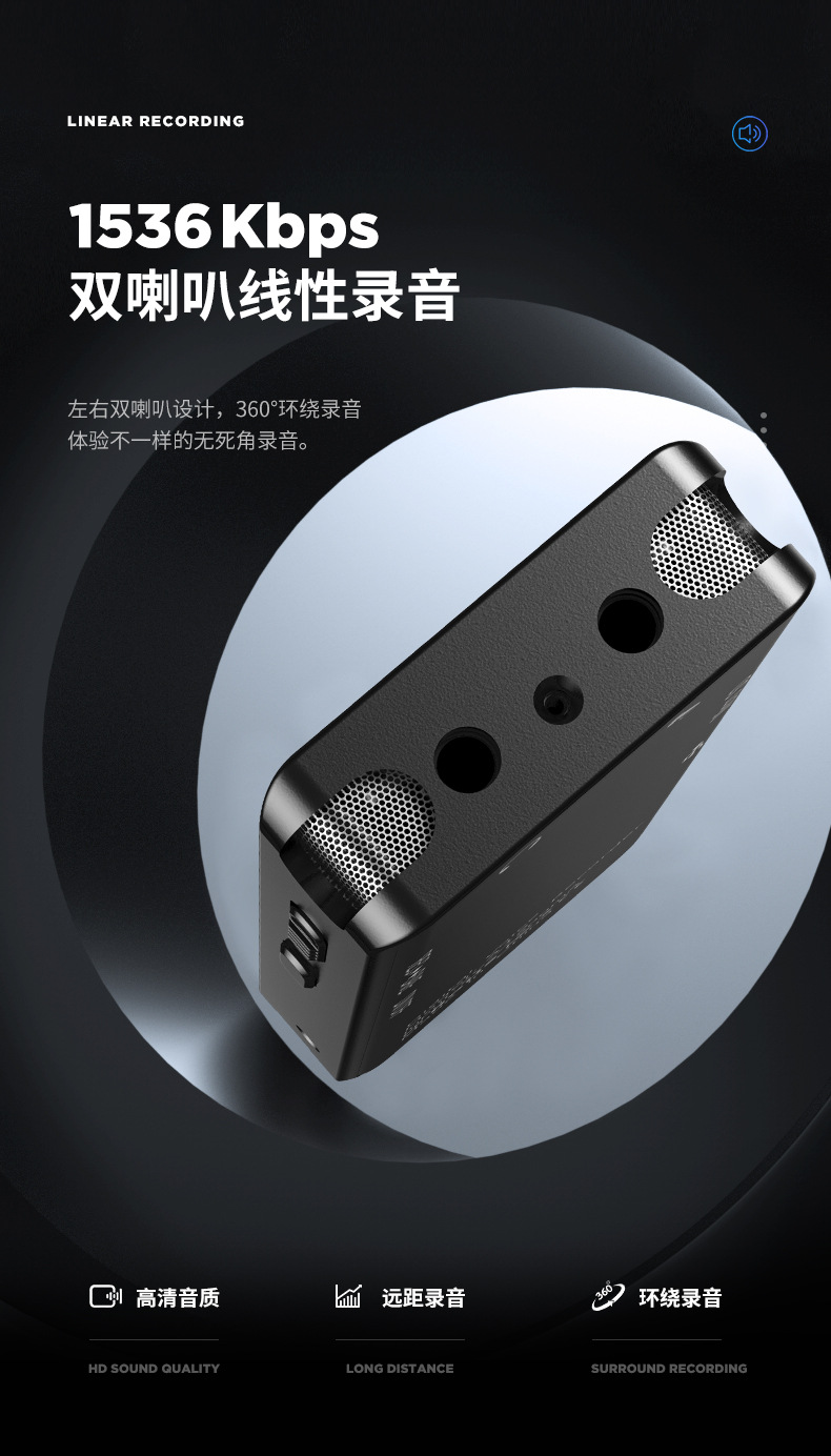 ●采用专业录音笔降噪芯片,支持高清无损线性录音1536Kbps。