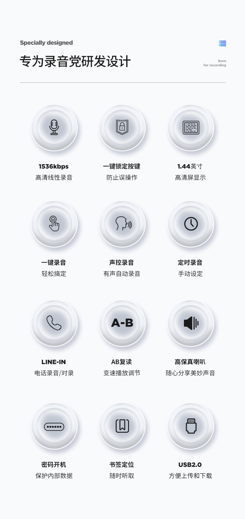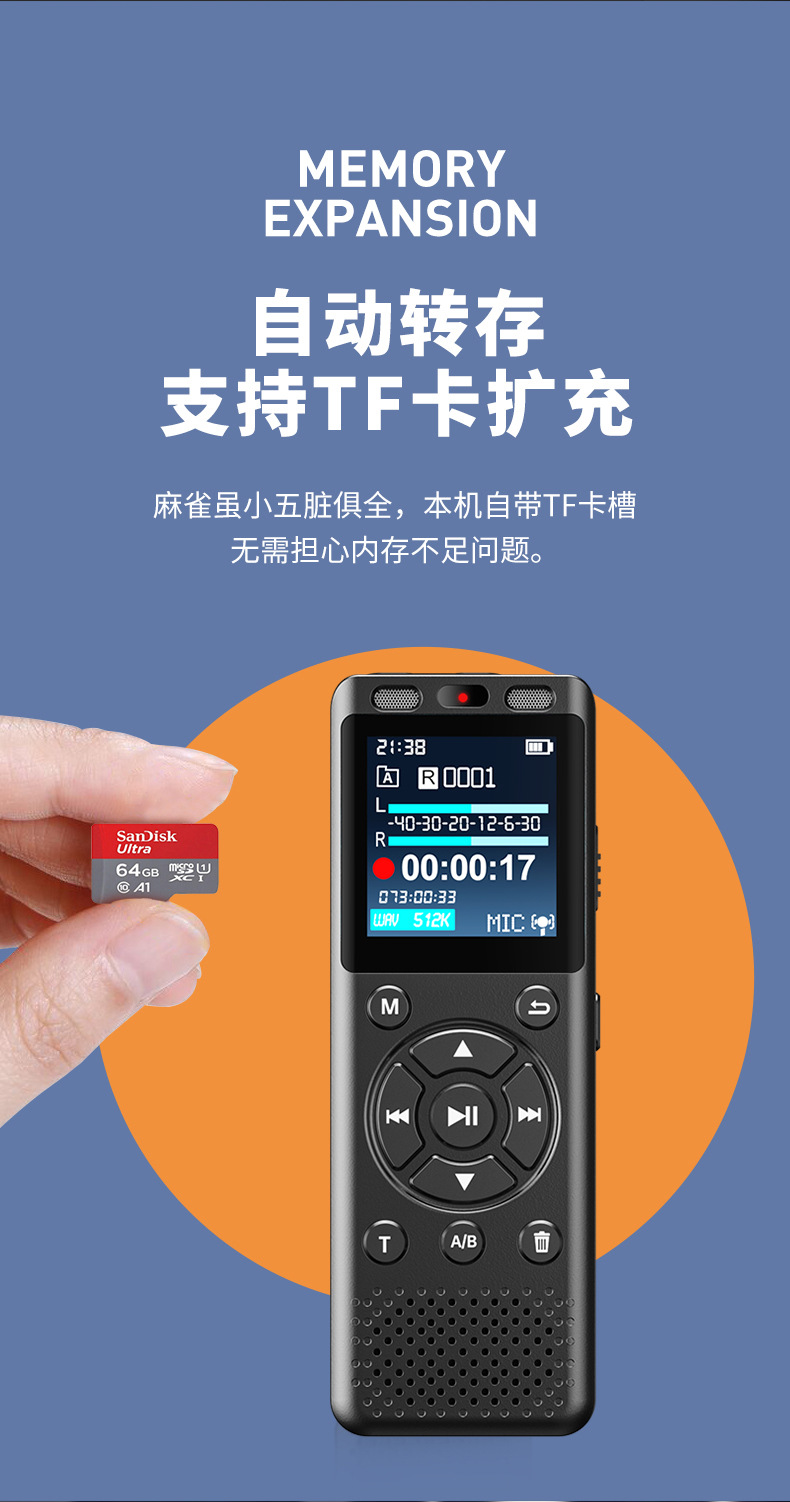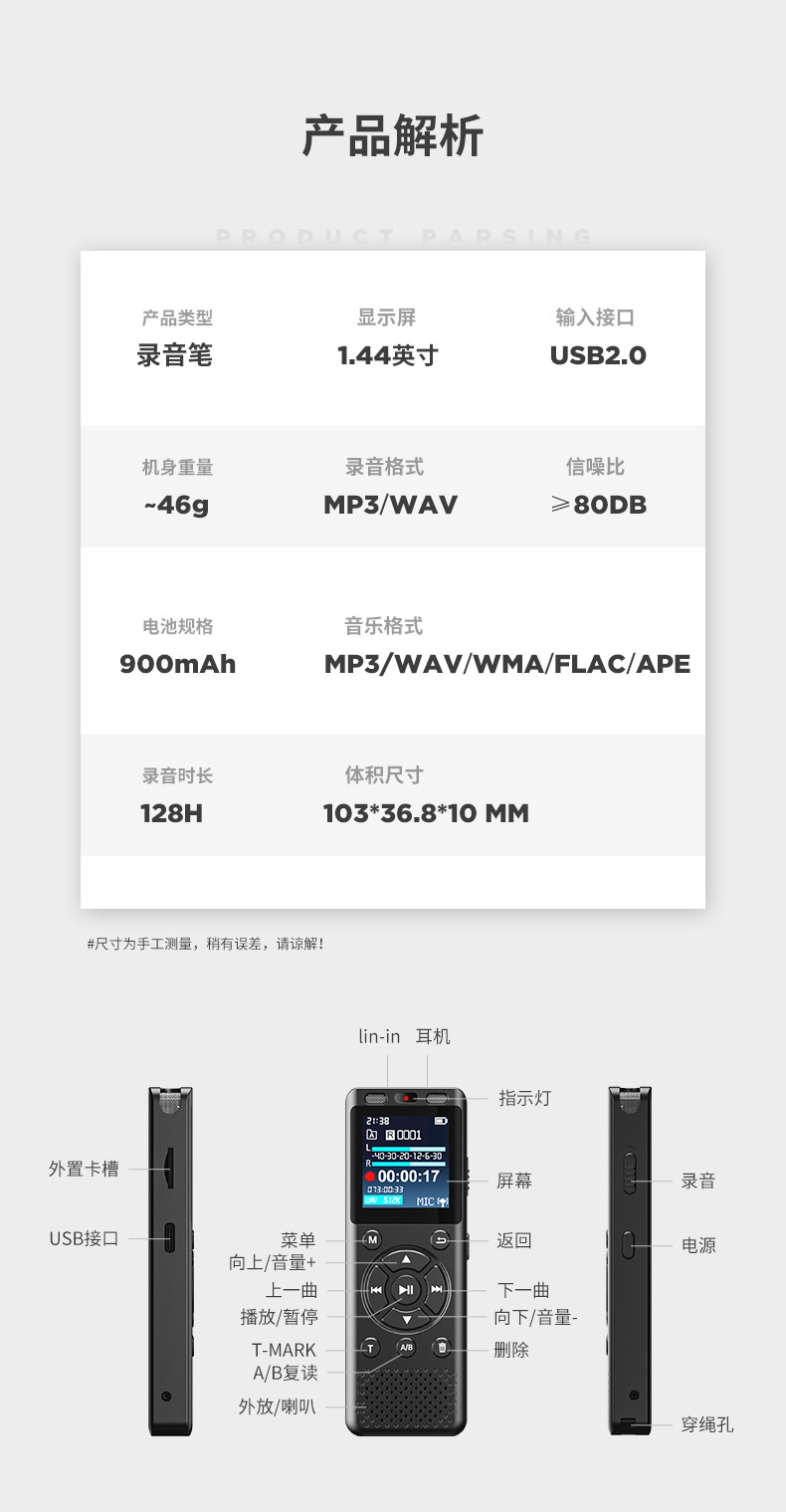 ●采用专业录音笔降噪芯片,支持高清无损线性录音1536Kbps。