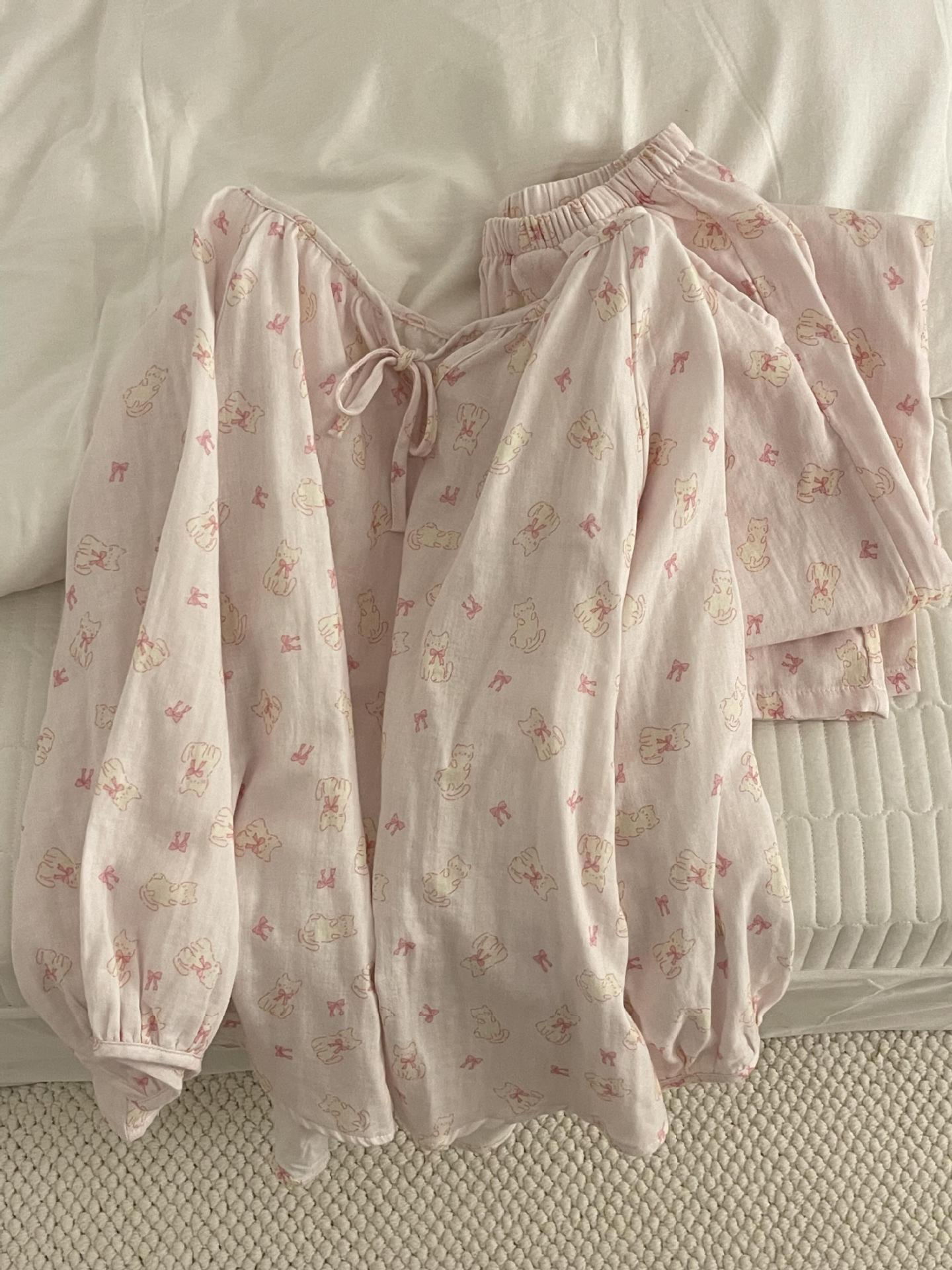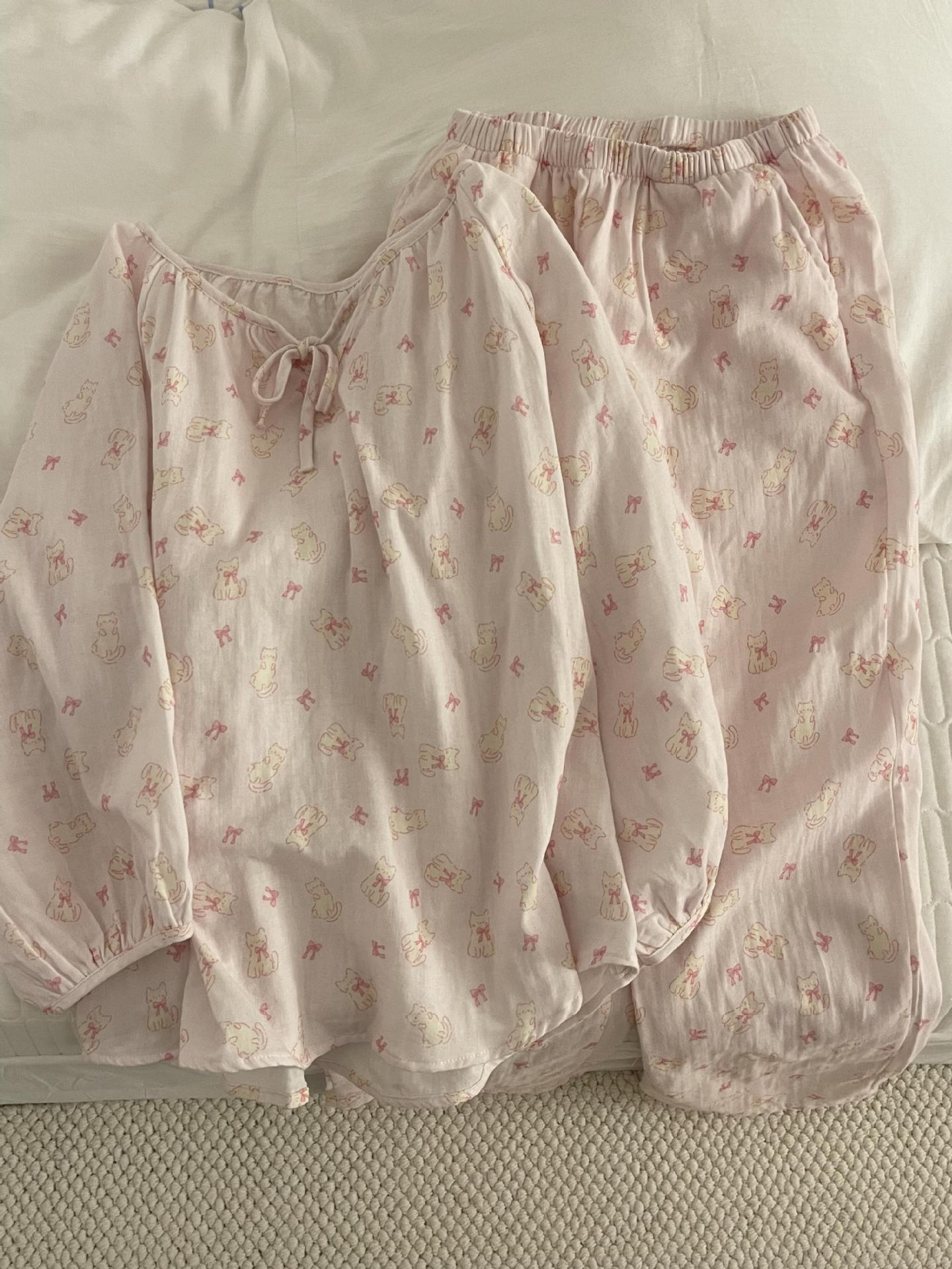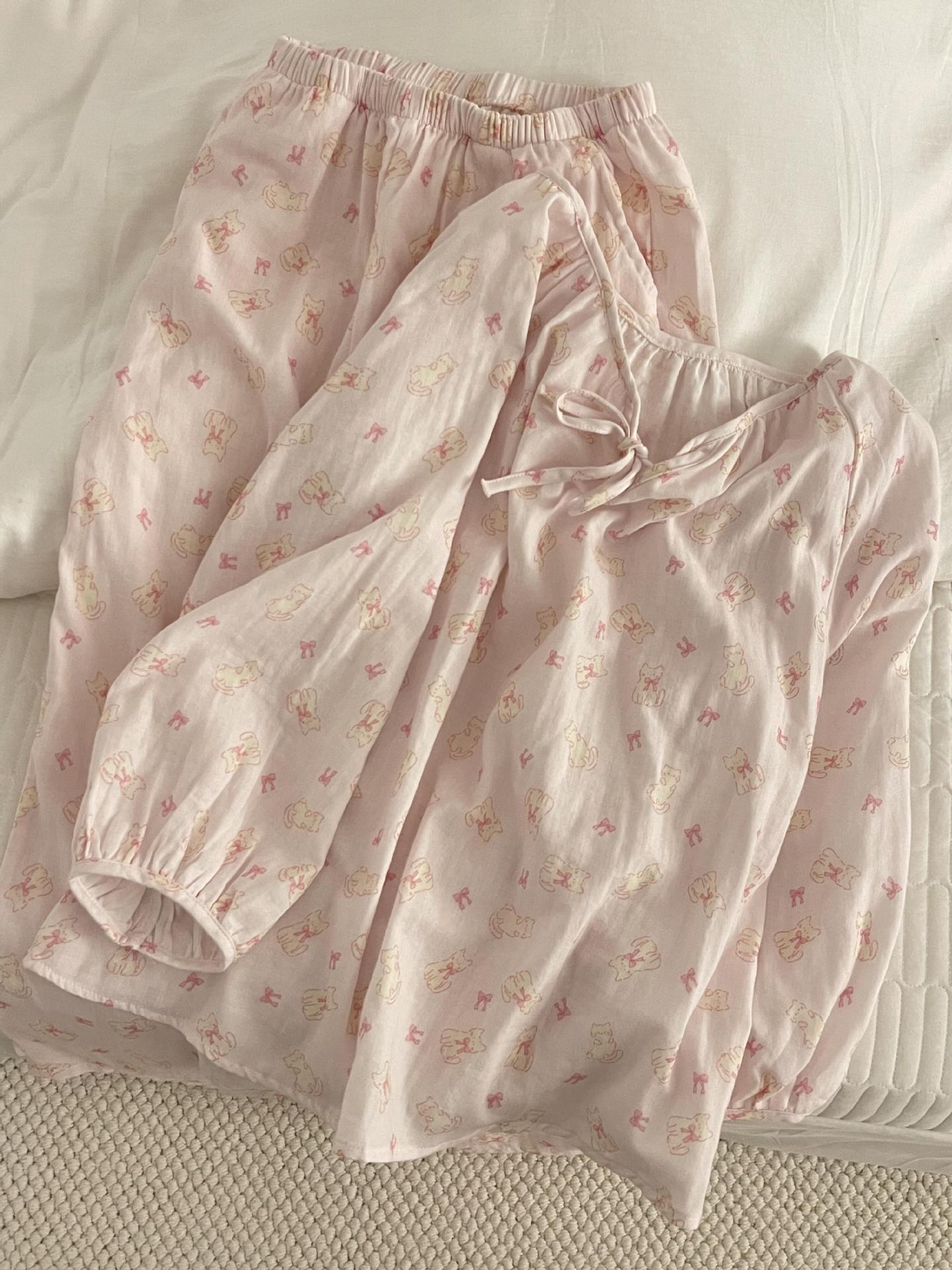 여성을위한 한국어 버전 귀여운 새끼 고양이 만화 프린트 잠옷 봄, 가을 바지 대형 느슨한 홈웨어 세트는 외부에 착용 가능스토어 가기