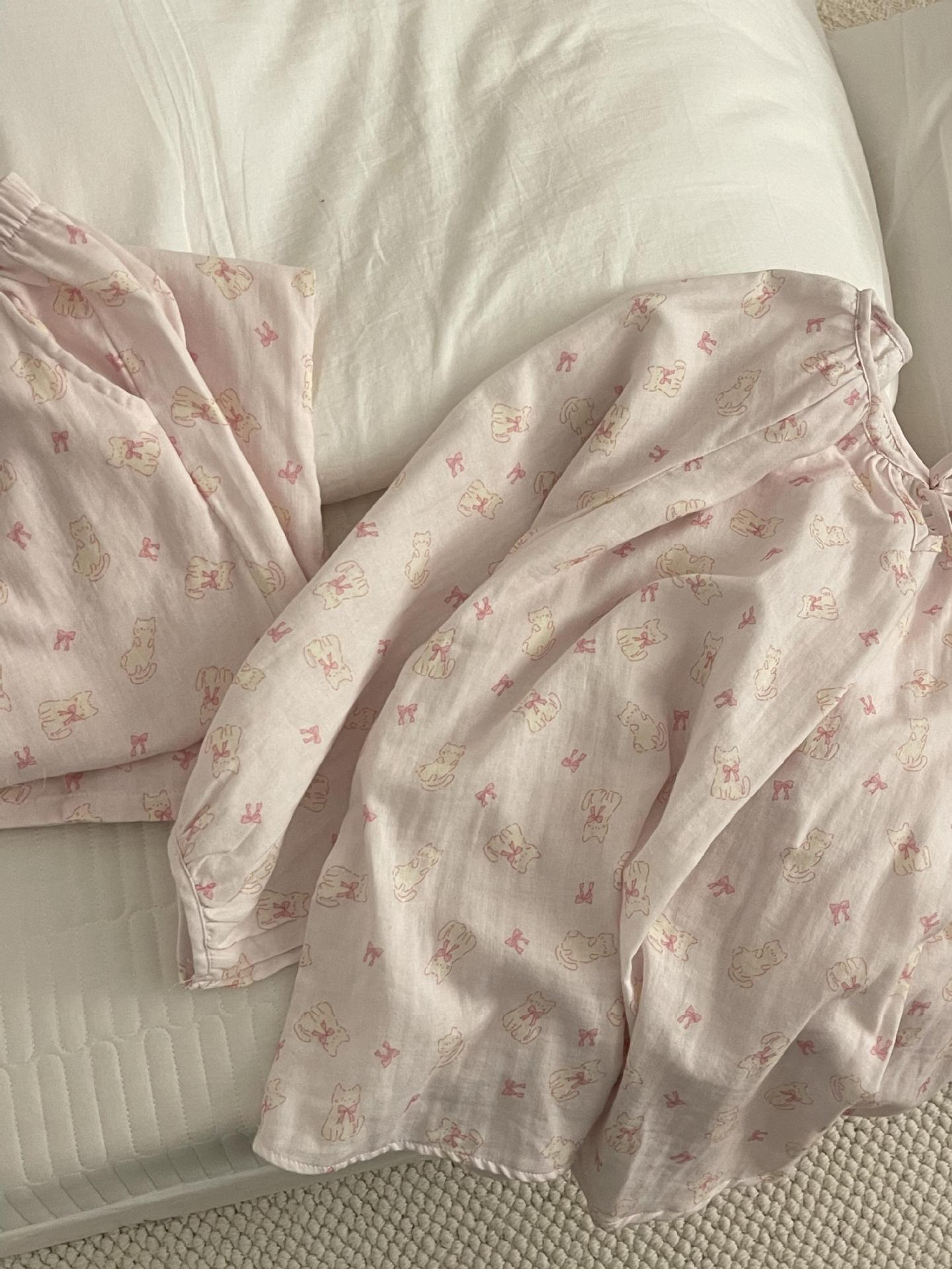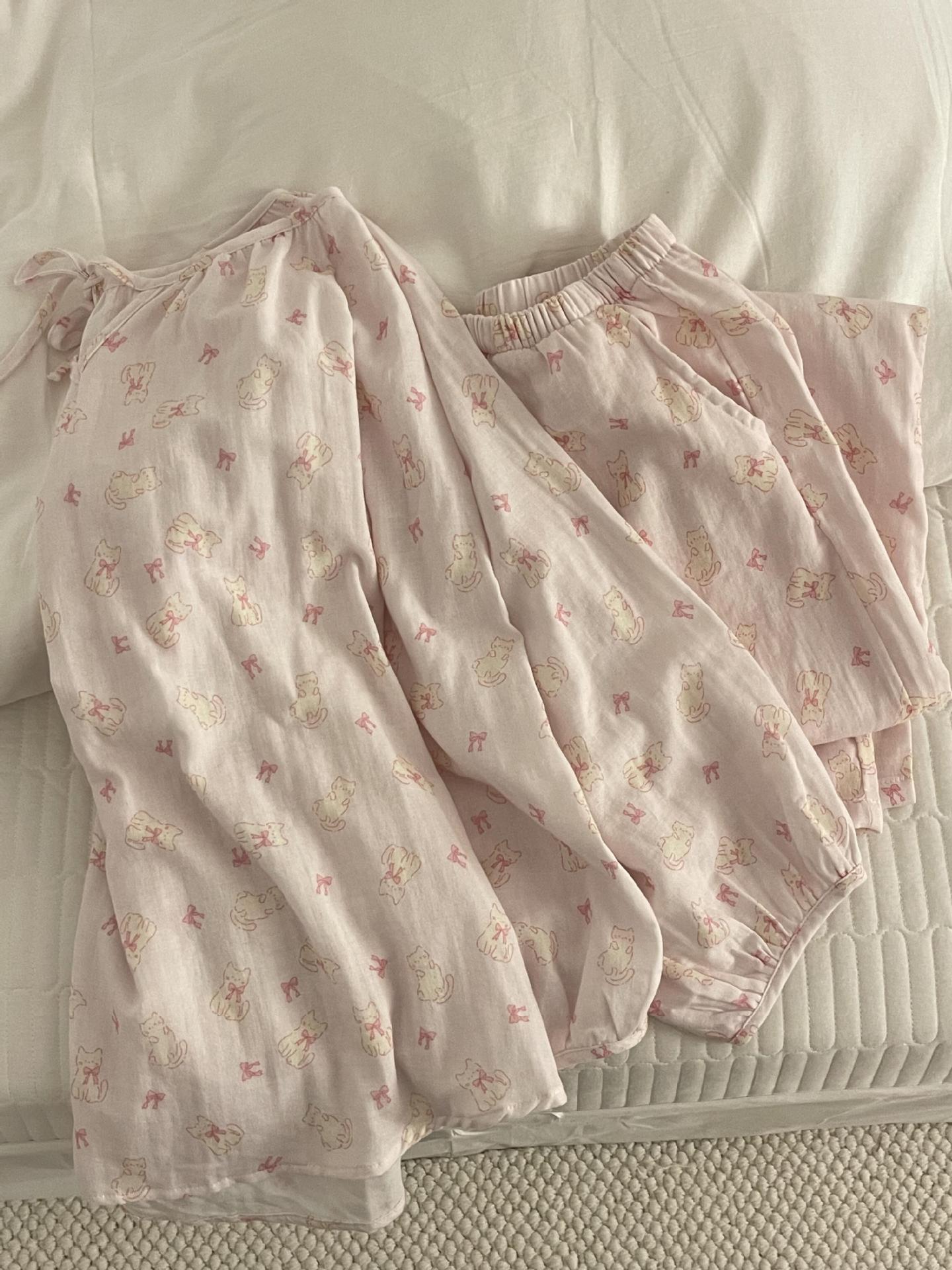 • 라이트 핑크 귀여운 만화 새끼 고양이 긴 소매와 바지