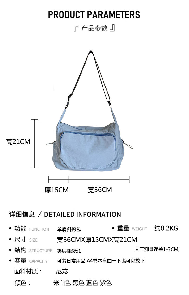 한국 스타일 유행 나일론 어깨 가방 2024 새로운 올 매치 캐주얼 단순 어깨 가방 대용량 경량 크로스 바디 백