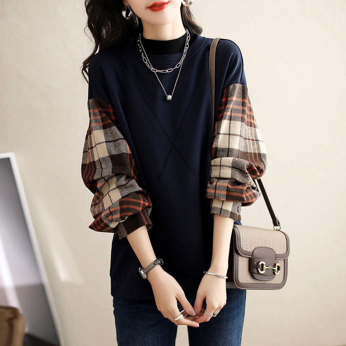 비 필링 라운드 넥 기모 스웨터 여성 2024 후드 새로운 유행 레트로 플레이드 가짜 2 피스 탑스토어 가기