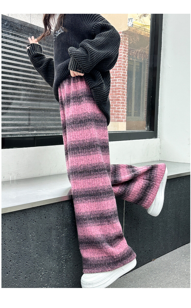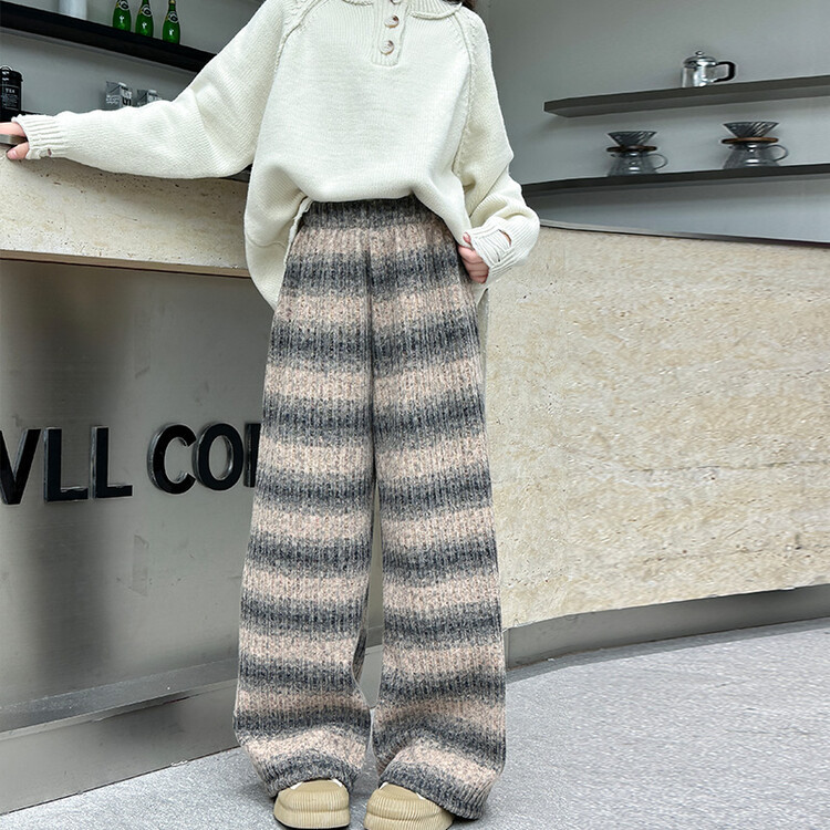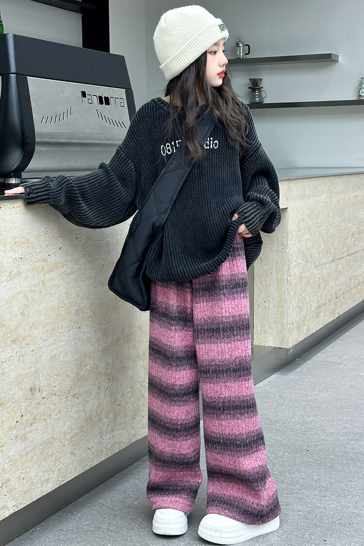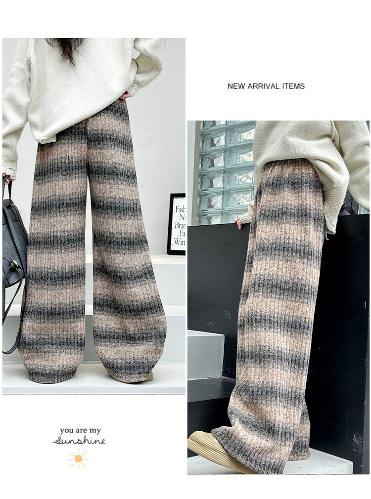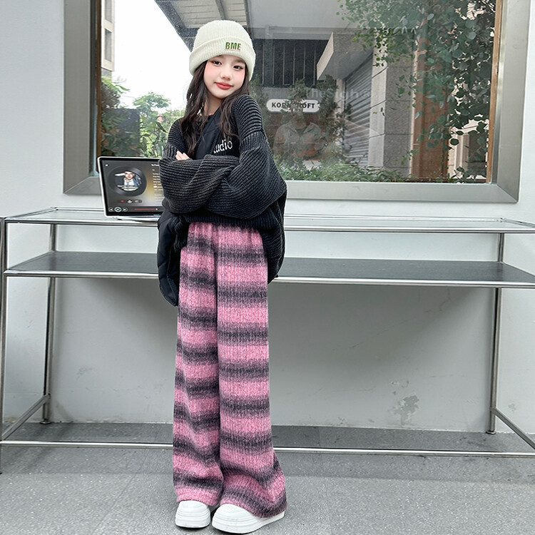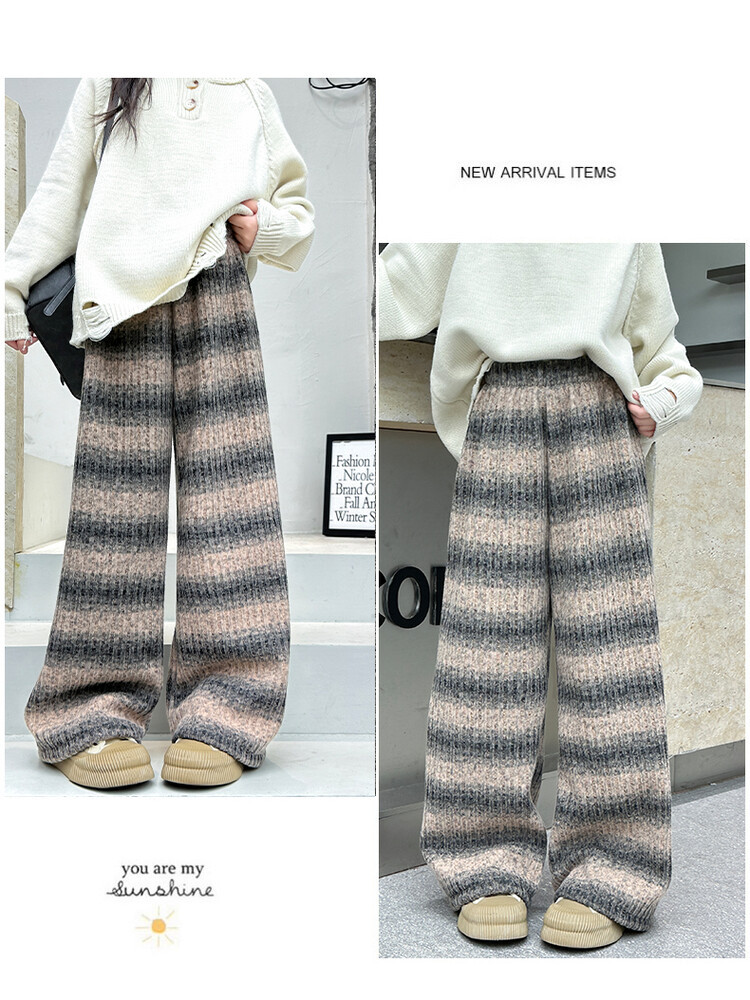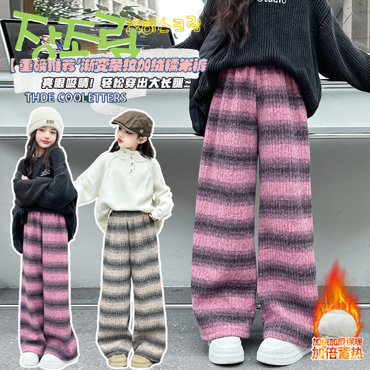 소녀 기모 찹쌀 바지 2024 가을/겨울 새로운 니트 소프트 왁스 염색 스트라이프 넓은 다리 바지