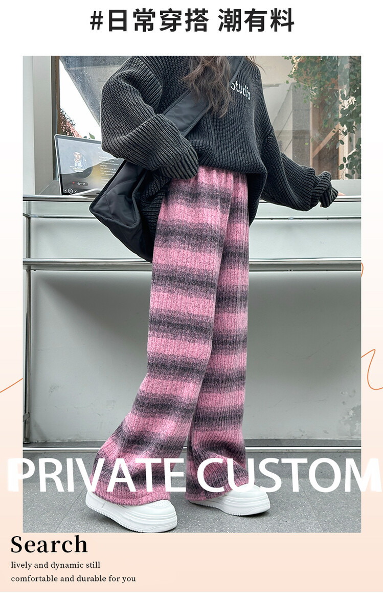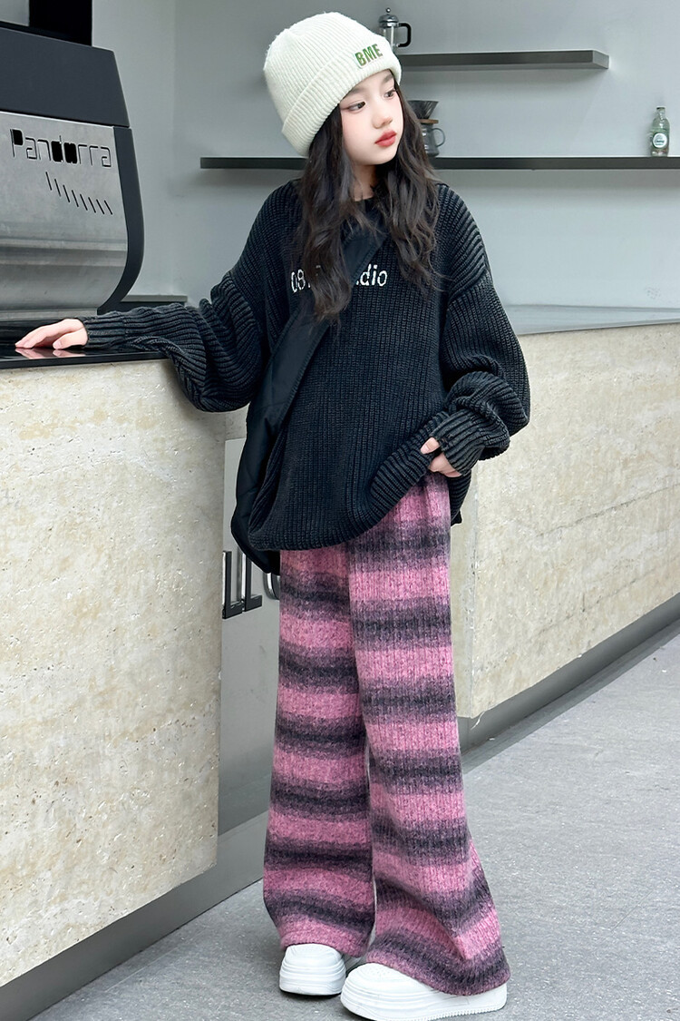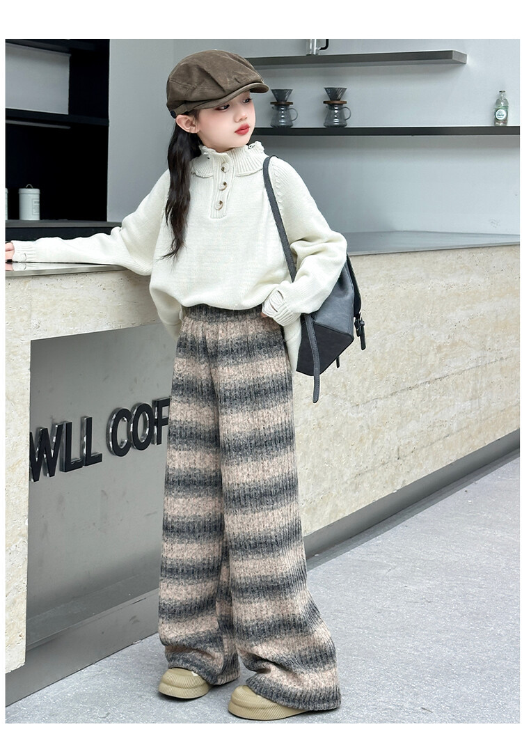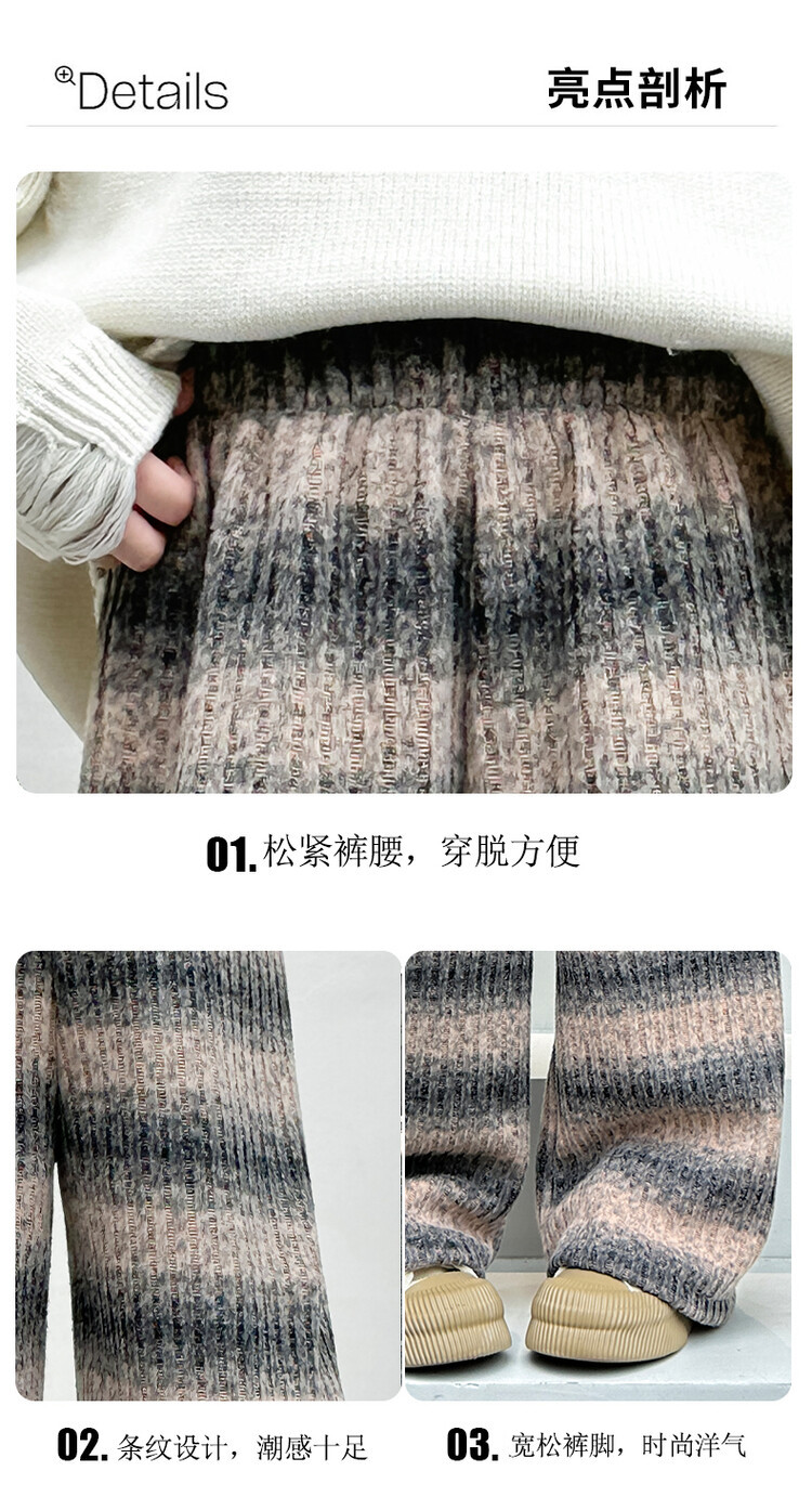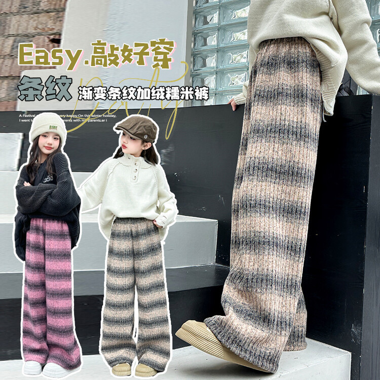 소녀 기모 찹쌀 바지 2024 가을/겨울 새로운 니트 소프트 왁스 염색 스트라이프 넓은 다리 바지