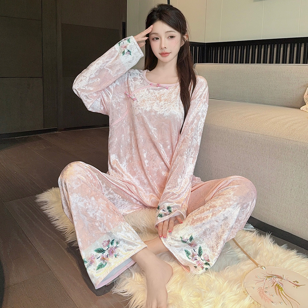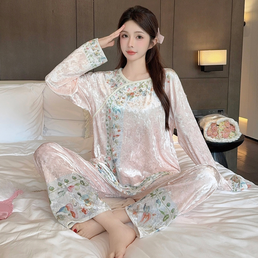 여성용 골드 벨벳 잠옷 가을 겨울 신상 고급스러운 중국풍 긴팔 따뜻한 외출복 홈웨어 세트