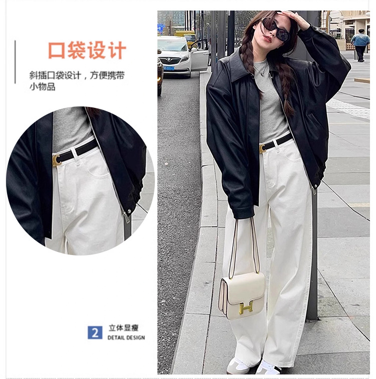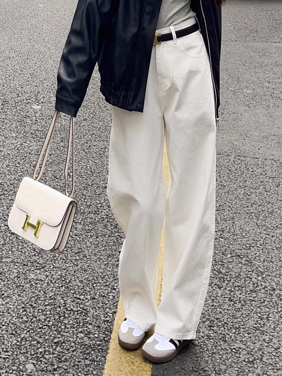 화이트 하이웨이스트 스트레이트 데님 팬츠 여성용 플리스 안감 2025 가을 겨울 신상 루즈핏 슬림 와이드 레그 롱 팬츠스토어 가기