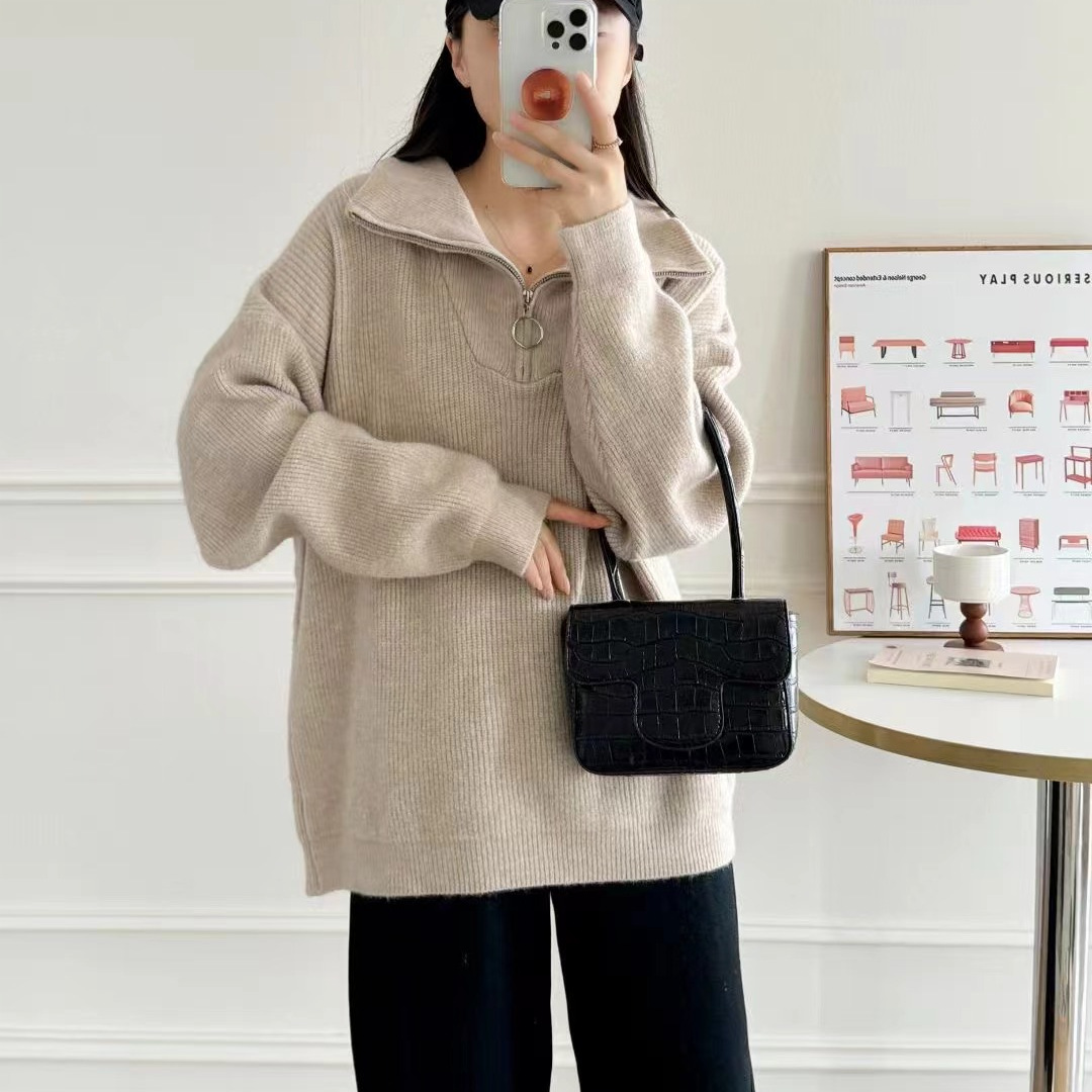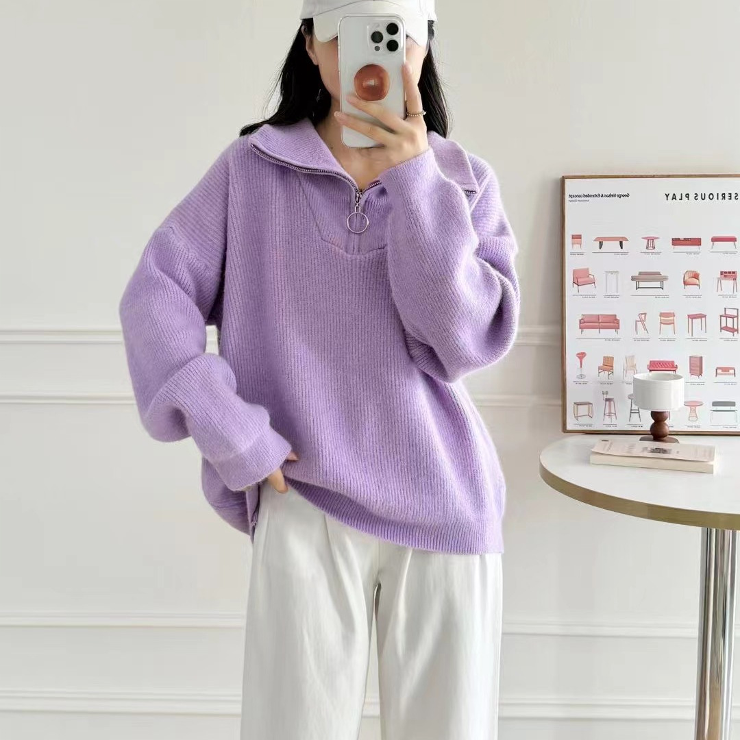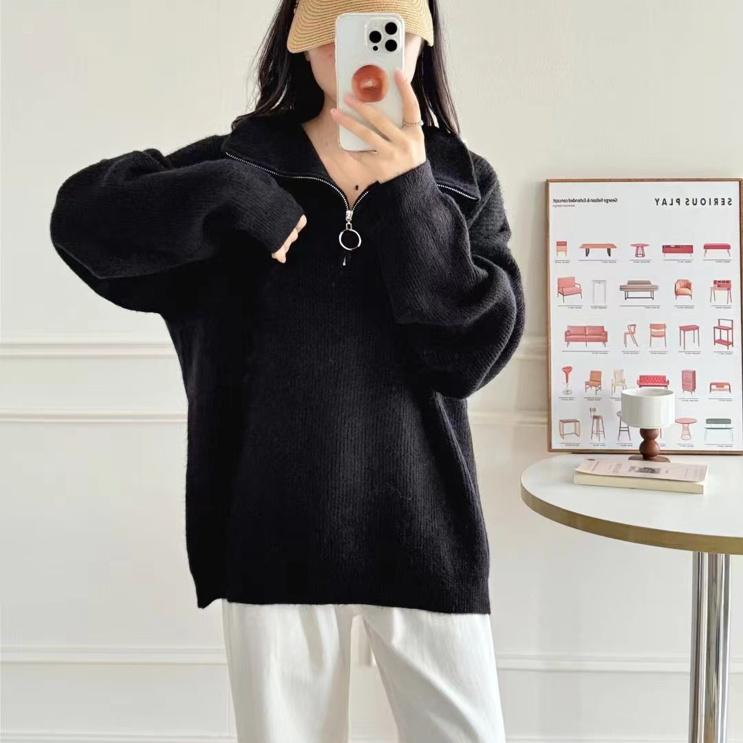 2024 년 가을과 겨울 새로운 패션 지퍼 랩오버 칼라 니트 스웨터 느슨한 간단한 게으른 스타일 외신베이스 셔츠 스웨터스토어 가기