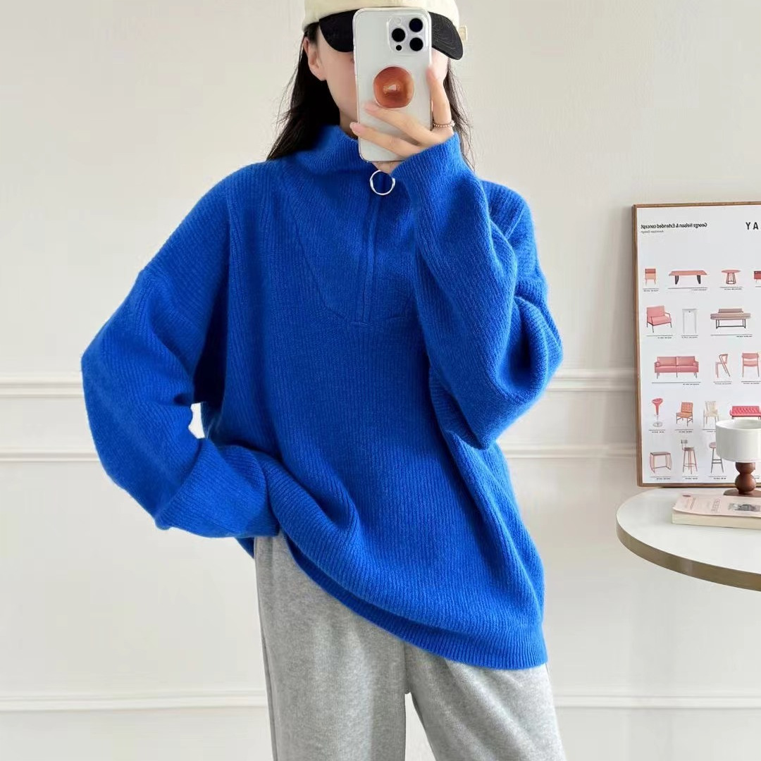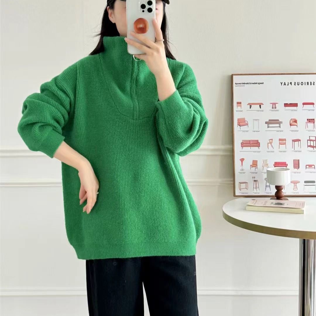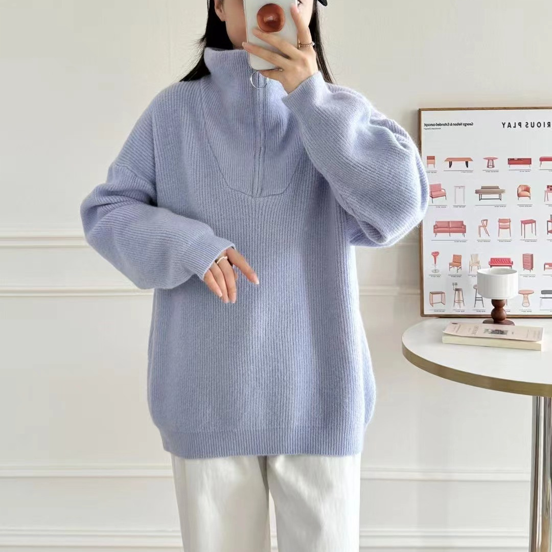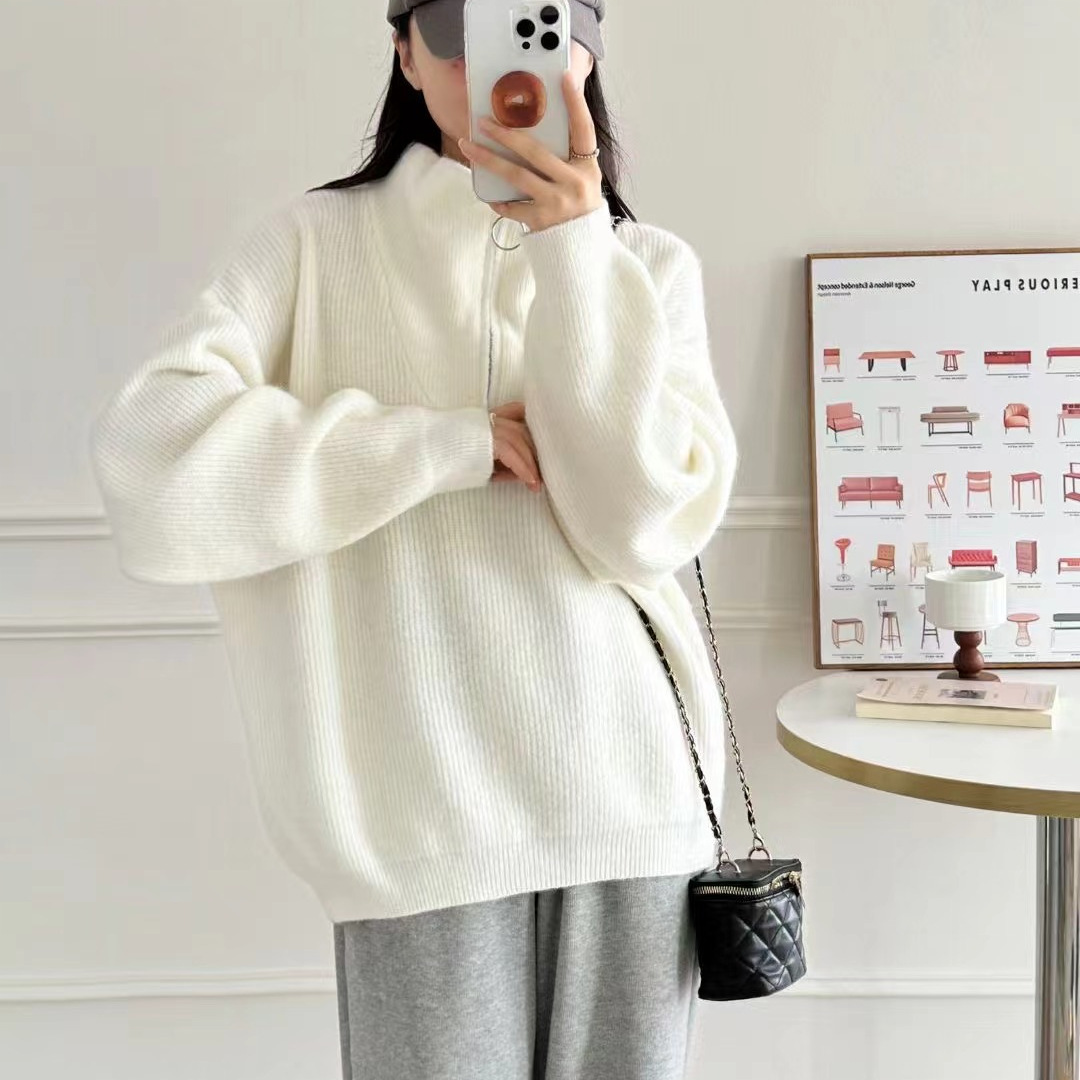 2024 년 가을과 겨울 새로운 패션 지퍼 랩오버 칼라 니트 스웨터 느슨한 간단한 게으른 스타일 외신베이스 셔츠 스웨터스토어 가기