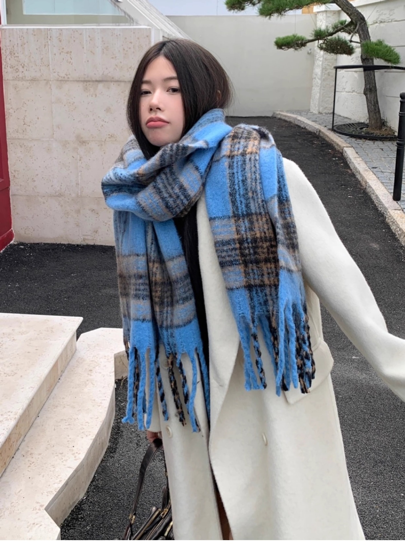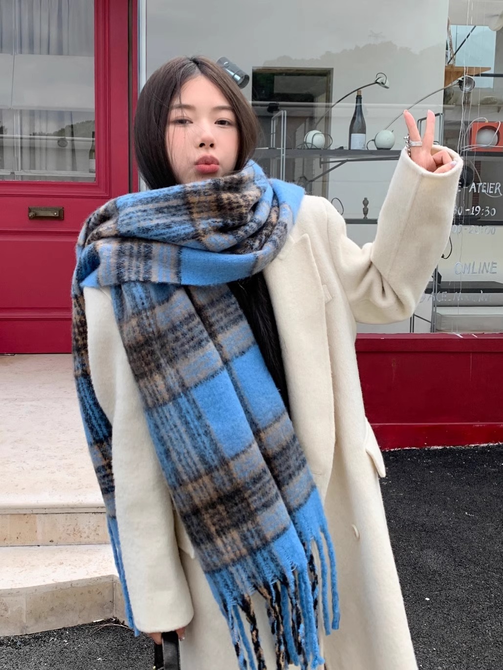 모조 캐시미어 한국식 체크 무늬 스카프 여성의 겨울 2024 새로운 하이 엔드 느낌 두꺼운 따뜻한 스카프 숄리 이중 목적 블루스토어 가기