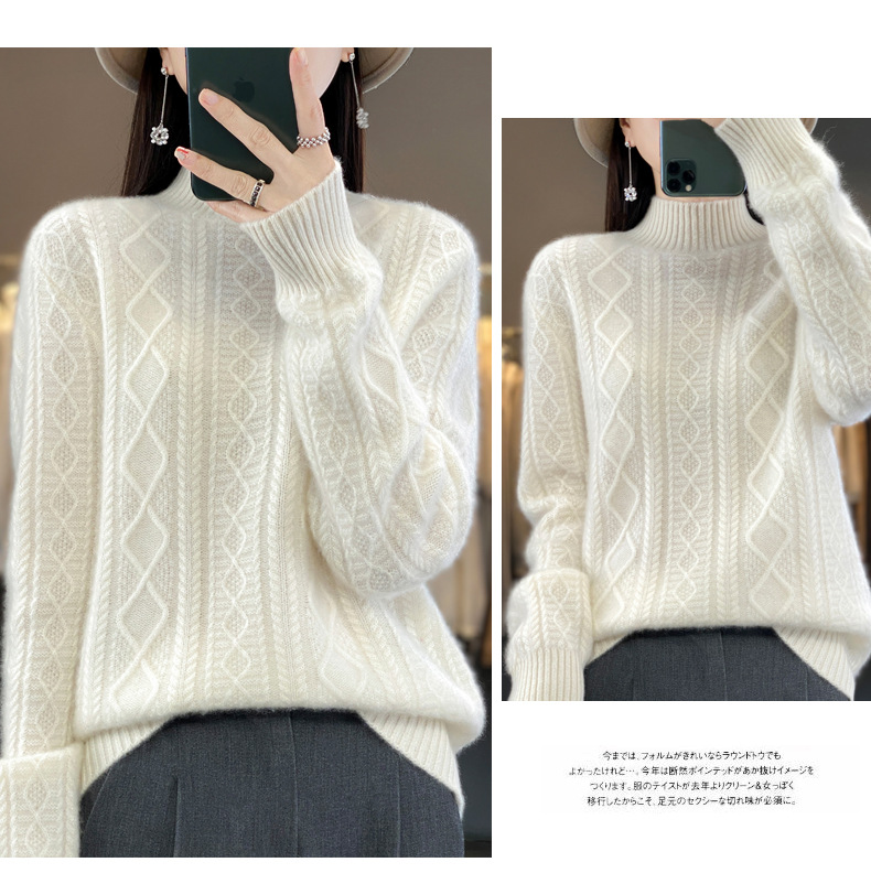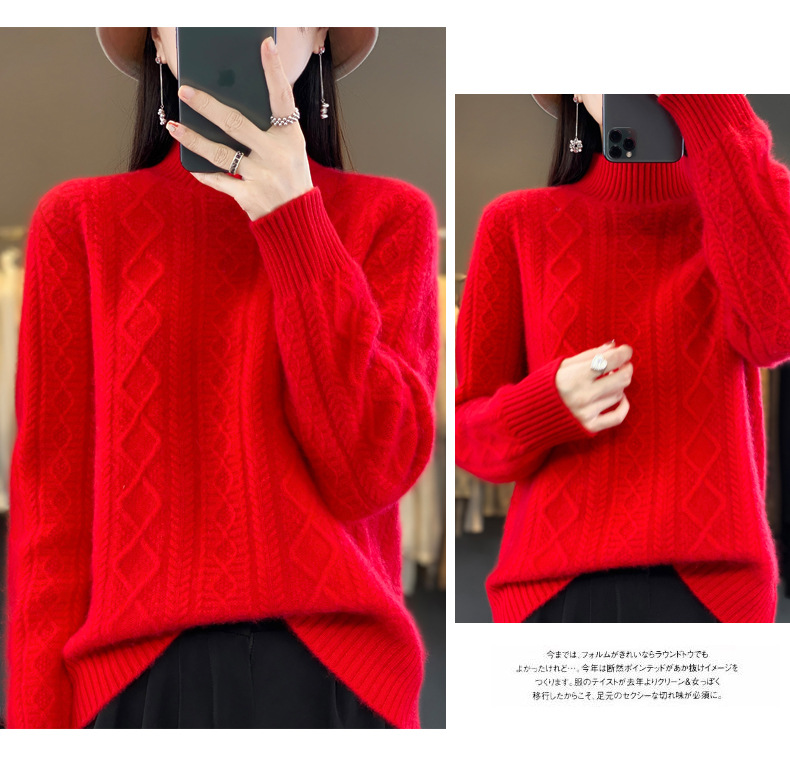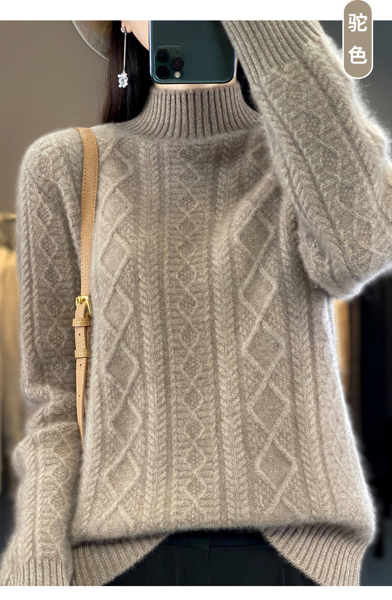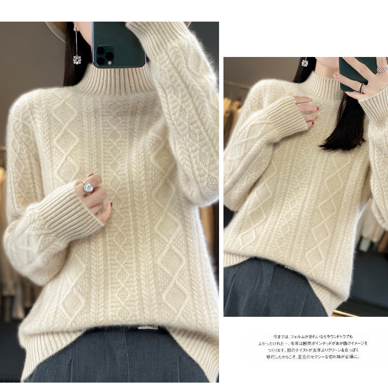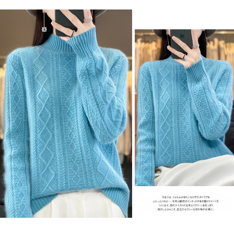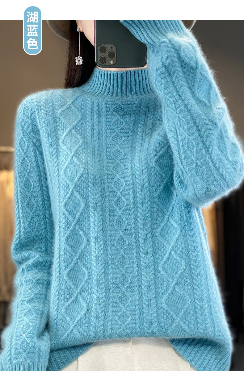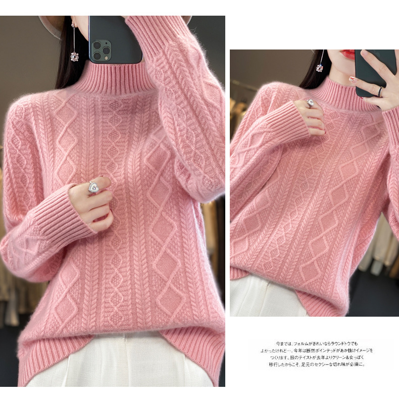 가을과 겨울 새로운 1 차 의류 하프 터틀넥 스웨터 여성용 다이아몬드 트위스트 느슨한 두꺼운 따뜻한 니트 베이스 셔츠 배치