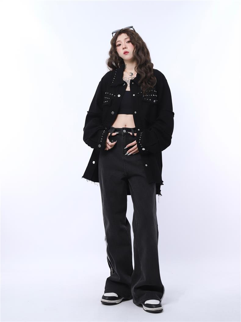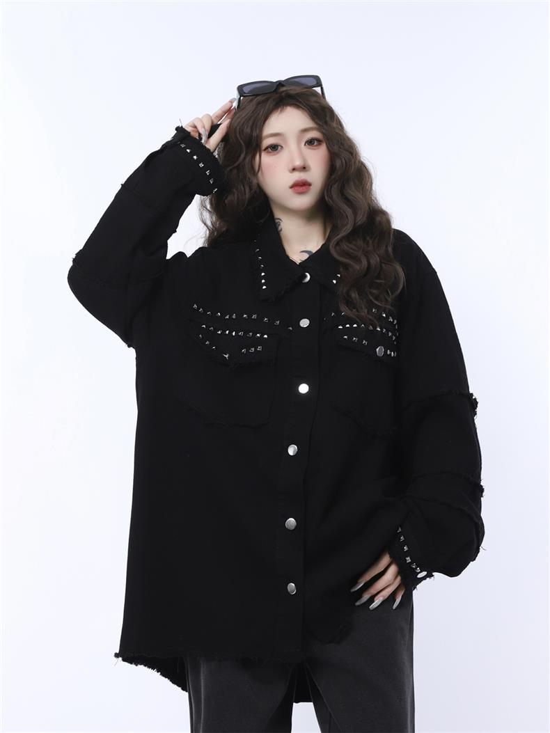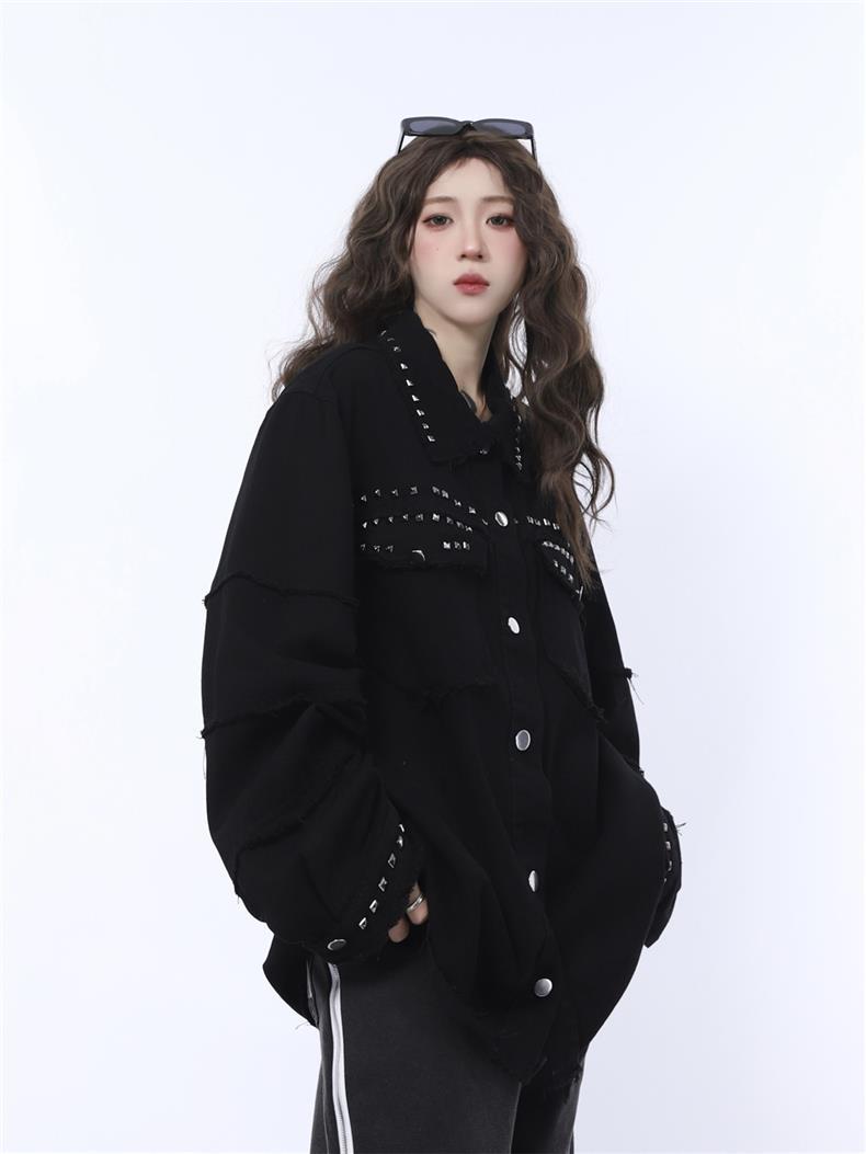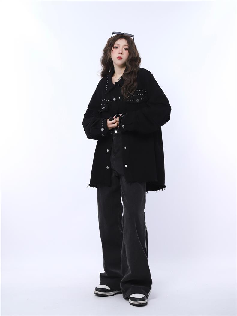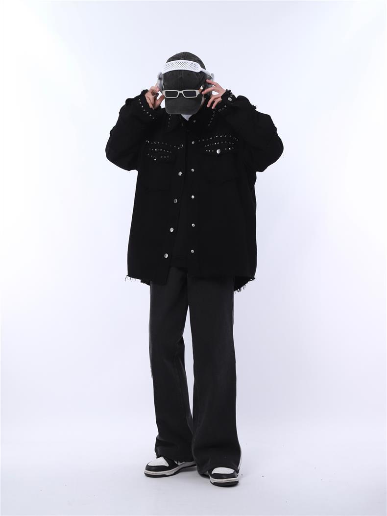가을 새로운 금속 네일 거친 검은 데님 재킷 남성 트렌드 느슨한 펑크 재킷 머리카락 세대스토어 가기