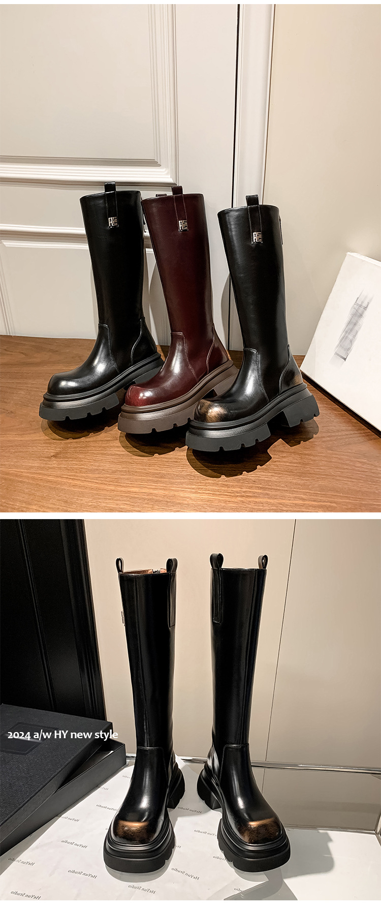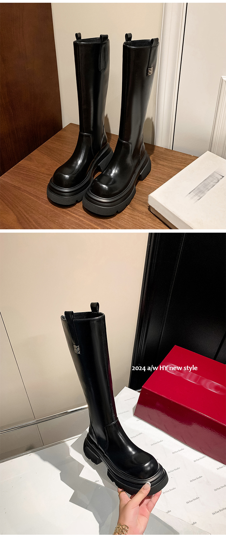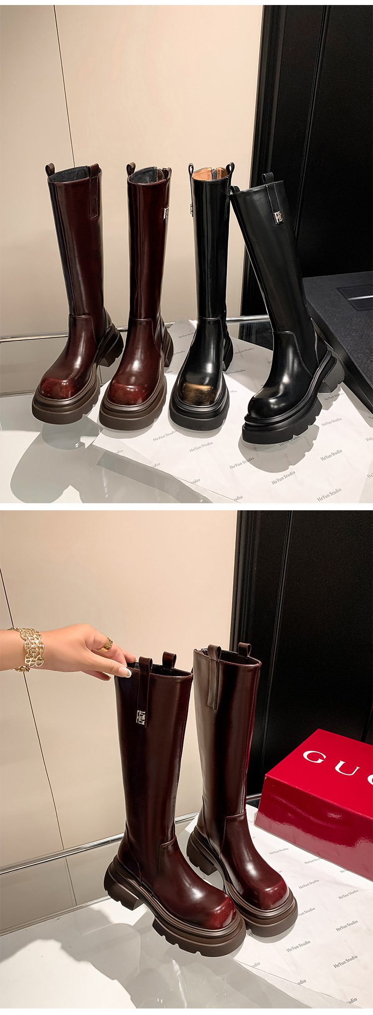 작은 두꺼운 바닥 무릎 높은 부츠 여성 정품 가죽 레트로 다크 브라운 부츠 영국 스타일 라운드 발가락 올매치 나이트 부츠스토어 가기