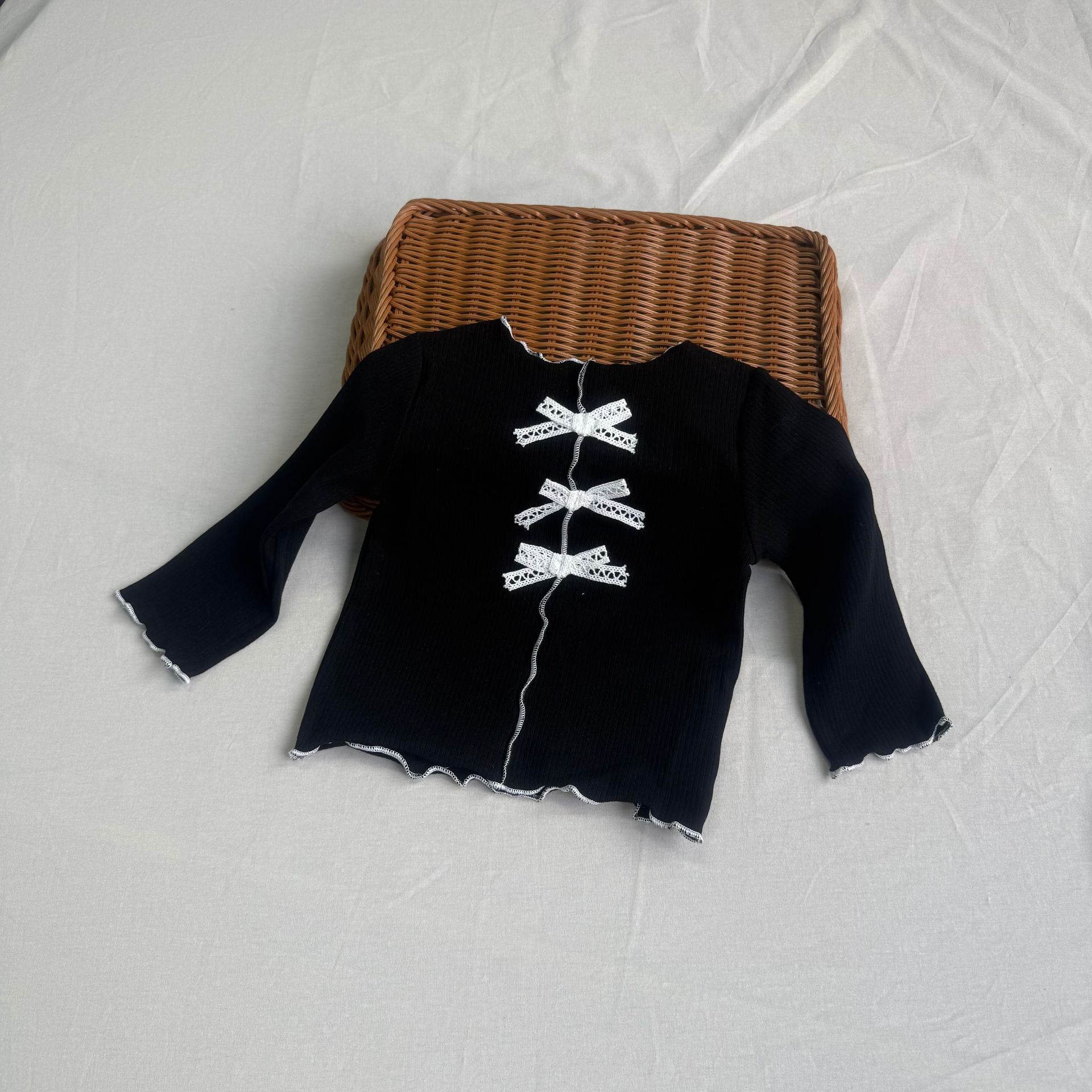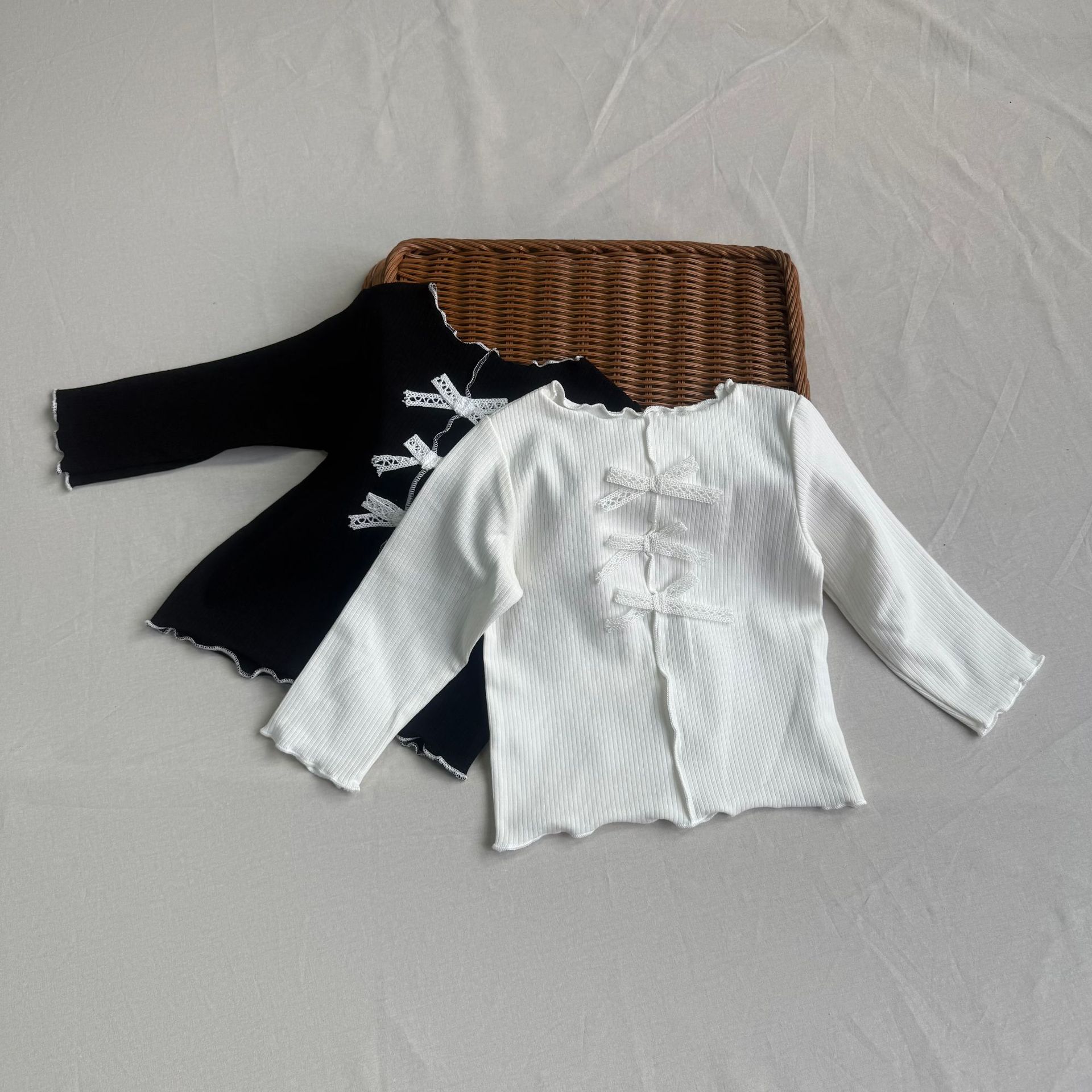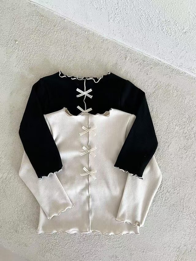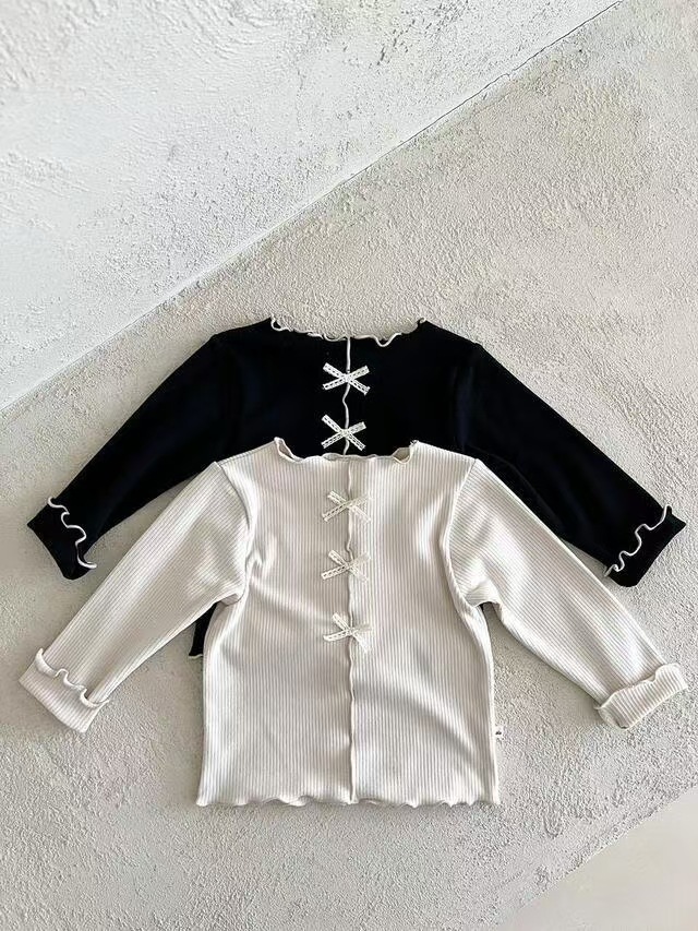 25 봄 가을 한국 스타일 아동 티셔츠 인스 북유럽 스타일 골지 긴팔 이너웨어 리본 아동 긴팔 상의