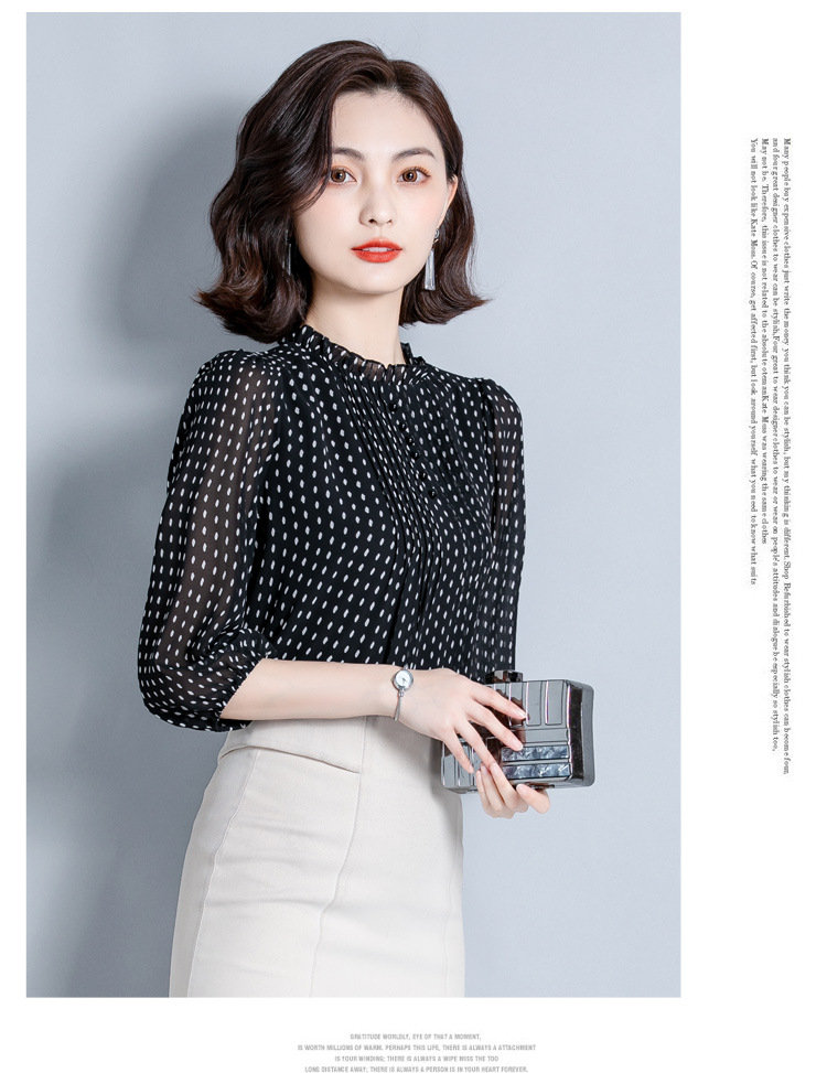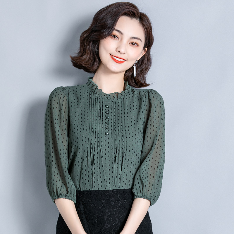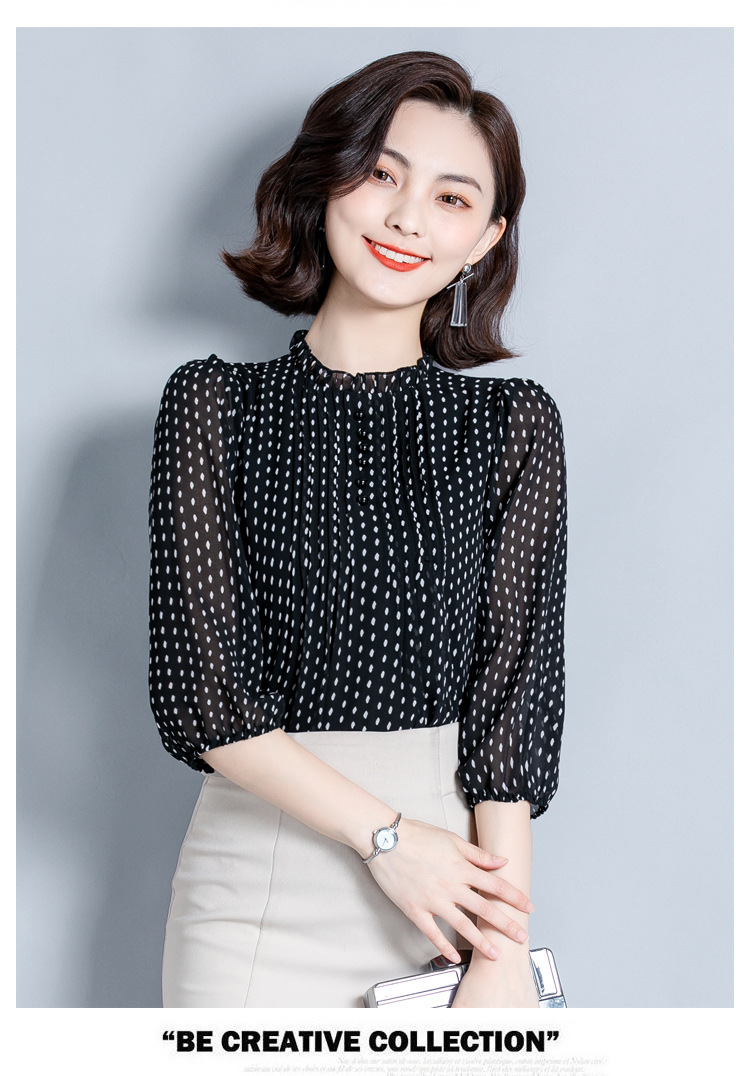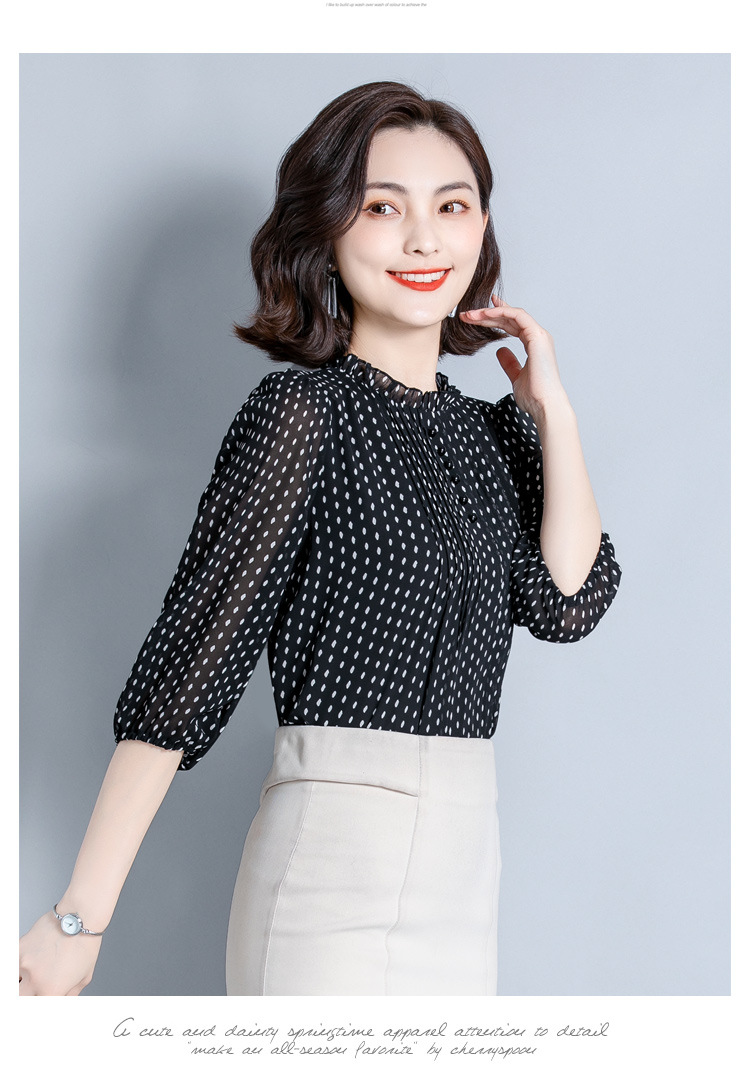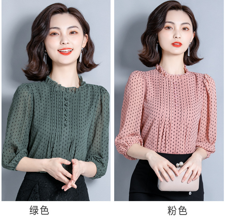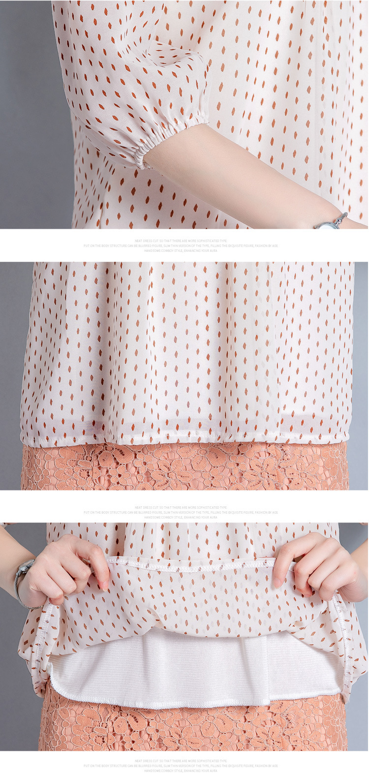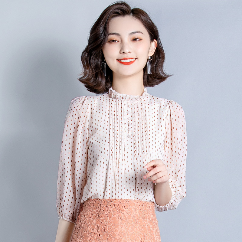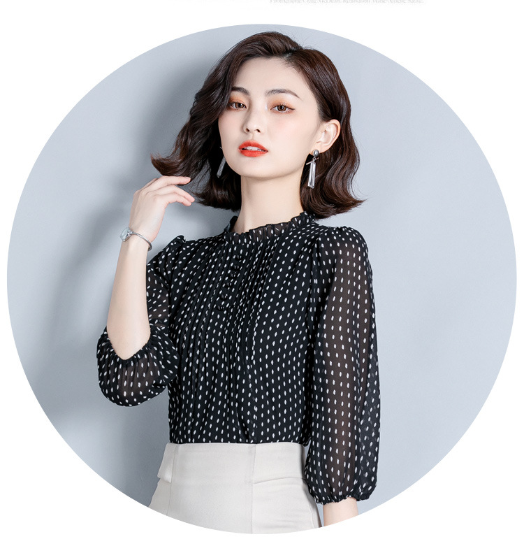 국경 간 쉬폰 셔츠 여름 새로운 도착 플러스 사이즈 쉬폰 셔츠 우아한 귀 가장자리 웨이브 닷 중간 슬리브 탑 웨스턴 스타일 작은 셔츠