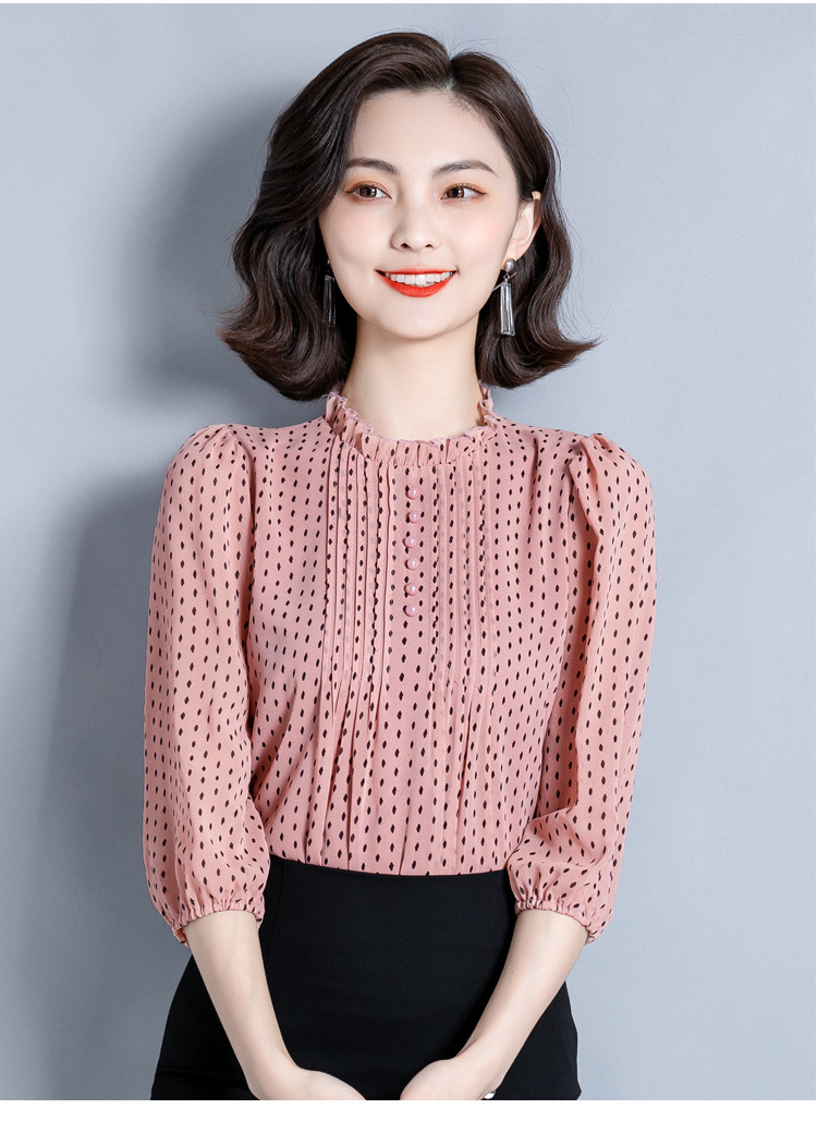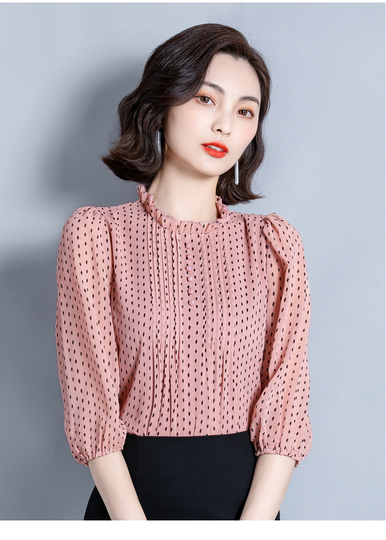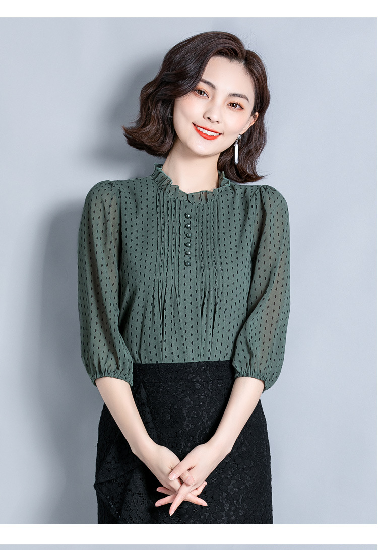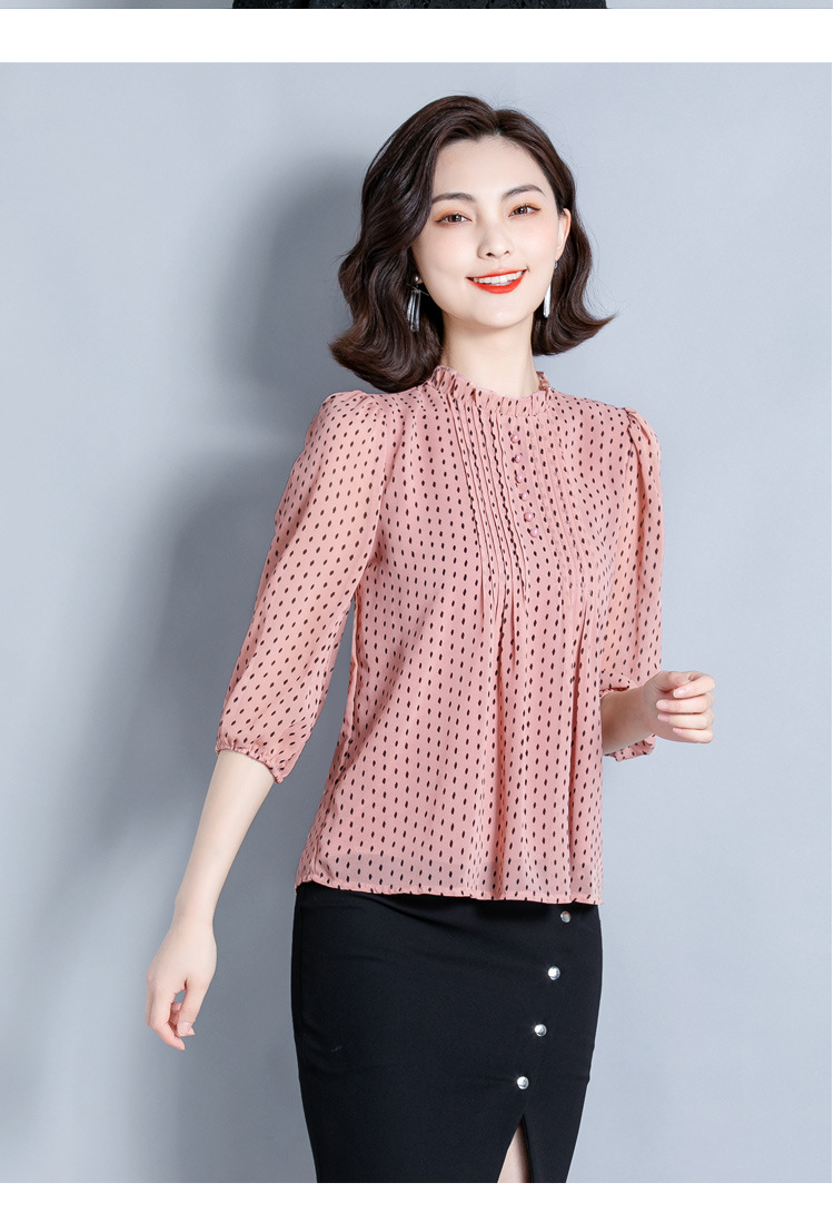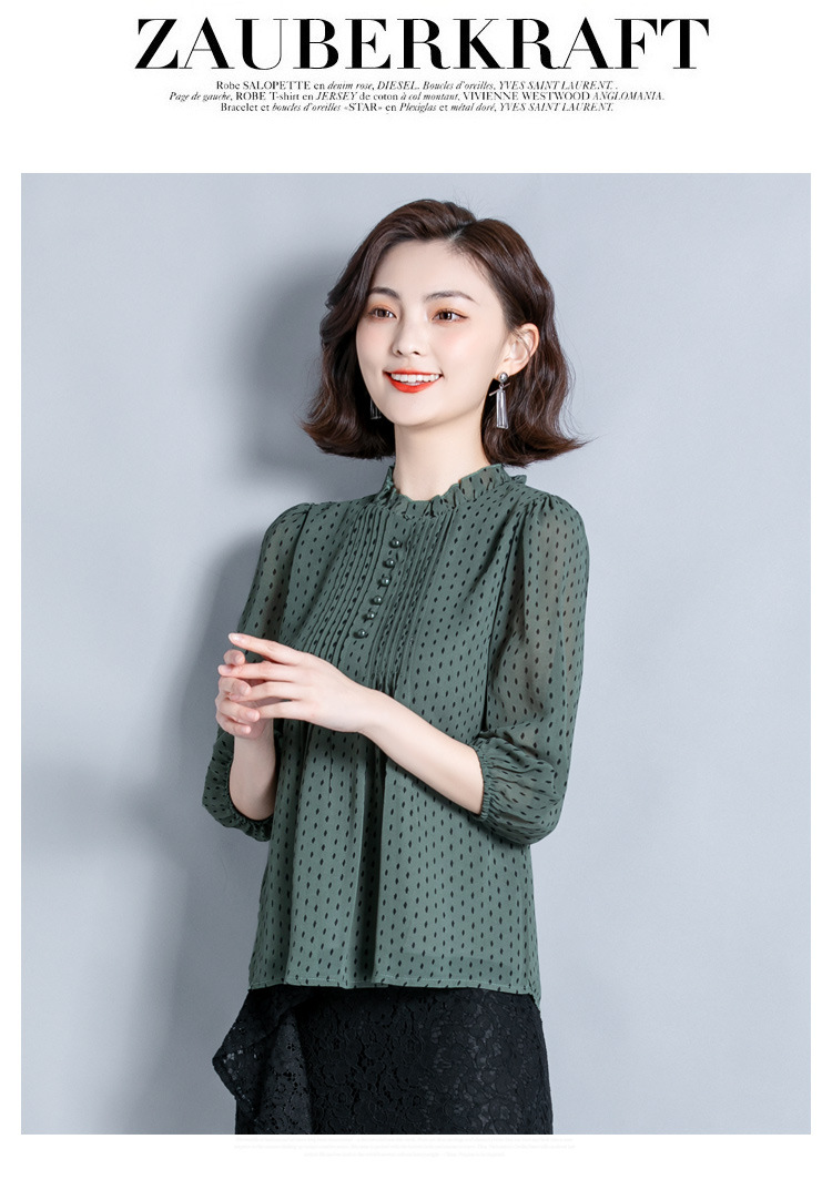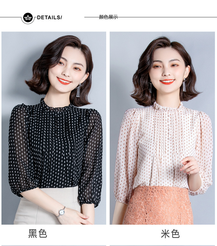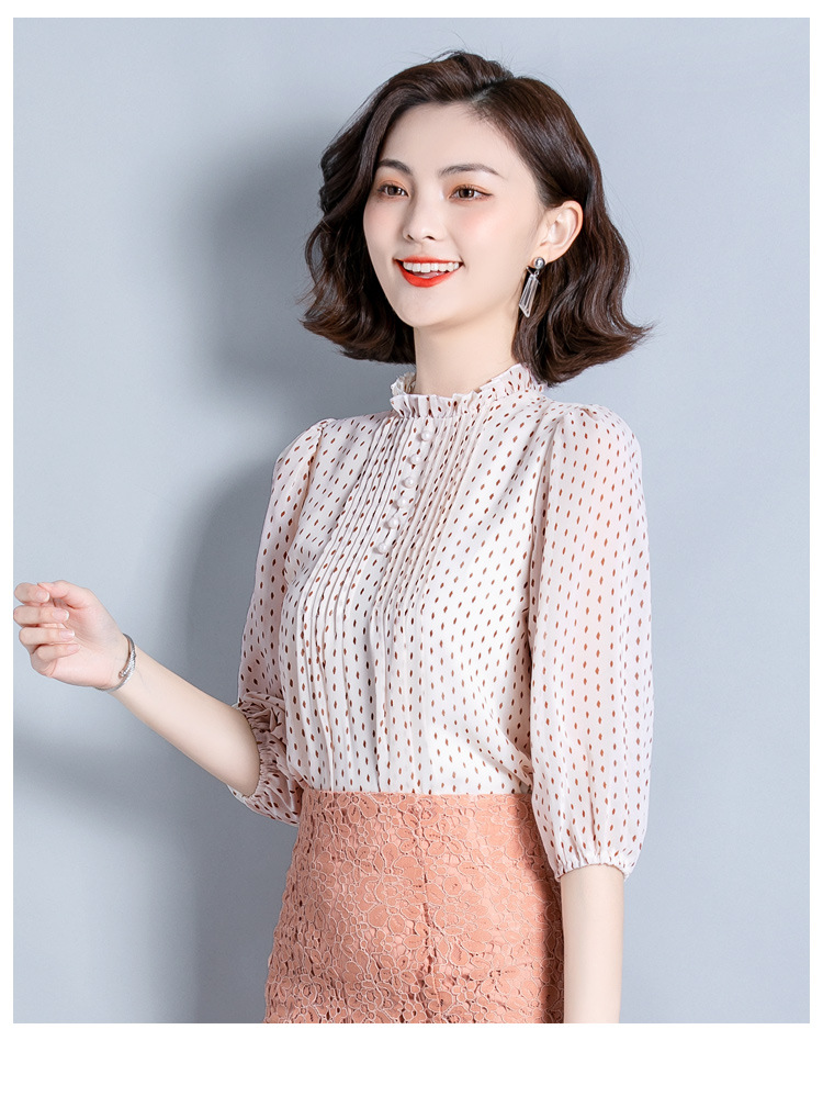 국경 간 쉬폰 셔츠 여름 새로운 도착 플러스 사이즈 쉬폰 셔츠 우아한 귀 가장자리 웨이브 닷 중간 슬리브 탑 웨스턴 스타일 작은 셔츠