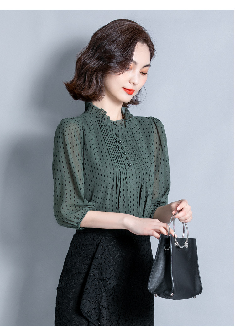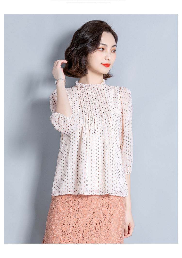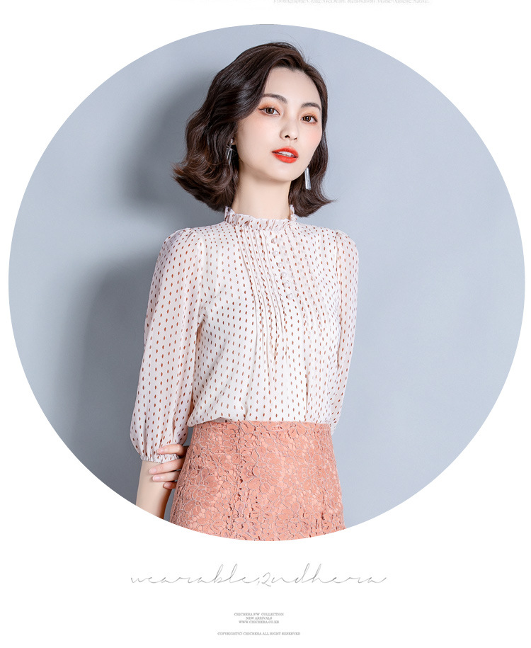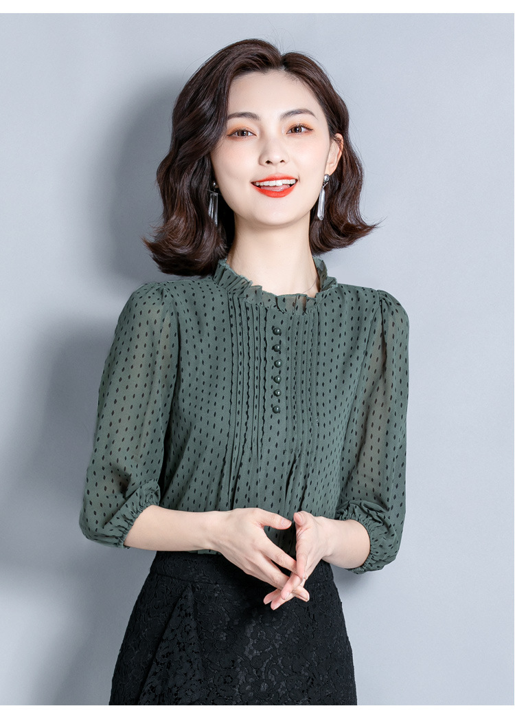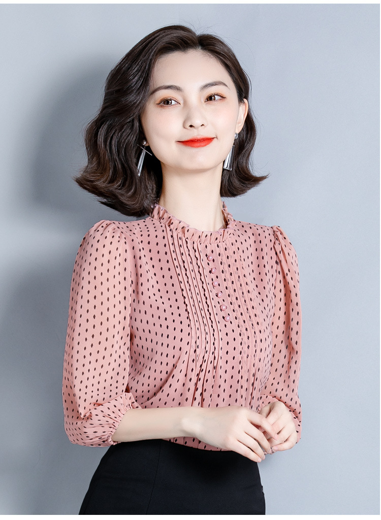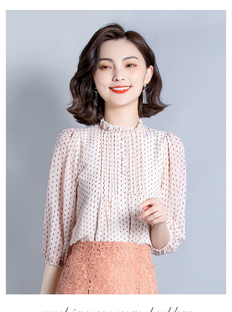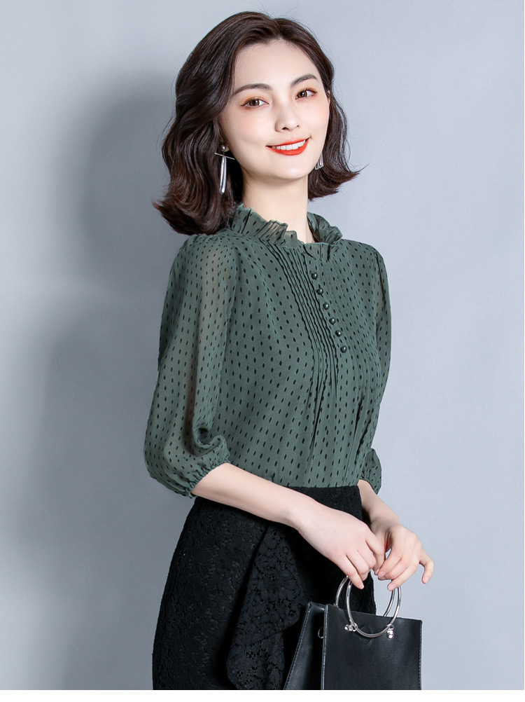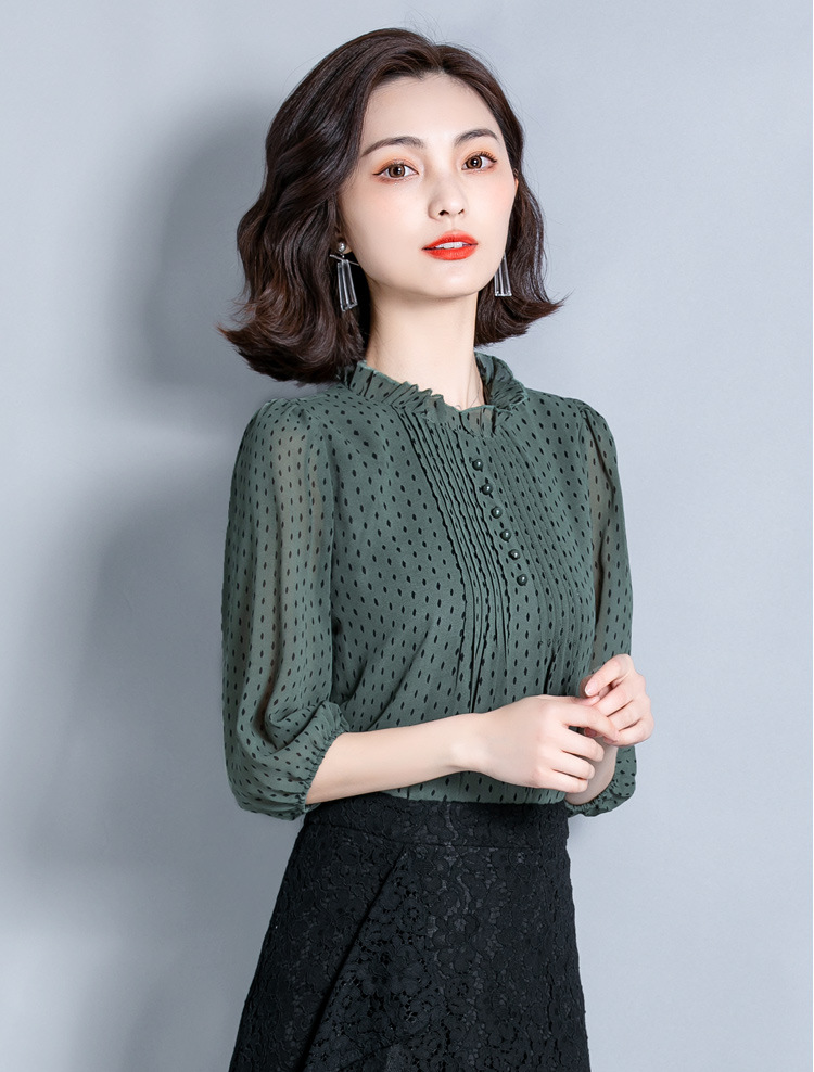 국경 간 쉬폰 셔츠 여름 새로운 도착 플러스 사이즈 쉬폰 셔츠 우아한 귀 가장자리 웨이브 닷 중간 슬리브 탑 웨스턴 스타일 작은 셔츠