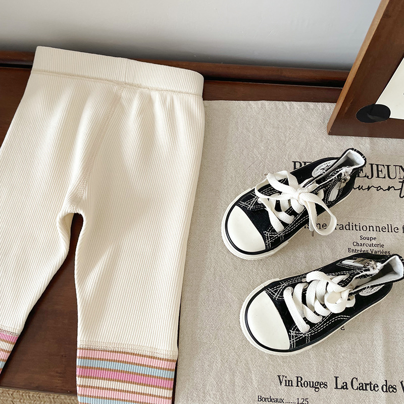 打底裤:93.5%粘胶纤维6.5%氨纶 拼料彩条:95%棉5%氨纶