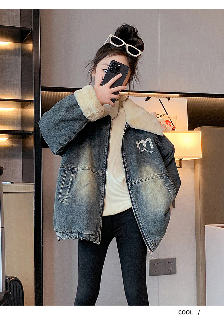 소녀의 가을 겨울 옷 기모 두껍게 데님 파크수트 어린이 2024 새로운 중대형 어린이 따뜻한 데님 코트스토어 가기