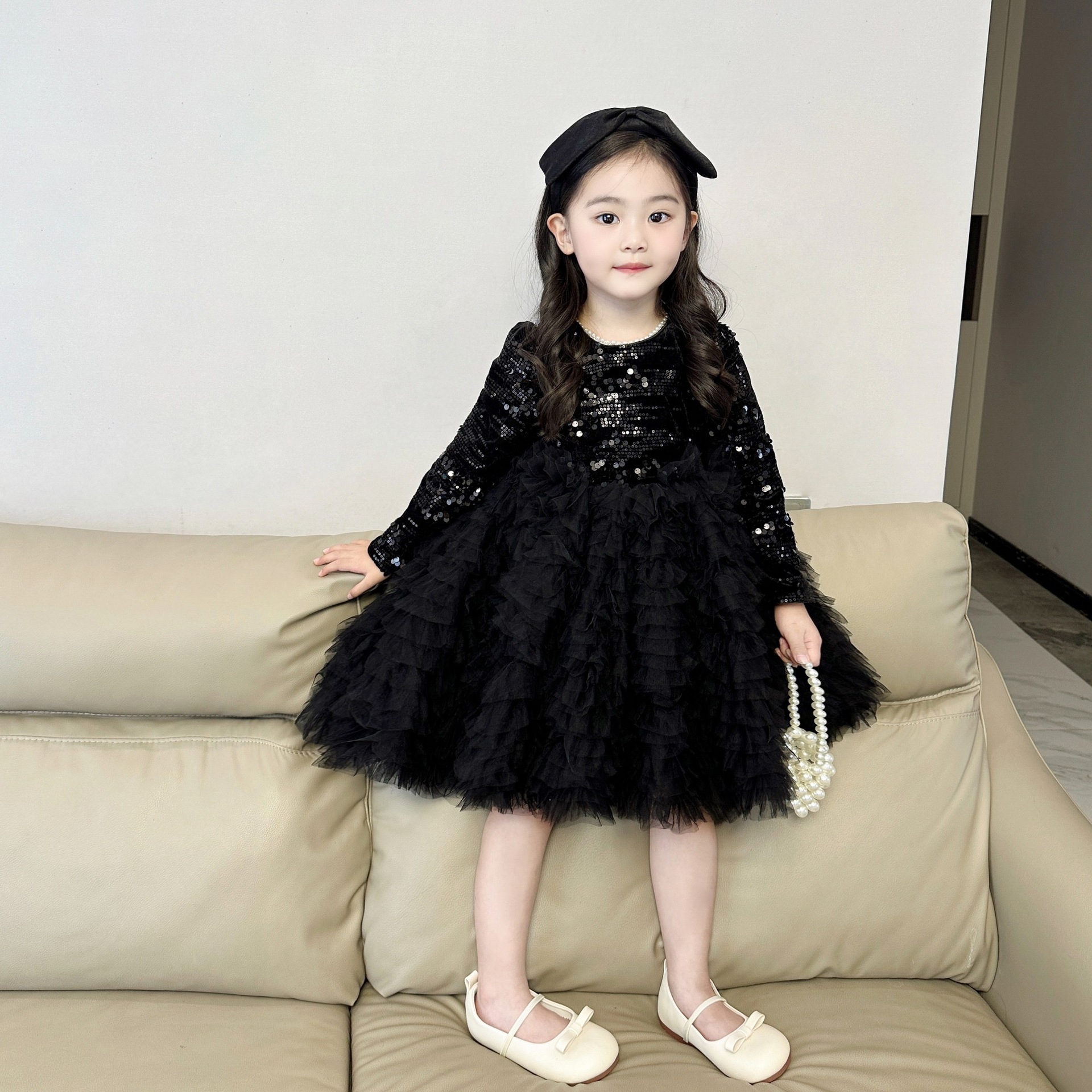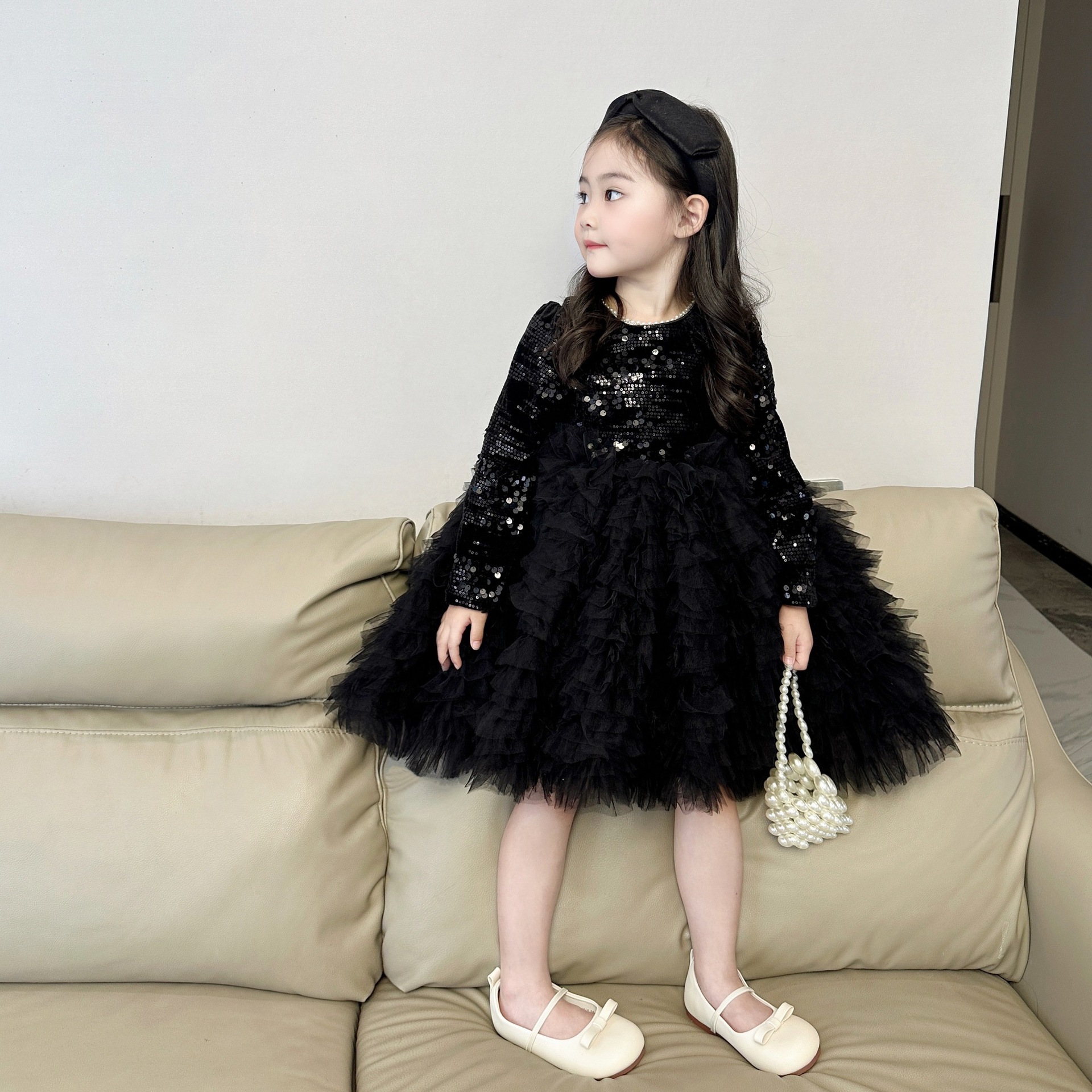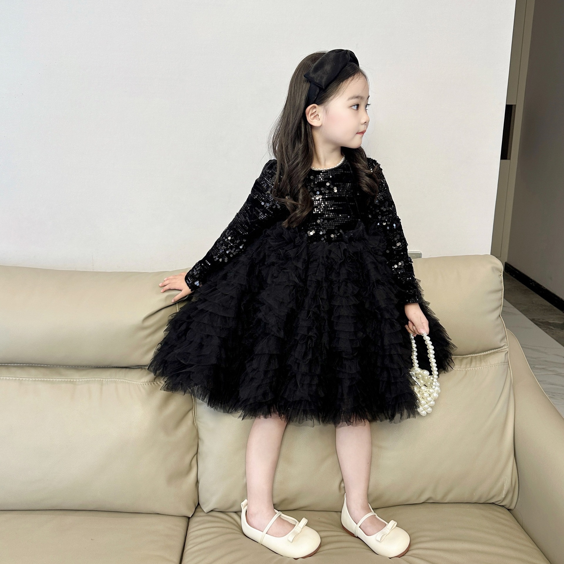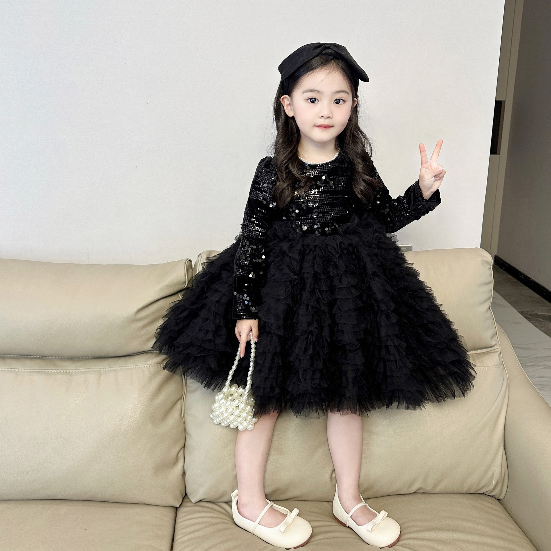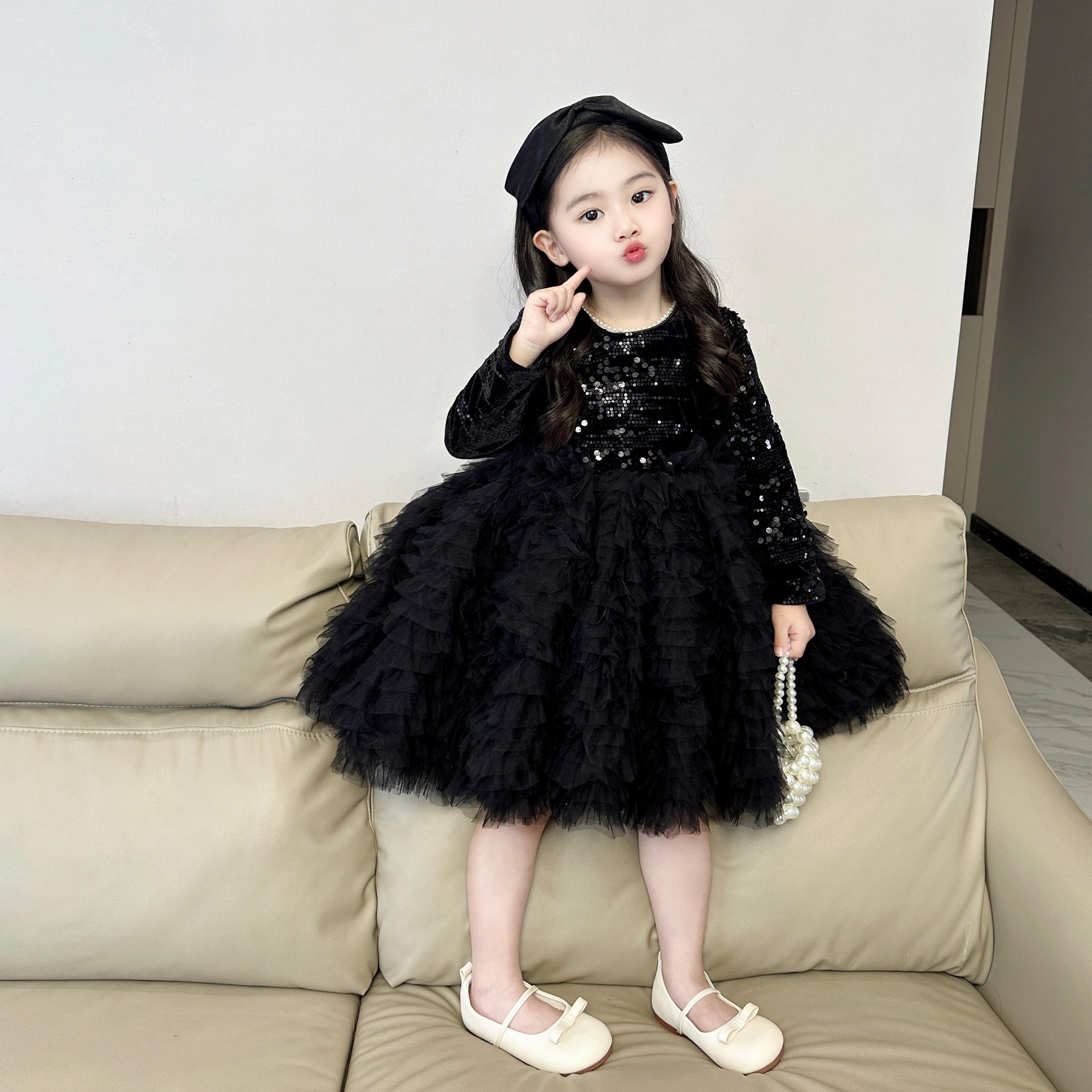 2024 가을 새 소녀 헵번 공주 스커트 작은 검은 치마 소녀 소녀 검은 색 원피스 케이크 치마스토어 가기