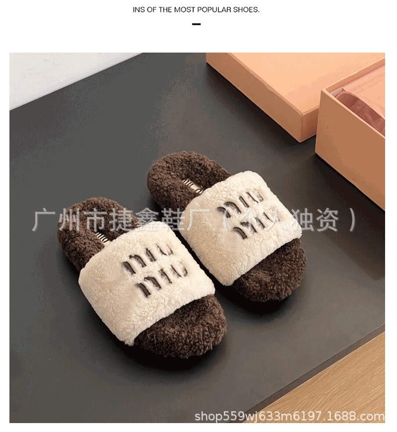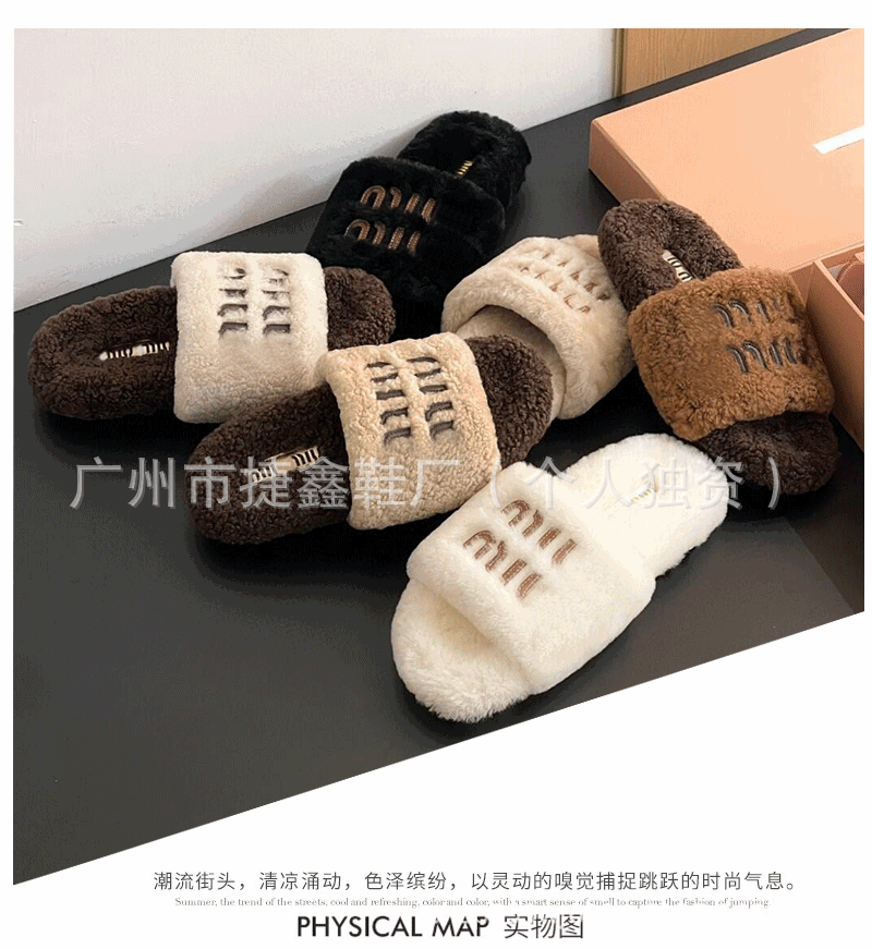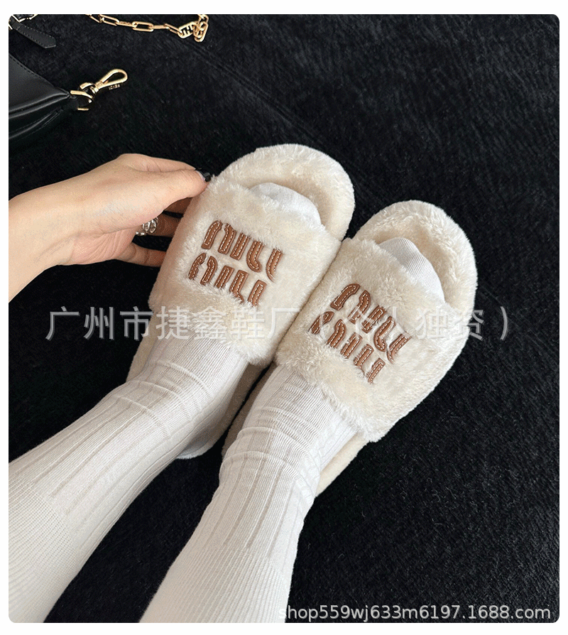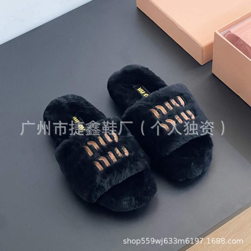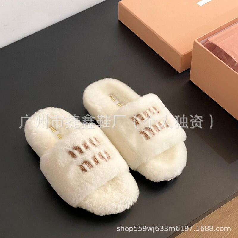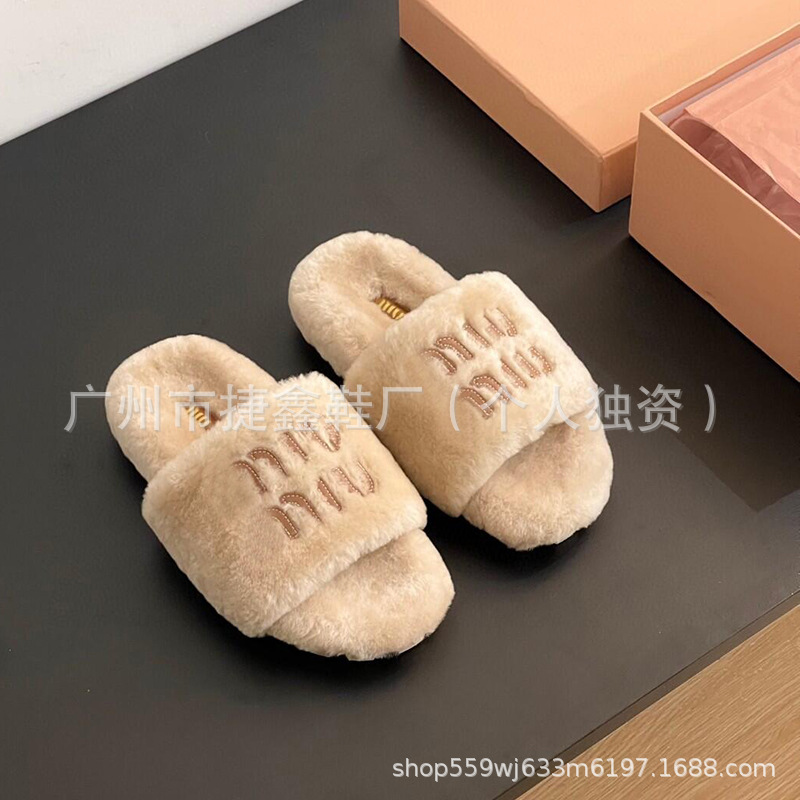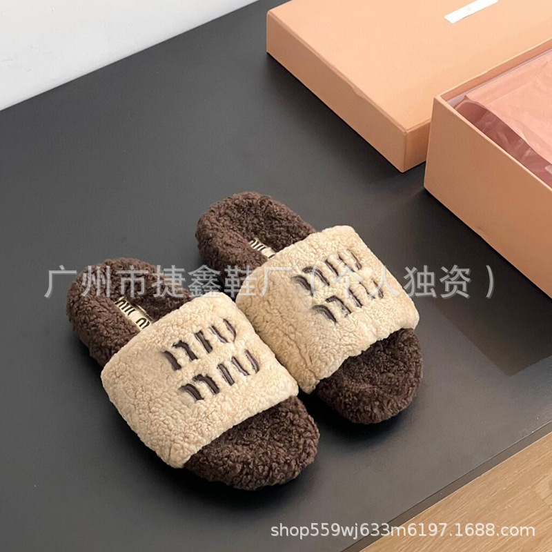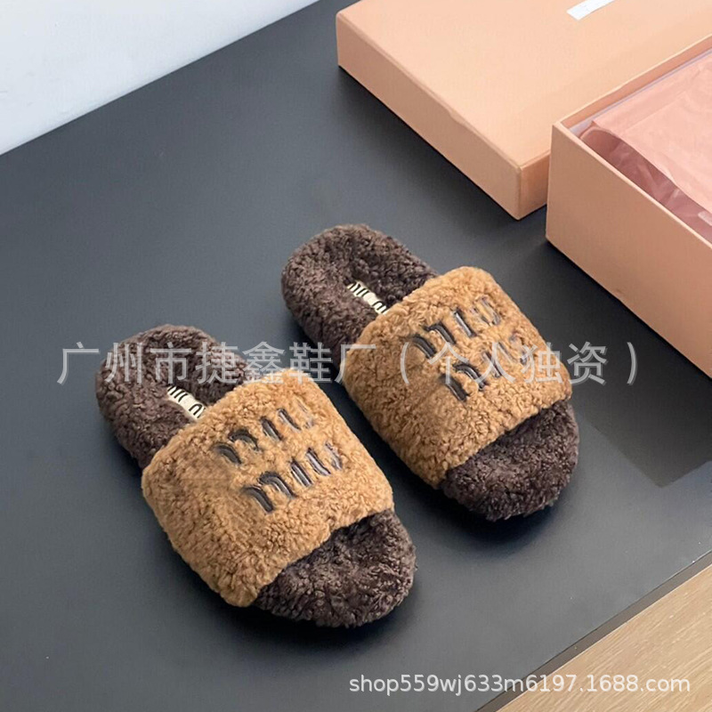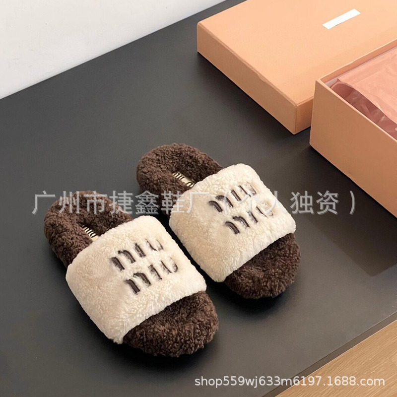 Miu 홈 푹신한 슬리퍼 2024 가을과 겨울 새 착용 미끄럼 방지 슬리퍼 여성용 울 따뜻한 면화 슬리퍼