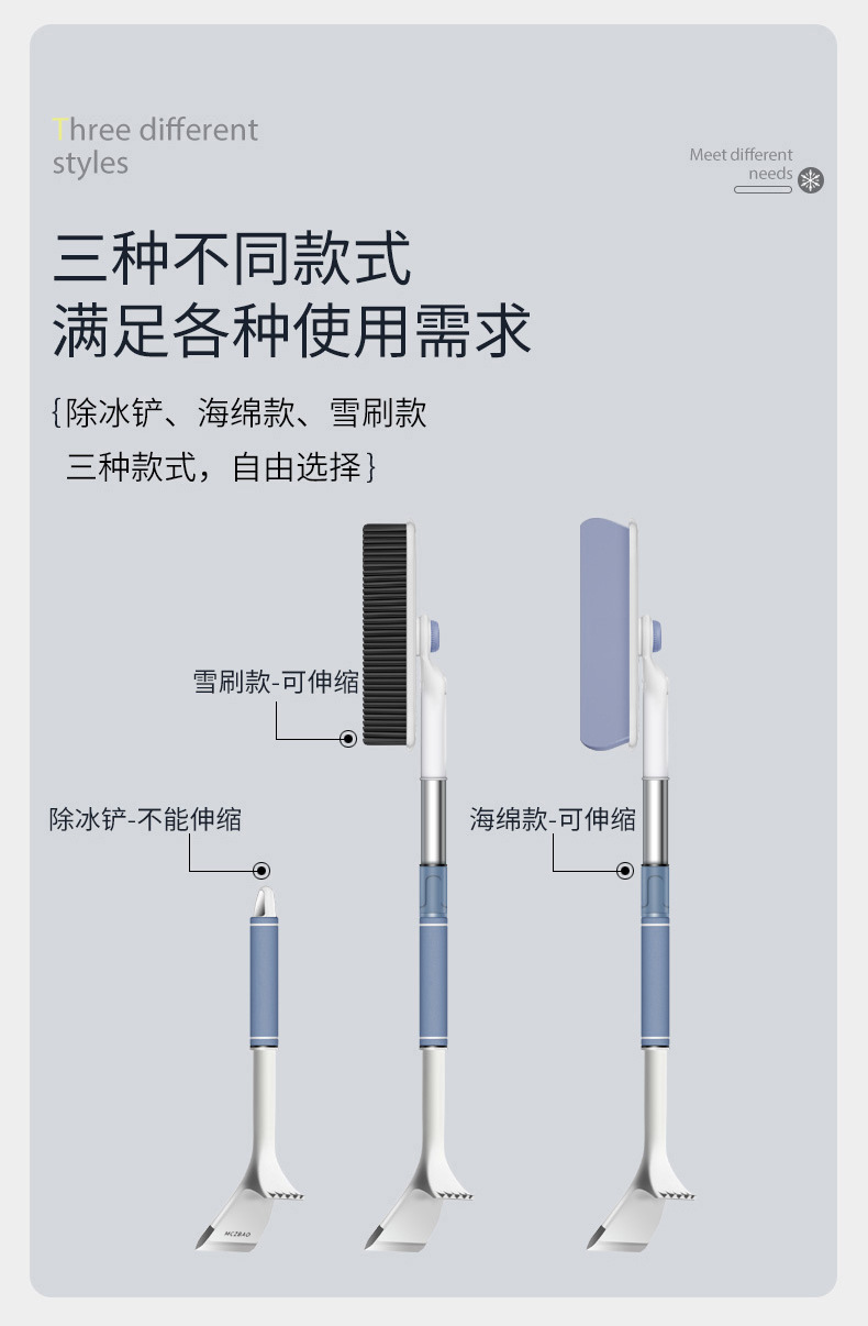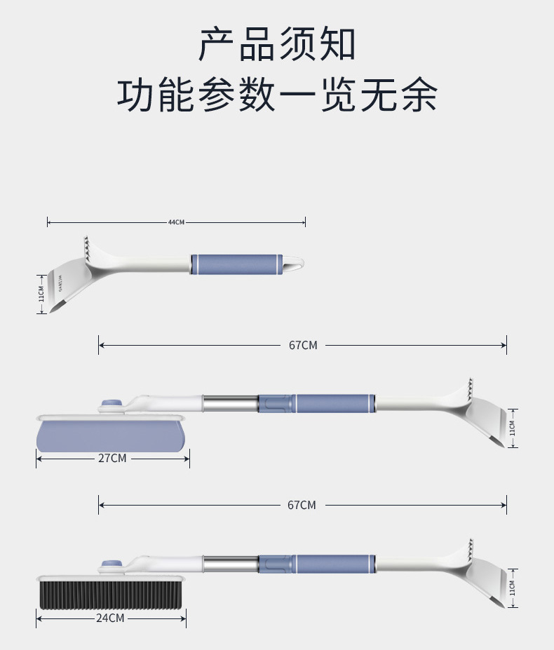【产品尺寸】: 4328除冰铲约11*44cm,4329雪刷款约11*24*77cm,伸缩尺寸:11*24*93cm,4330海绵款约11*27*78cm,伸缩尺寸:11*27*94cm,4331约10*24*60cm