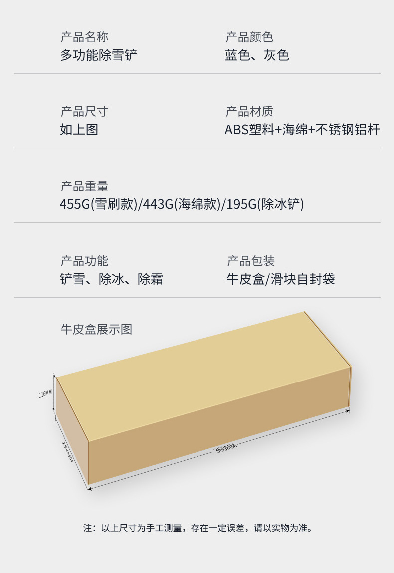 【产品毛重】:约195G(4328除冰铲)/约455G(4329雪刷款)/约443G(4330海绵款)/约324G(4331不可伸缩除雪铲)